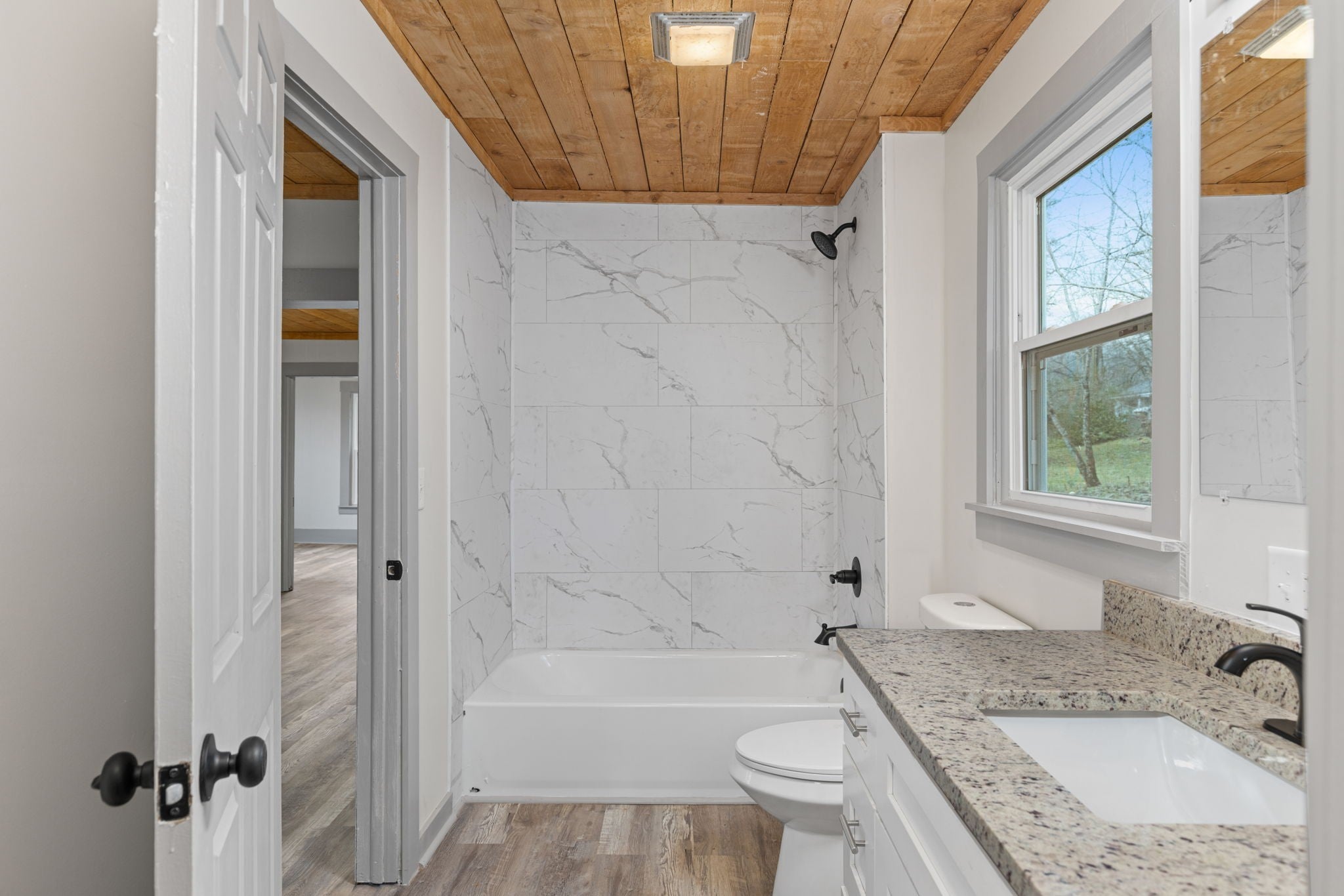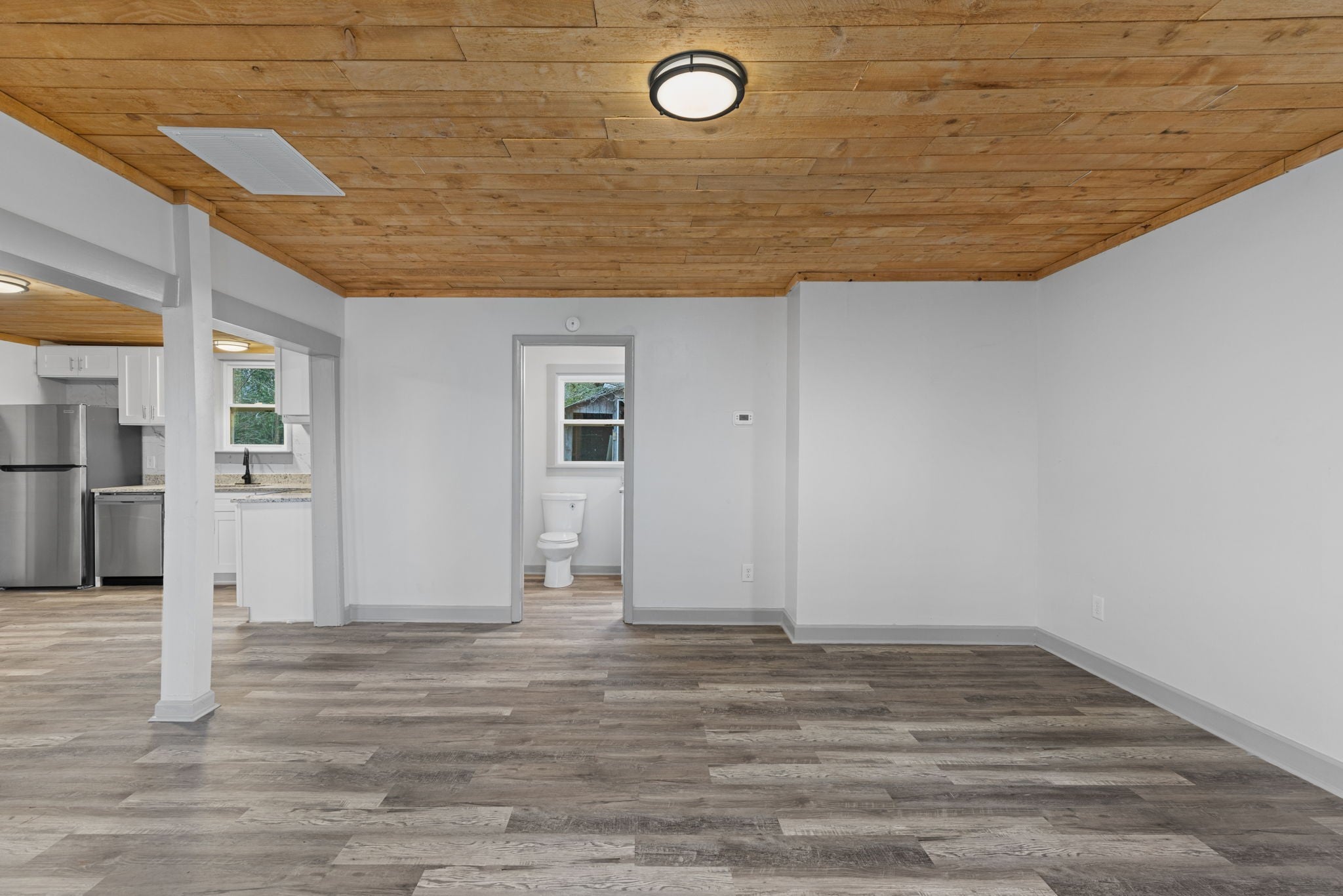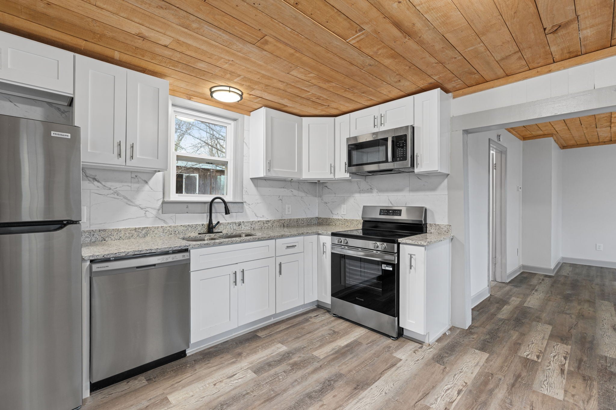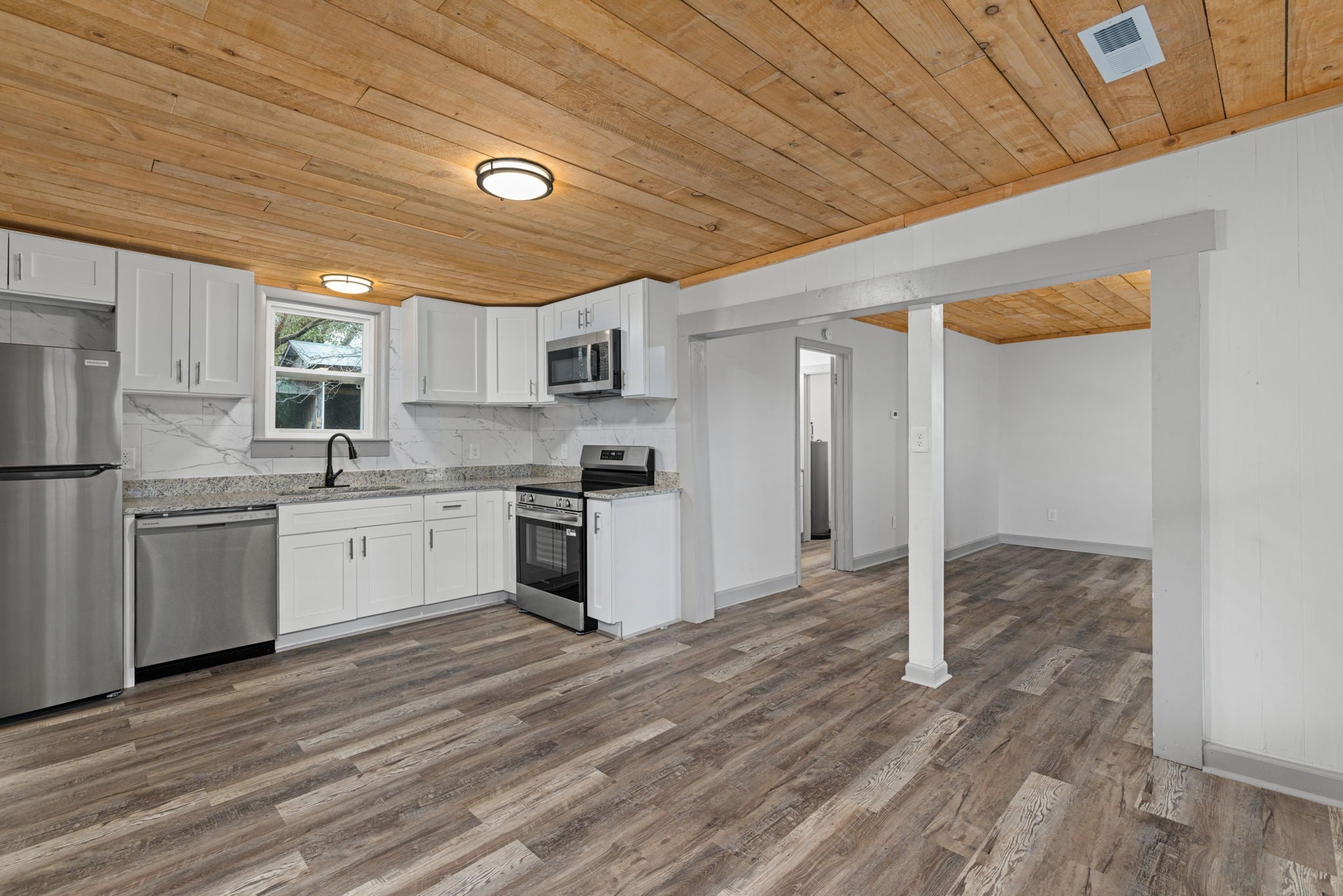 First month free with a 13-month lease! Discover comfort and convenience in this beautifully renovated 2-bed, 1-bath home located just minutes from Lawrenceburg’s Public Square. This spacious home welcomes you with an open living and dining layout that flows naturally into a fully updated kitchen featuring new cabinetry, granite countertops, stainless steel appliances, and modern tile backsplash. The warm wood ceilings add character and charm, creating a style that feels both cozy and contemporary. The home offers two generously sized bedrooms, each providing comfortable layouts and plenty of natural light. The fully remodeled bathroom showcases stunning tile surrounds, updated fixtures, and a new vanity for a clean, modern feel. A dedicated laundry area offers added convenience and functionality. Step outside to enjoy a large yard with room for outdoor seating, gardening, or simply relaxing in the open space. A rustic storage shed offers additional flexibility for tools, hobby space, or extra storage. The property sits on a quiet street with easy access to local shops, restaurants, schools, and major roads—making daily errands and commuting simple. Luxury vinyl plank flooring runs throughout the home, enhancing durability and style. With fresh paint, updated lighting, and thoughtful upgrades in every room, this home blends charm with modern living. Don’t miss this opportunity to rent a beautifully refreshed home with an incredible move-in incentive. Apply today and make 430 Stephens St your next address!