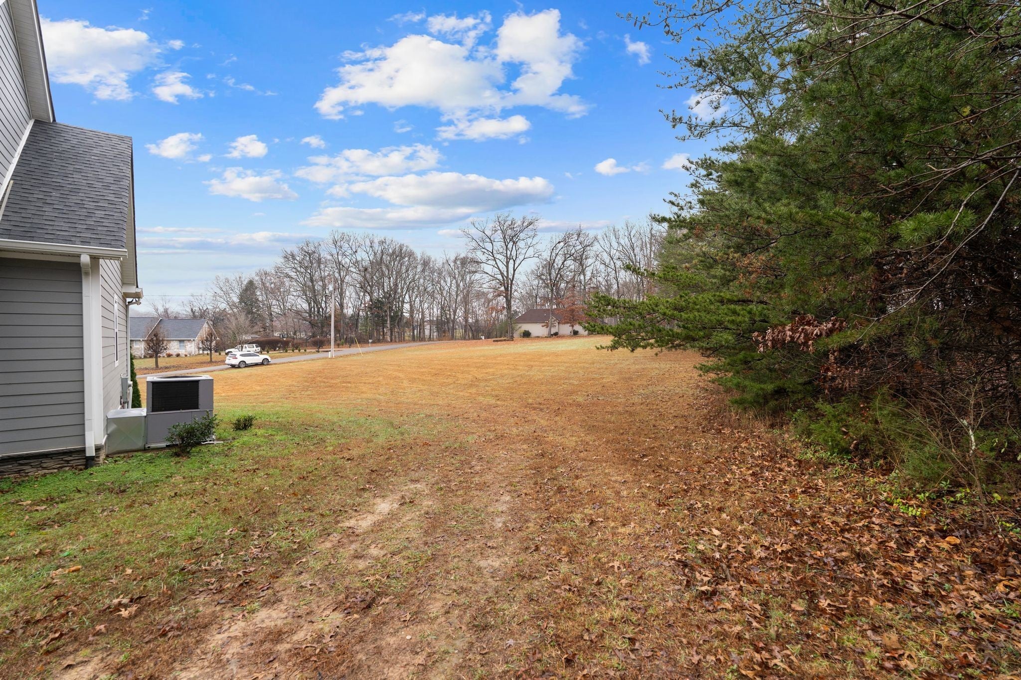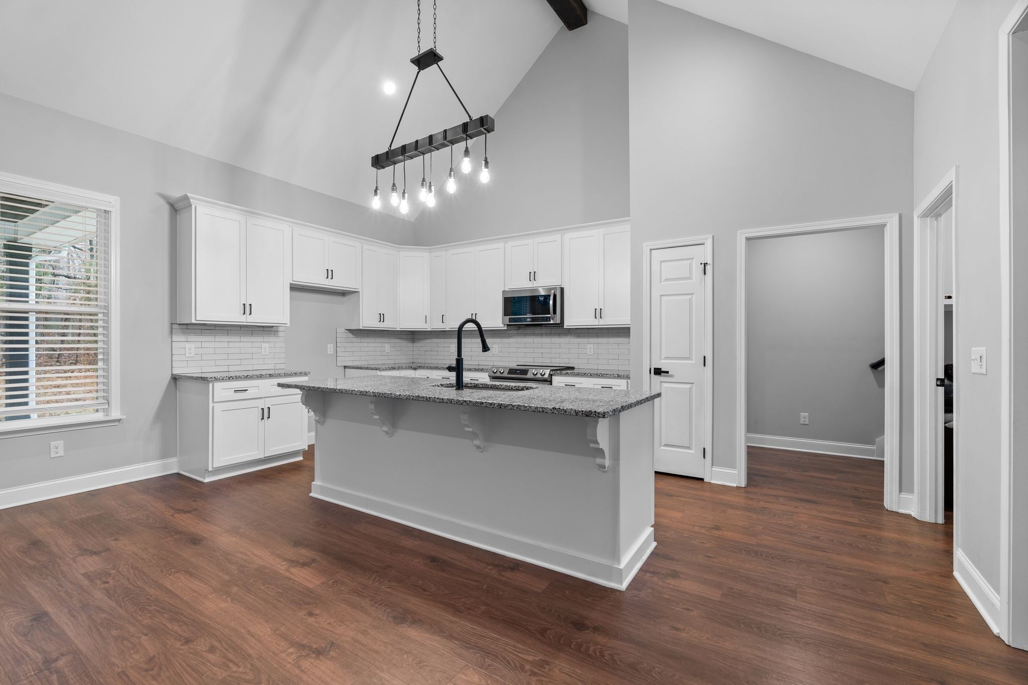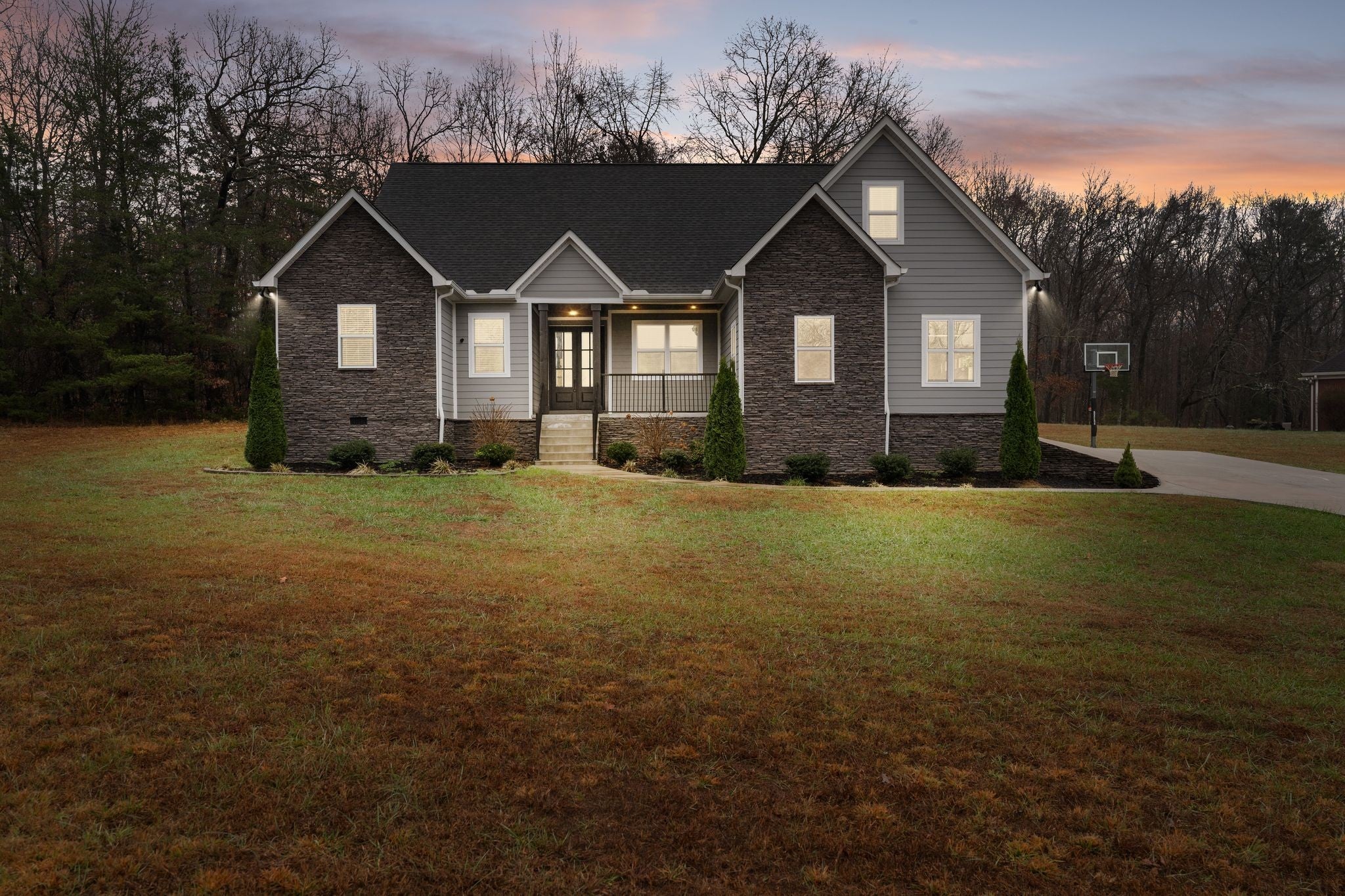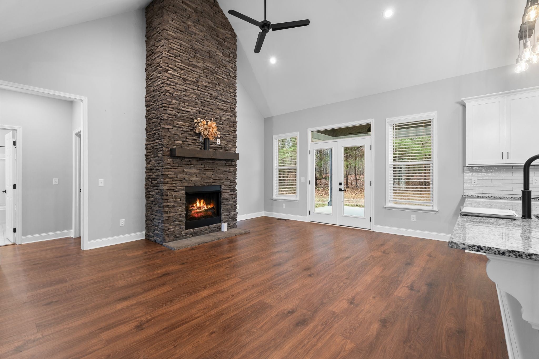 Welcome to a modern country retreat tucked away on a quiet 1.18-acre lot. This 2022-built home offers an inviting open floorplan with vaulted ceilings, a cozy fireplace, and great natural light throughout. The kitchen features a spacious island with room for seating. The primary suite offers a beautifully finished bath with double vanities. Relax on the covered back porch overlooking wooded views or enjoy the large yard with endless potential. A peaceful setting with quick access to town — the perfect place to call home.