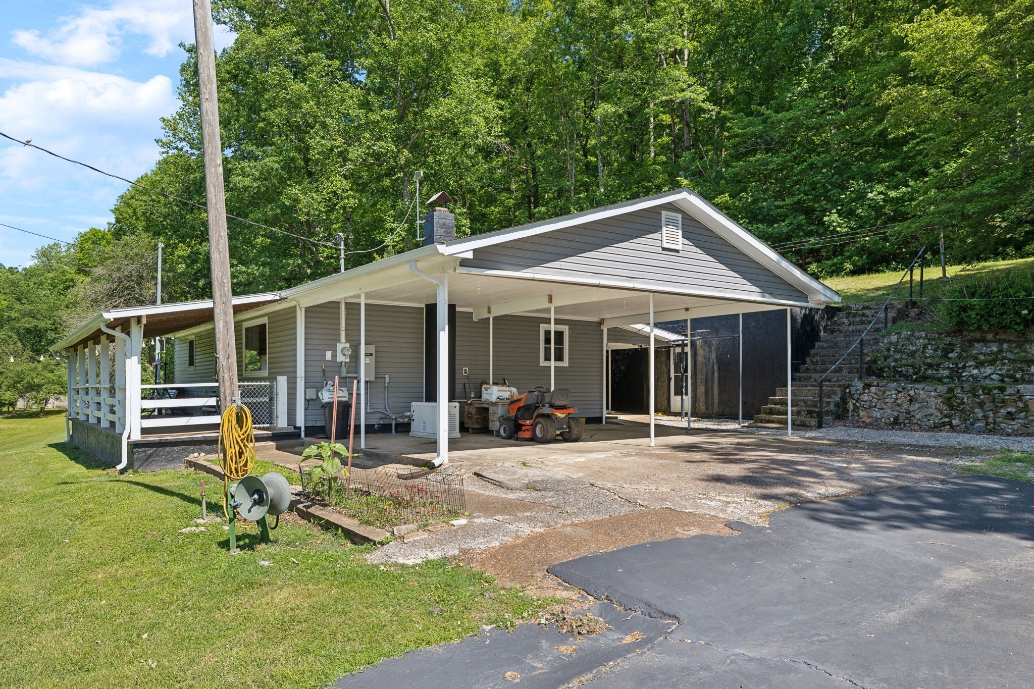 23 acres surround this cozy dream-home retreat with low-cost utilities and natural gas powering a whole-house generator and dryer. City water is available, plus a strong private well. Enjoy covered front and back porches, paved driveway, and extra paved parking, along with modern updates including a tankless water heater and refreshed finishes. Property also features a 23x9 storm/storage shelter, additional outbuildings, creek access near the Hwy bridge, and marketable timber for potential income. Versatile for buyers as a first home, retirement opportunity, or a wonderful short-term rental with investment/income potential. Sellers to convey a 2004 Ford work truck (clear title), two safes, and a zero-turn tractor/mower for added convenience.
