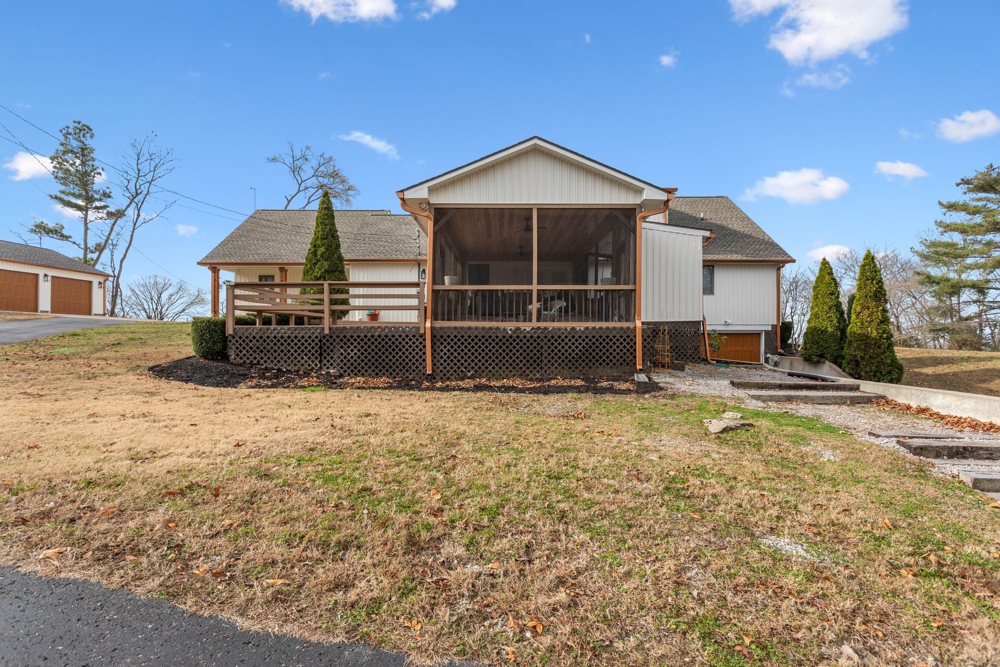 Discover a unique combination of privacy, space, and panoramic beauty in this 3-bedroom, 2.5-bath hilltop retreat, offering 2,930 square feet of living space on 4.99 serene acres. Surrounded by mature trees and sweeping views, this home has a new roof and gutters, fresh interior paint, and updated exterior elements and provides a tranquil escape while delivering exceptional functionality and versatility. The main level features a large living and dining area as well as a great kitchen with new appliances - ideal for entertaining, as well as a huge rec room that invites endless possibilities and a quiet office/study nook. A spacious primary suite on the main floor offers comfort and convenience, and each of the secondary bedrooms are nicely-sized with great closet space, even a 4th room with a closet currently used as an additional bedroom. Enjoy the outdoors year-round on the screened porch, or take advantage of the detached garage/workshop and generous storage throughout. The unfinished basement provides additional parking and storage as well as flexible space for future expansion. A dedicated home gym adds even more versatility to the layout. With its private setting, stunning vistas, and well-designed interior, this property is the perfect place to unwind, entertain, and live fully. Other updates and included special touches include: Ring security and doorbells, new garage doors and openers, reconditioned kitchen cabinetry, updated master bath and closet, new exterior lighting, new carpet, new ceiling in deck/rear porch area, new water heater, new a/c in rec room, new door knobs and faucets, electric car charger, underground dog fence, and new lighting in the detached garage.