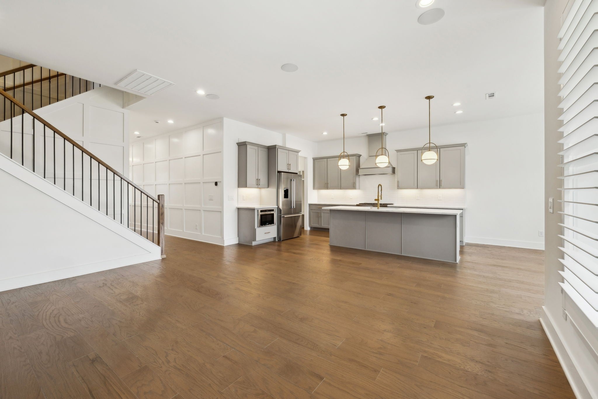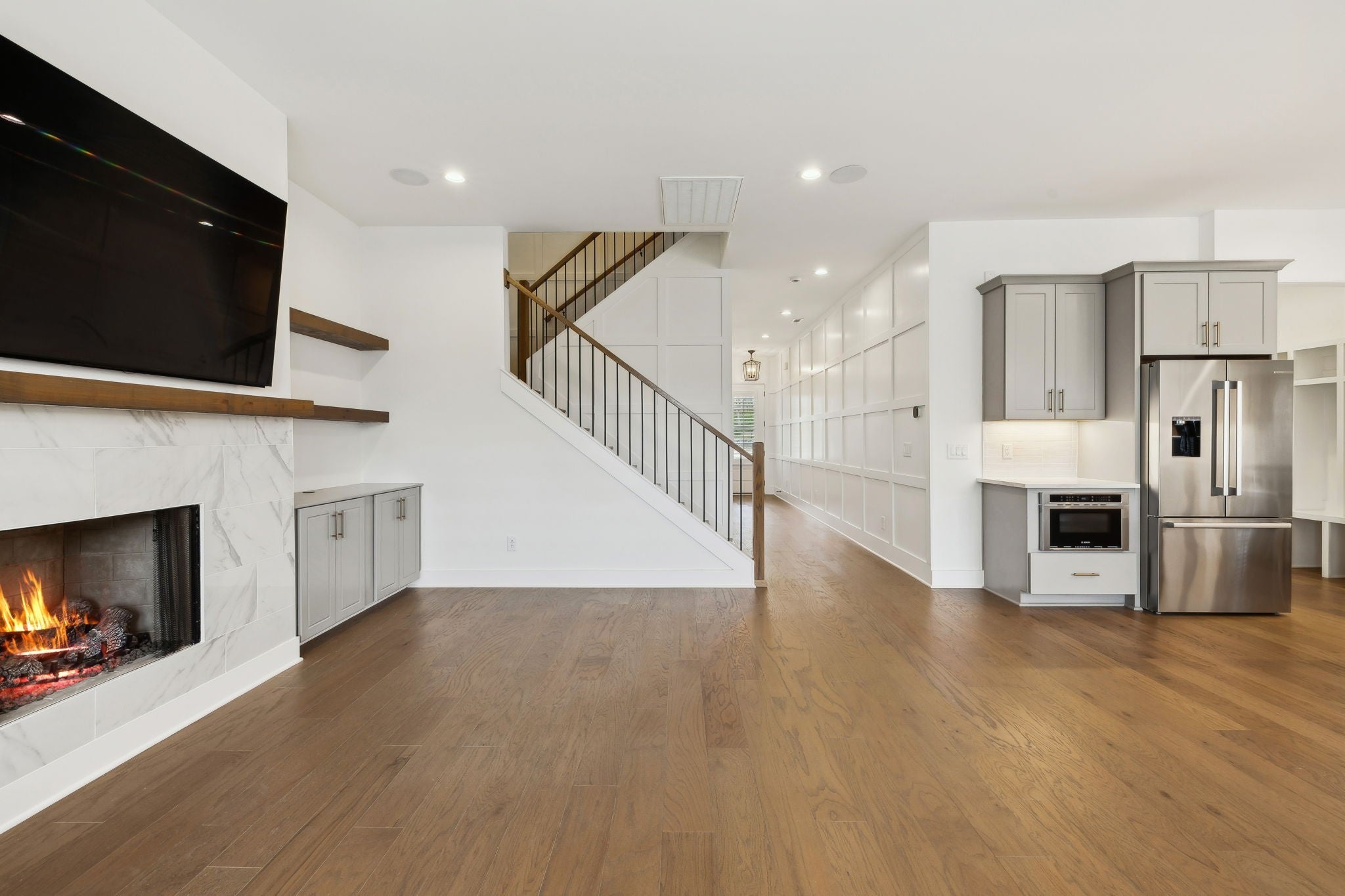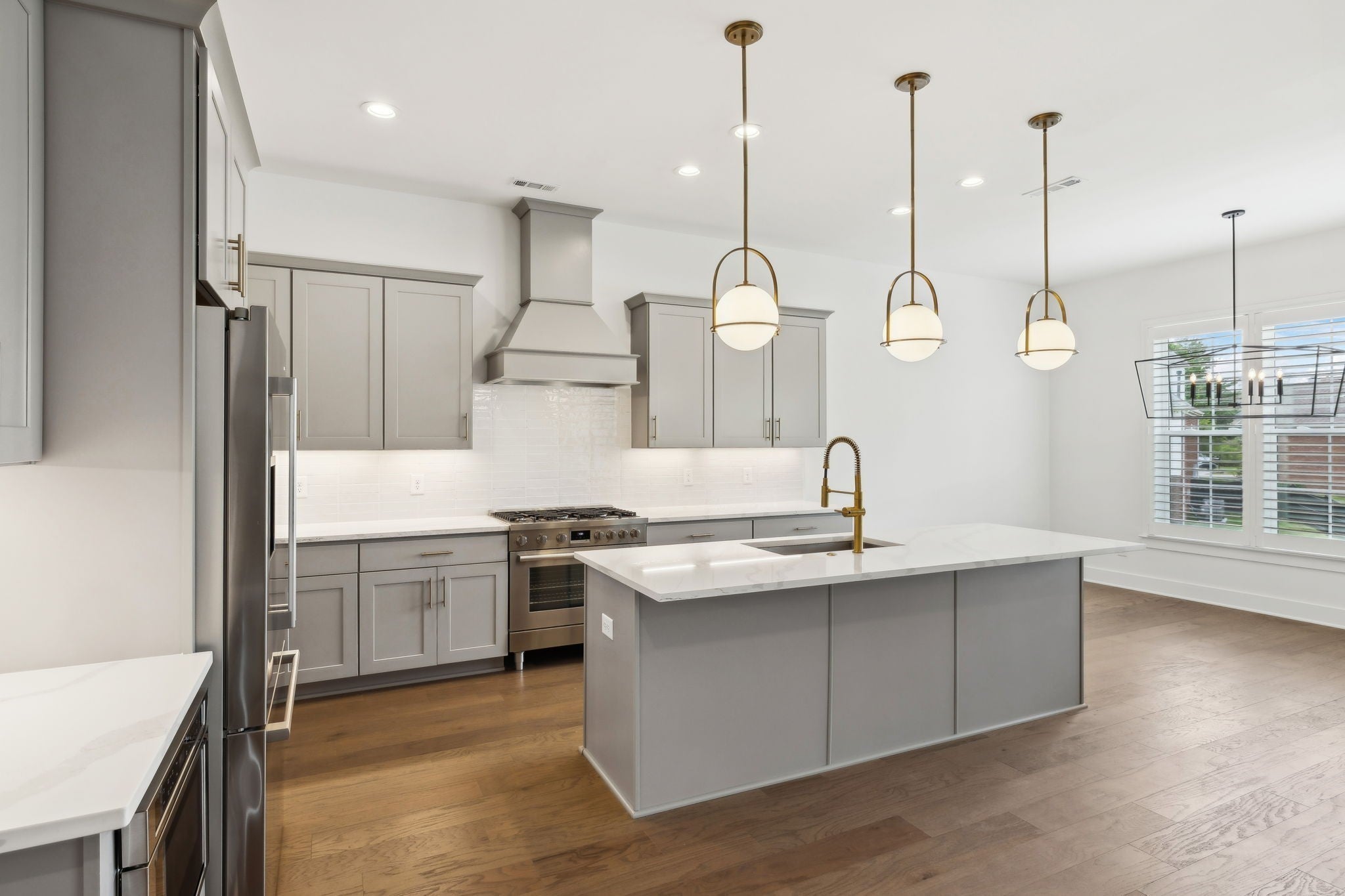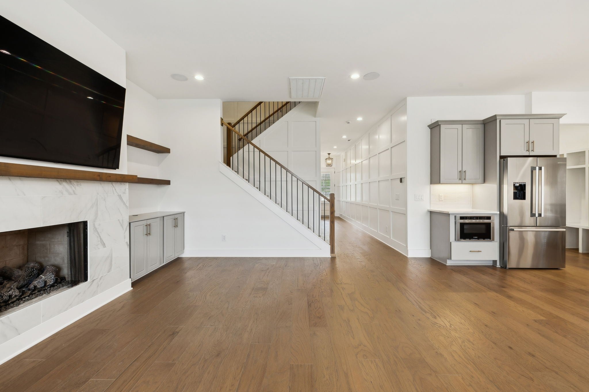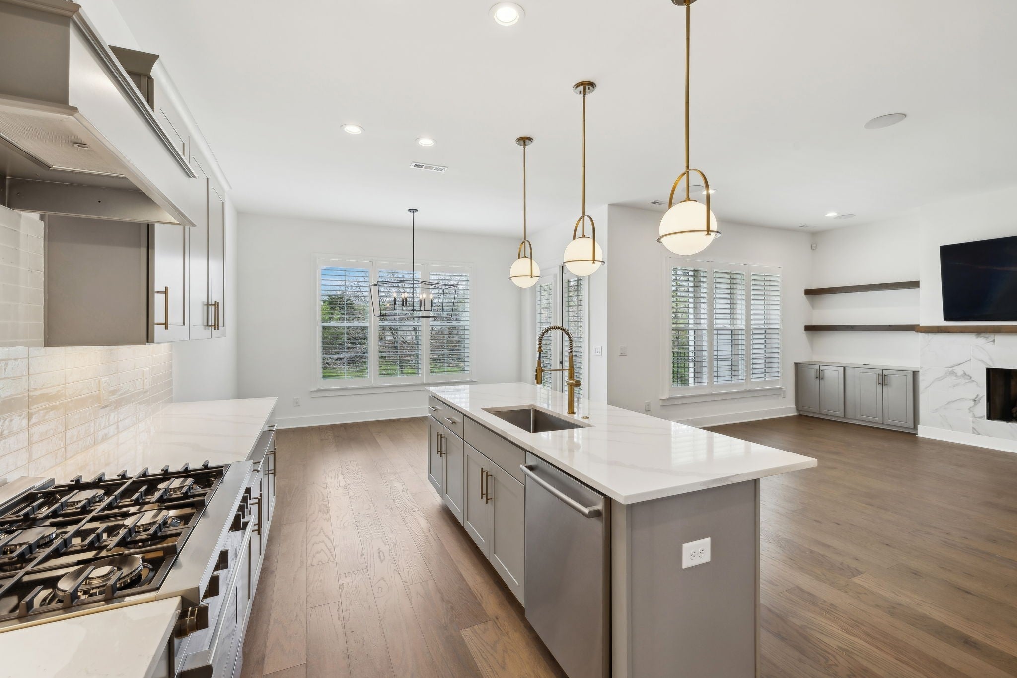 An incredible opportunity to own a professionally staged, move-in-ready townhome within an exclusive gated enclave in the heart of Brentwood. Offering one of the community’s most sought-after floor plans, this residence blends refined design with modern functionality ~ without the delay of new construction. Thoughtful architectural details define the interiors, including custom wood trim, French doors, rich hardwood flooring, and a gas fireplace anchoring the main living space. The open-concept kitchen is both elegant and highly functional, featuring upgraded appliances, an oversized walk-in pantry, and seamless connectivity to the living and dining areas, creating an ideal setting for entertaining and everyday living. The primary suite is a true retreat, complete with a spa-inspired bath, generous walk-in closet, and private covered balcony. Each additional bedroom also offers walk-in closets, while a conveniently placed laundry room provides direct access to the primary suite. Additional highlights include custom plantation shutters, built-in cabinetry, designer lighting, a Beale Street surround sound system, Ecobee smart thermostats, tankless water heater, full irrigation system, and an epoxy-coated garage floor. Two private balconies extend the living space outdoors, offering peaceful, elevated views. Washer, dryer, televisions, and kitchen appliances convey. Ideally located just minutes from Brentwood’s premier shopping, dining, and highly regarded schools, this exceptional residence delivers gated privacy, turnkey luxury, and an elevated lifestyle in one of Brentwood’s most desirable communities.