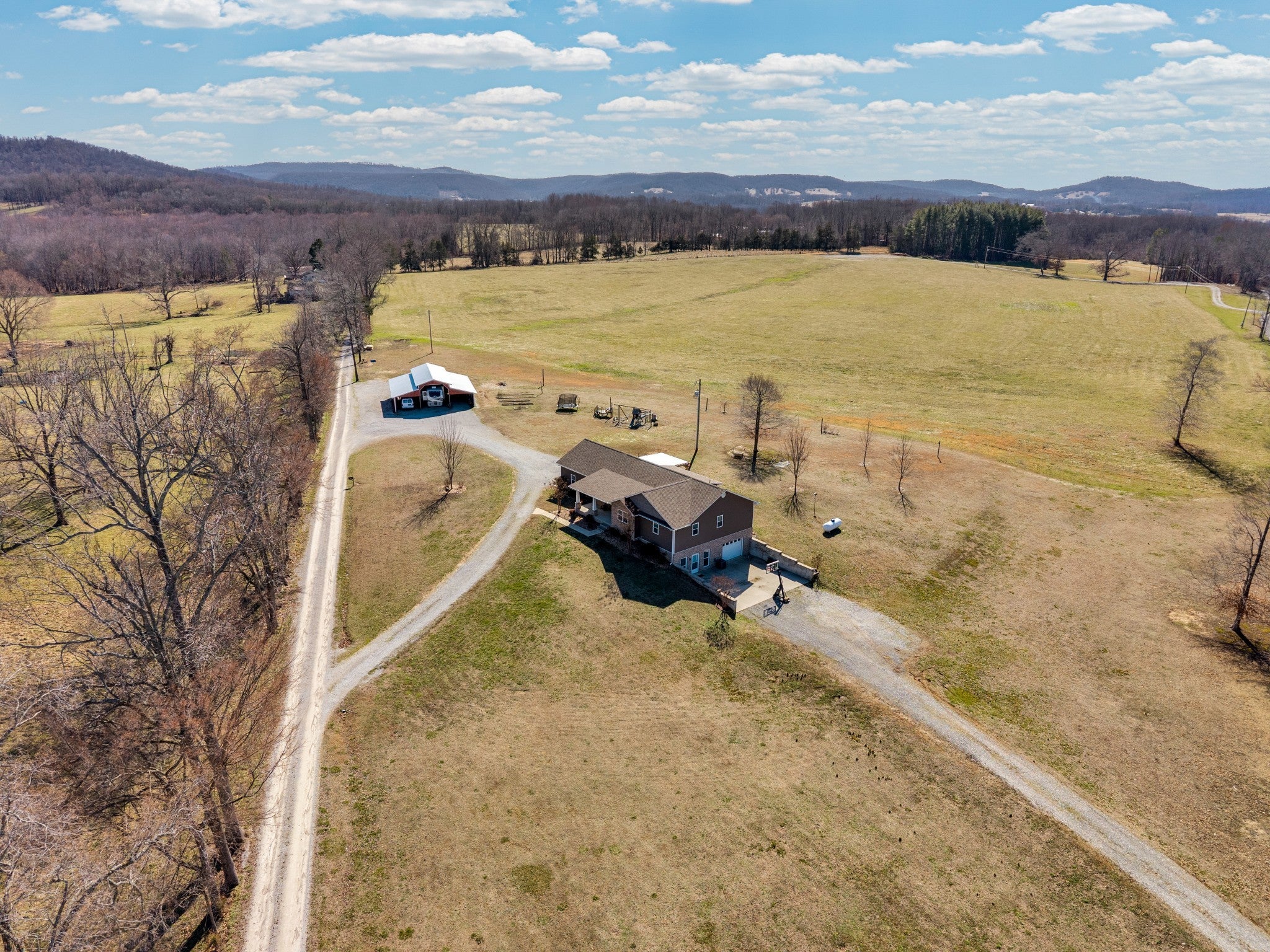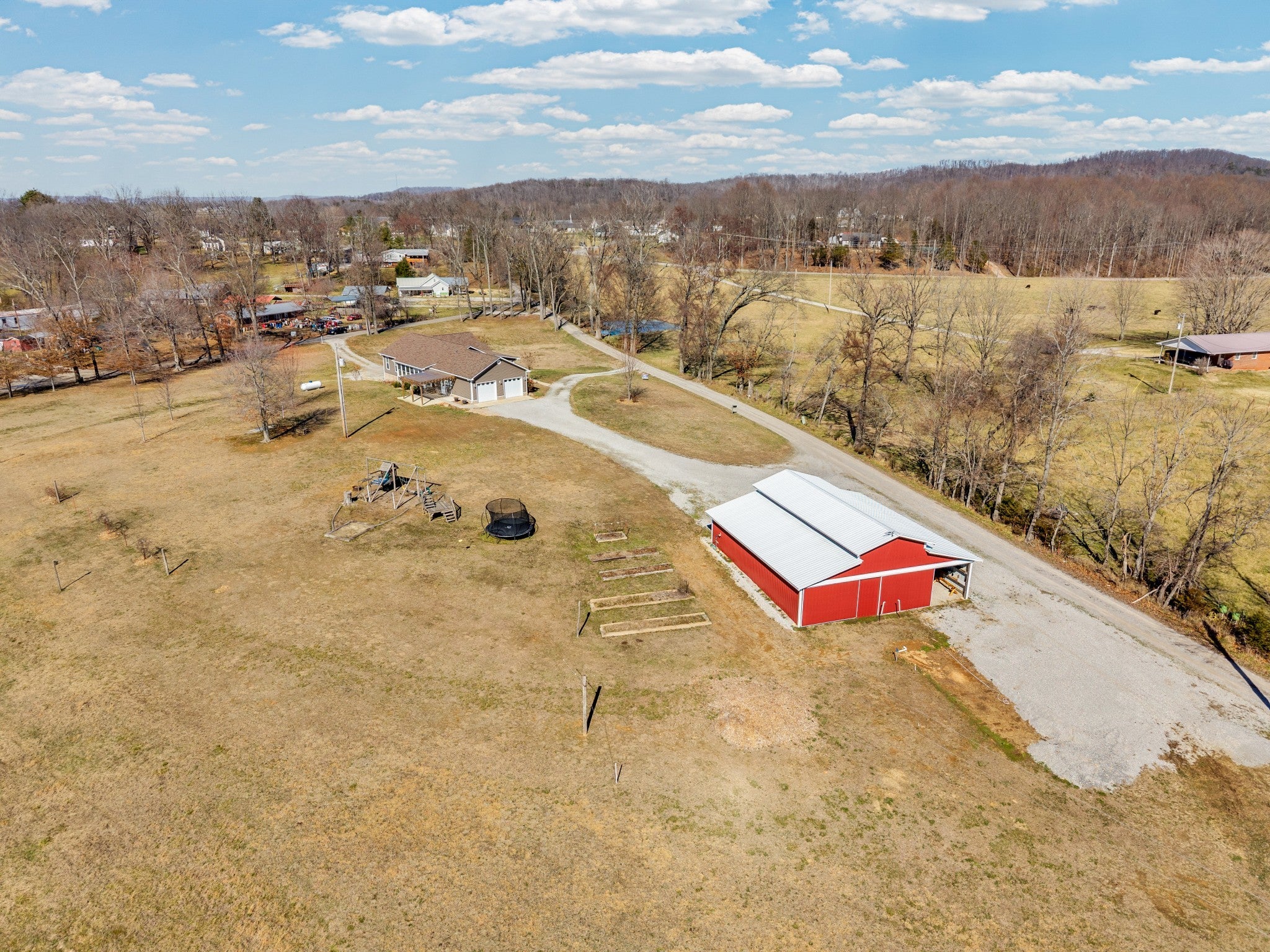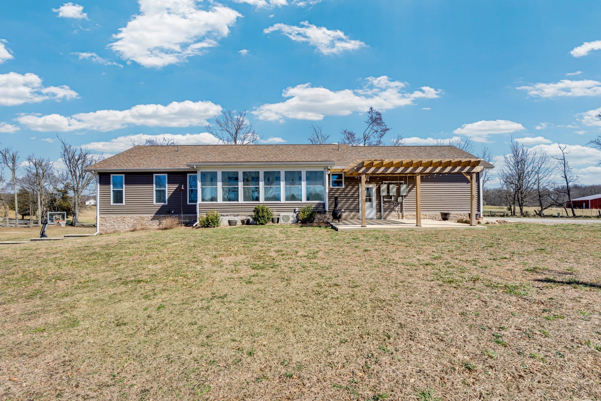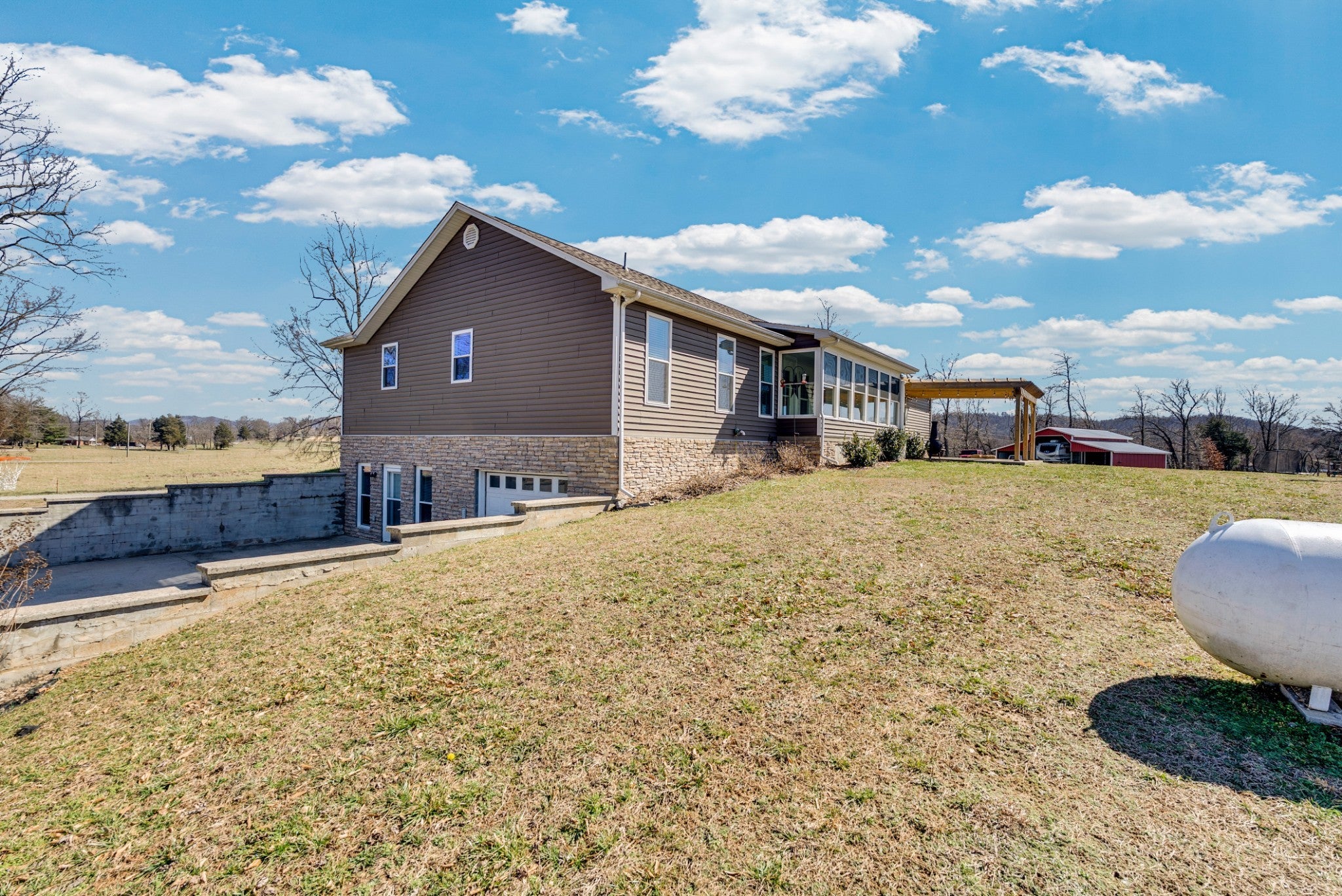 Welcome to this beautiful 3 bed/3 bath Modern Farm Ranch. From the moment you walk you in, the main thing you feel is HOME! You'll discover the following: Open floor plan with gorgeous pergo wood floors, a main floor primary with walk-in closet and double vanity, walk-in shower bath. A four-seasons room, two guest rooms and a full bath complete the main floor, along with laundry/pantry room, and fully equipped kitchen with penisula. The garage boast extended length for longer vehicles. Downstairs there are additional bedroom and living spaces, a full bathroom, a large safe room and workshop that has a full garage door to outside. Outside you will find 5 acres of land hosting a 44x44 barn, garden spots, strawberry bed, grapevines, blueberry bushes, play ground equipment and room for more! Ask your agent about the lender and seller incentives on this spectacular home. Buyer and Buyer's agent to verify all information. The Realty Firm does not hold earnest money. More land available! NOTE: Appx. 2.82 acres has been taken from adjoining MLS 241108 tract parcel ID 105 005.02 that makes this listing 5 acres total. See attached documents for new survey. OTHER: Barn has 240v power source for heavy duty tools or power equipment, RV Hook-Ups, Above ground water taps.