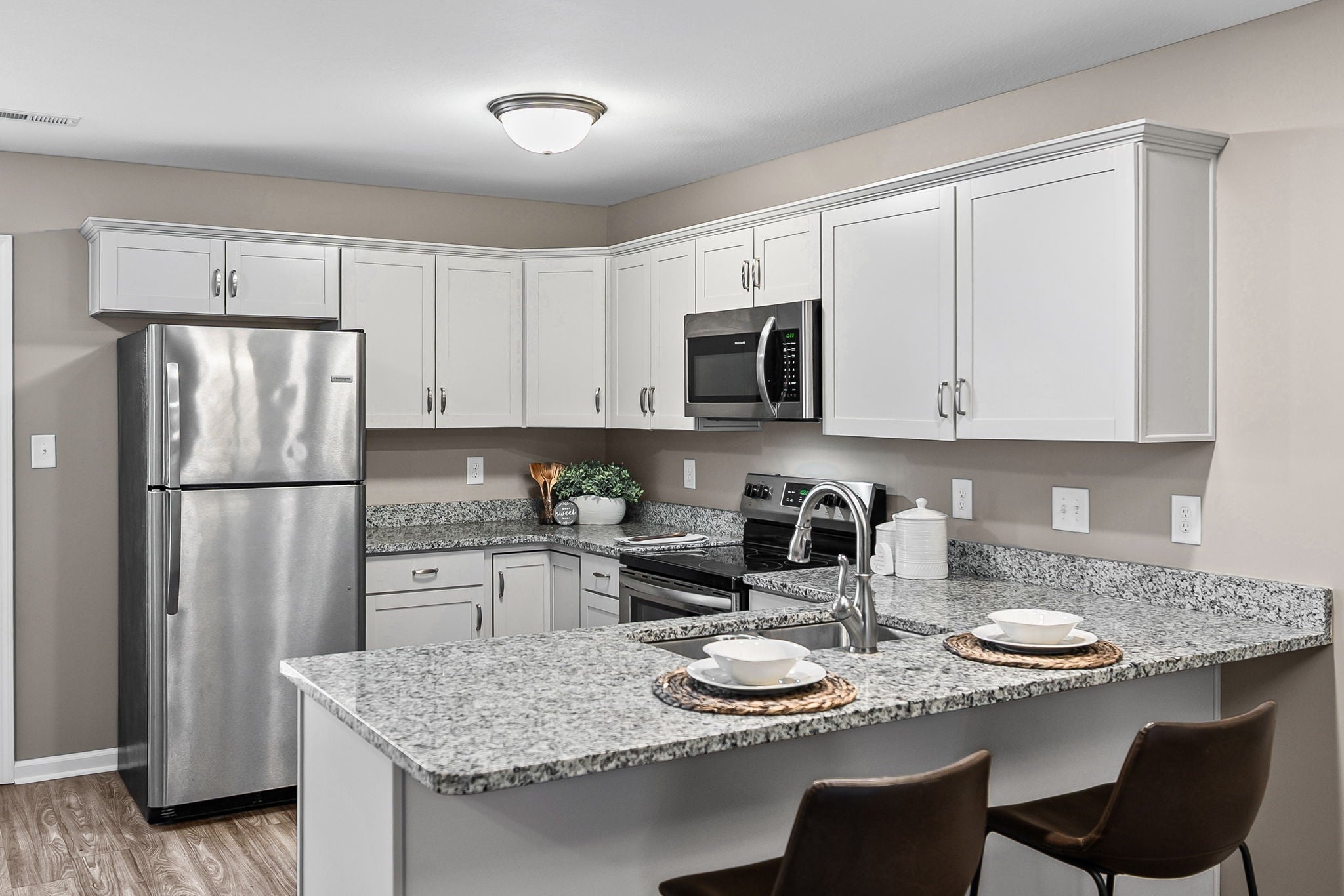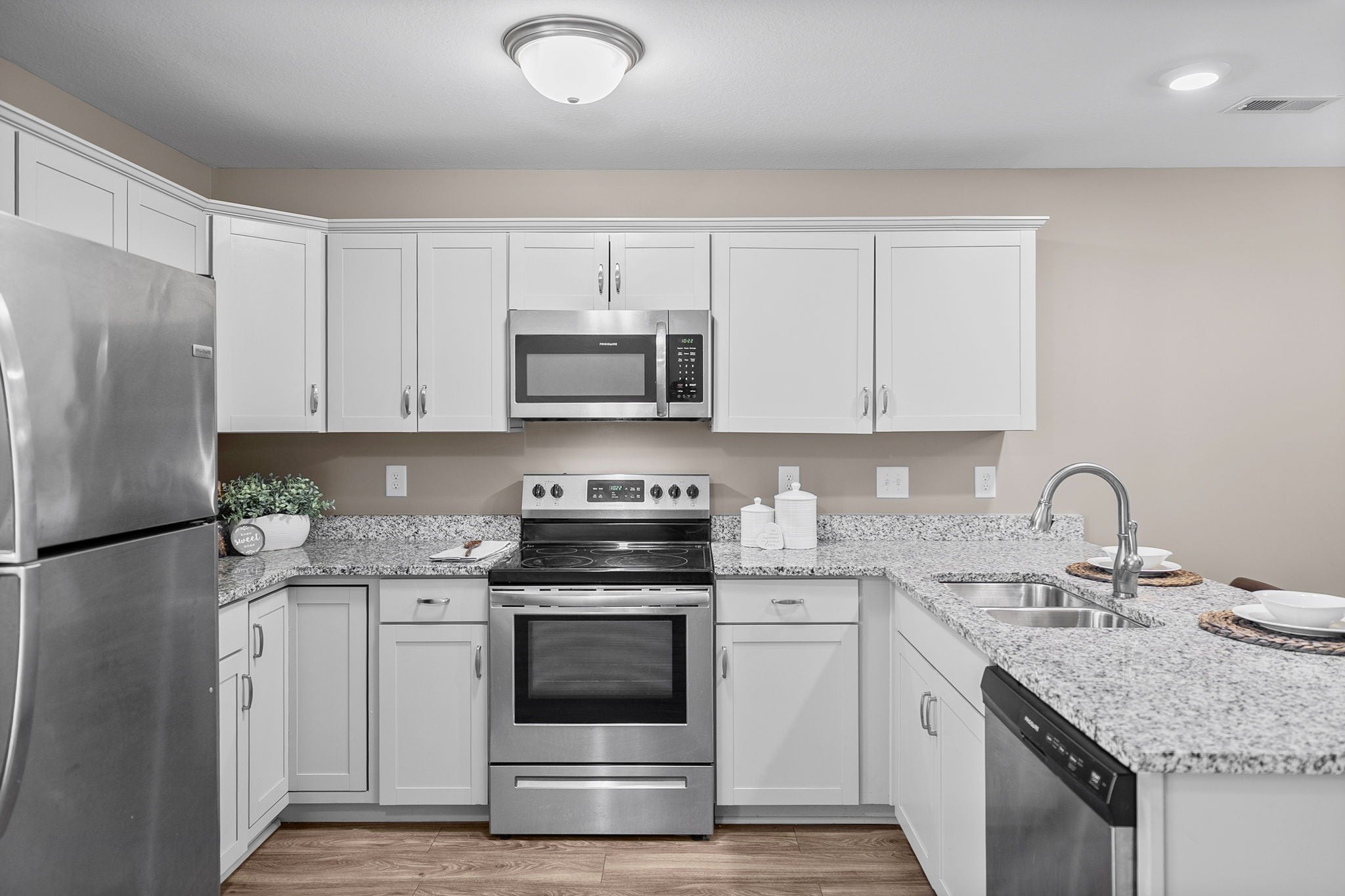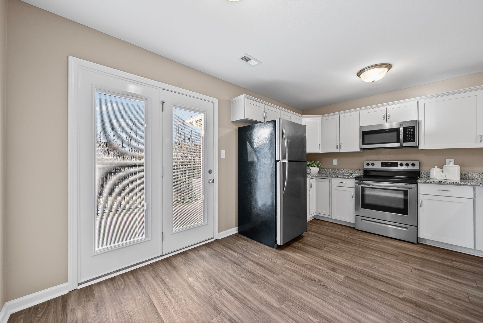- Oven, Range, Dishwasher, Disposal, Microwave, Refrigerator, Stainless Steel Appliance(s)