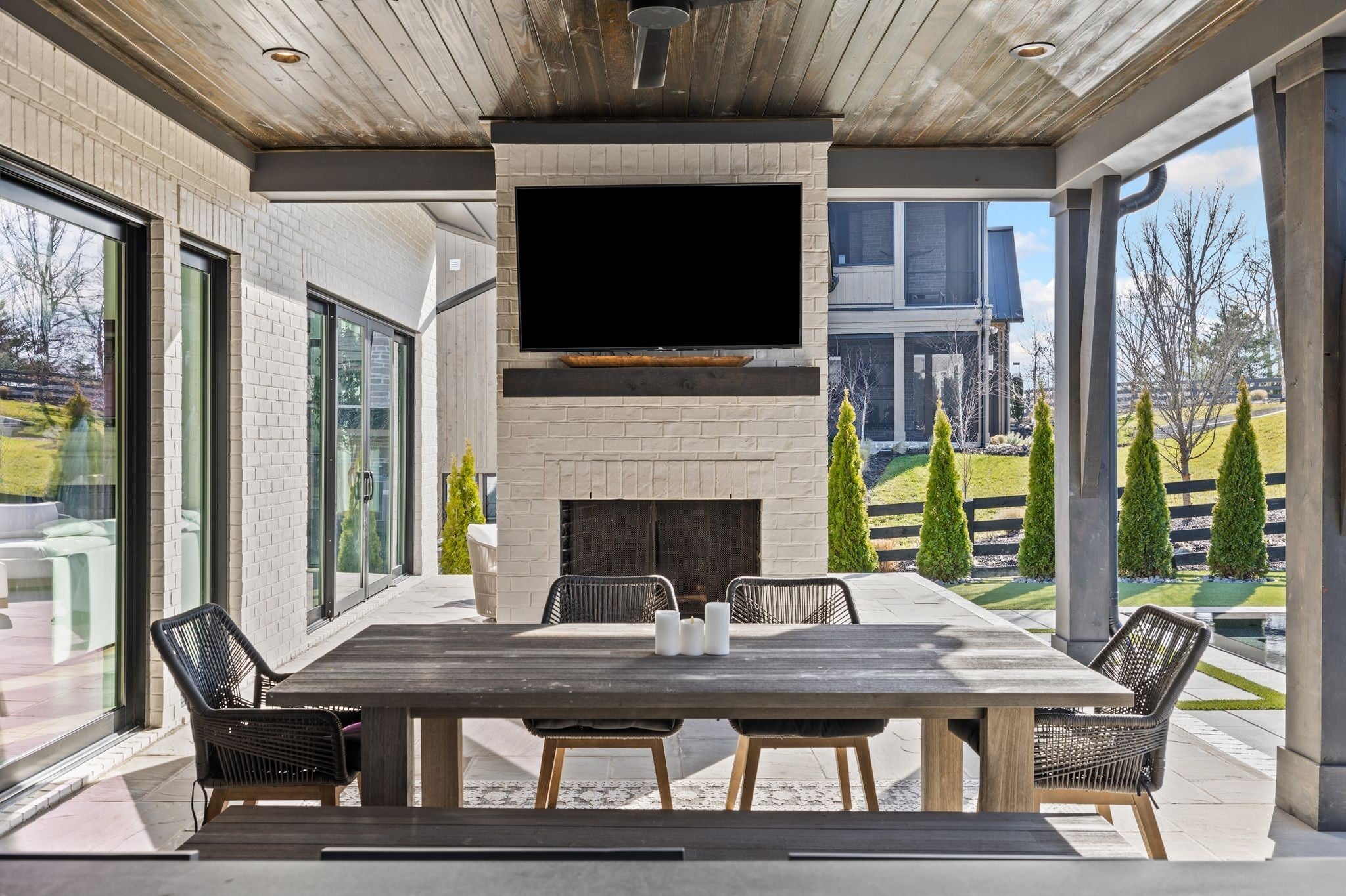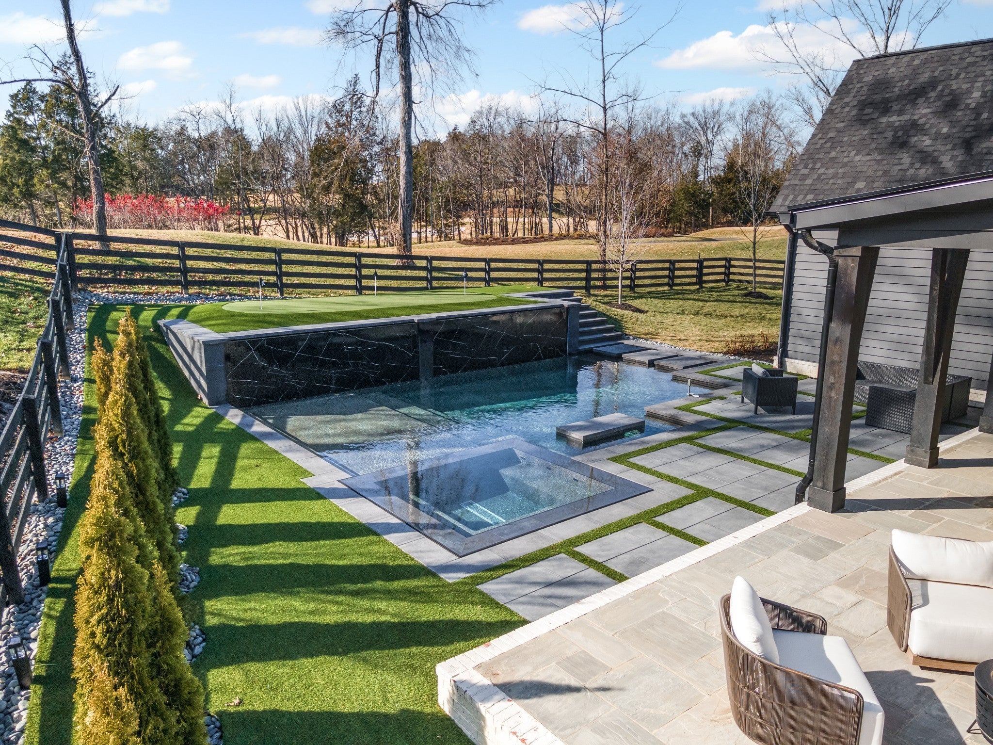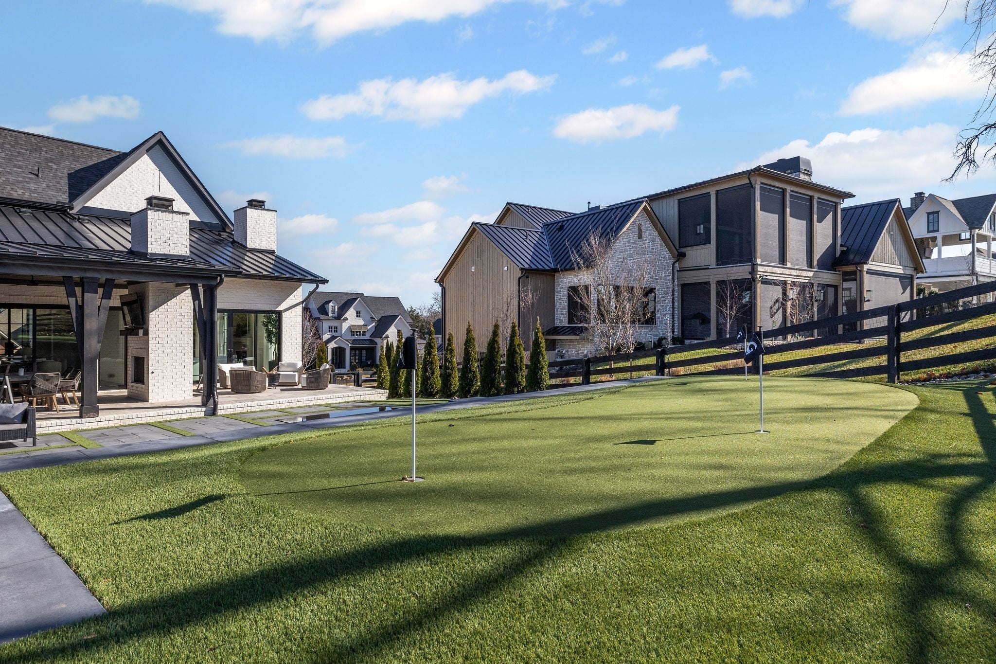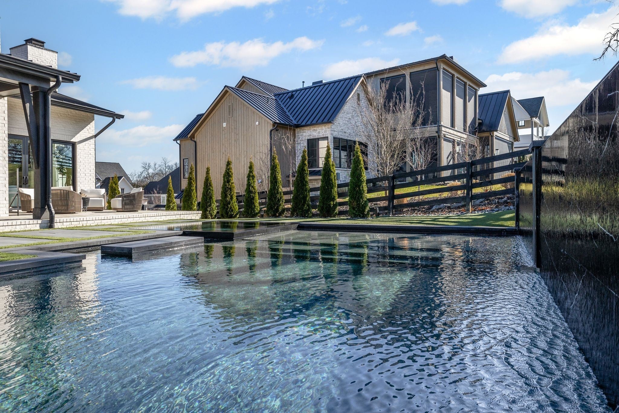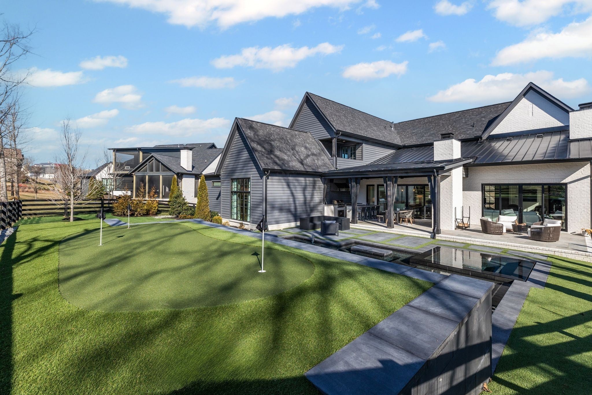 Welcome to this stunning custom-built residence in the prestigious Troubadour Golf & Field Club, crafted by Tennessee Valley Homes in 2022. Spanning 5,929 square feet on a 0.45-acre lot, this architectural masterpiece combines modern elegance with timeless design, offering an unparalleled lifestyle in one of Middle Tennessee’s most sought-after communities. This home features five spacious bedrooms, five full bathrooms, and two half baths, providing ample space for family and guests. Step inside to discover an open-concept floor plan flooded with natural light and adorned with wide-plank hardwood floors. The soaring ceilings and exposed beams create a sense of grandeur, while sleek, modern finishes provide a warm and inviting atmosphere. The gourmet kitchen boasts top-of-the-line appliances, a large island, and seamless flow into the dining and living areas—perfect for entertaining. A dedicated office space with custom millwork and large windows offers serene views and an ideal work-from-home environment. The luxurious primary suite serves as a private retreat, featuring a spa-like bathroom and generous closet space. For the ultimate in leisure and entertainment, enjoy the indoor bar room with a glass-enclosed wine cellar, a state-of-the-art golf simulator, and multiple lounge areas designed for relaxation and social gatherings. The expansive outdoor entertaining area is a true showstopper, featuring a fully equipped kitchen, a cozy fireplace, and ample seating for guests. The highlight is the resort-style pool and hot tub, surrounded by sleek stonework and lush landscaping, offering breathtaking views of Troubadour’s Tom Fazio-designed championship golf course. Additional features include striking curb appeal with modern architectural design, large glass doors that seamlessly connect indoor and outdoor spaces, designer lighting fixtures, custom finishes throughout, and a three-car garage with ample storage. This home is more than a residence—it’s a lifestyle.