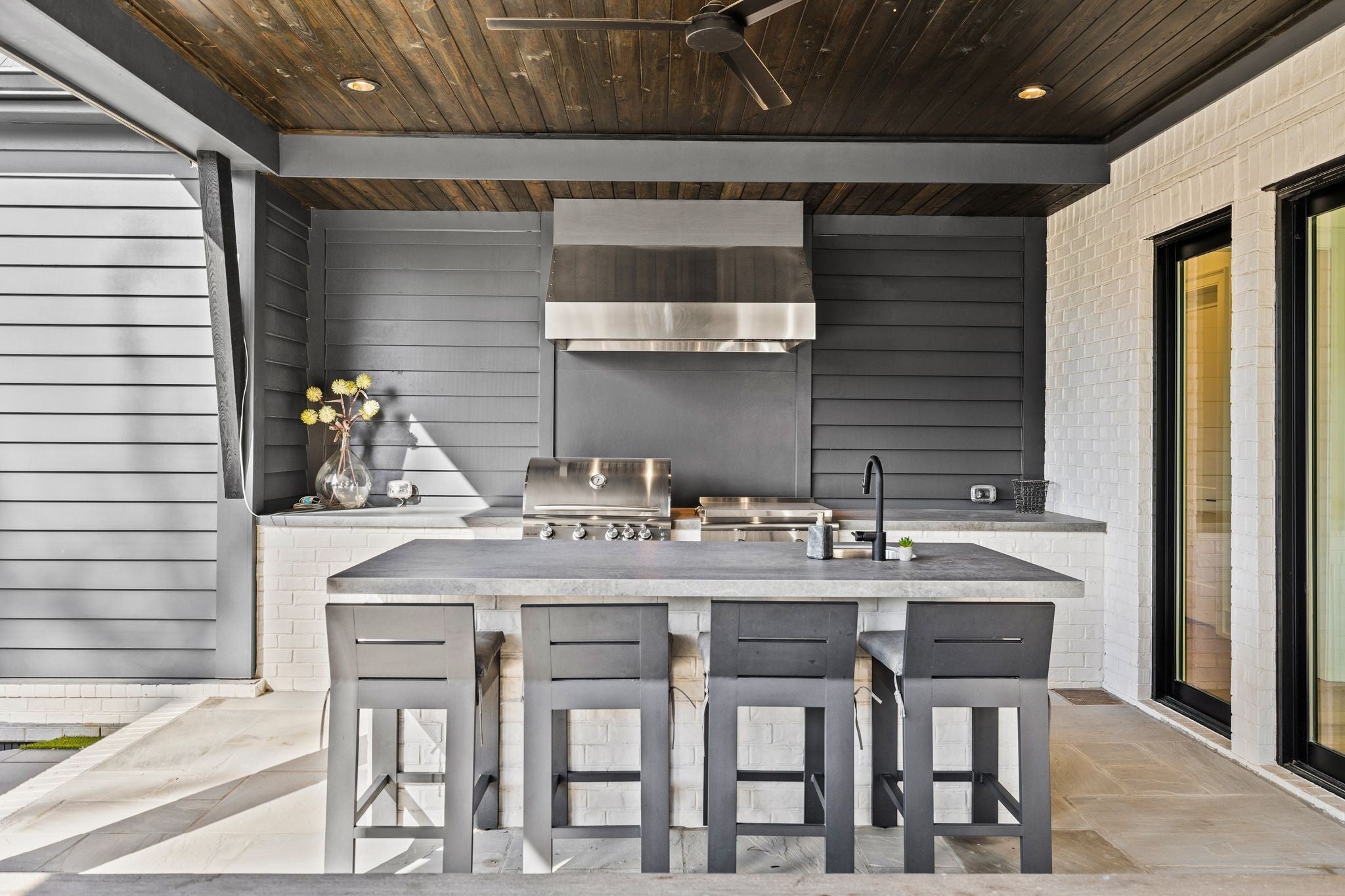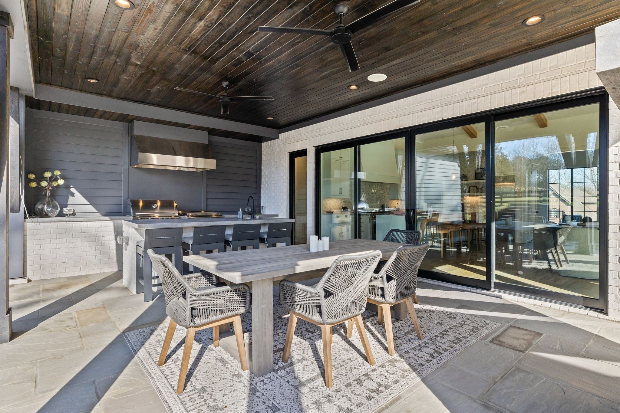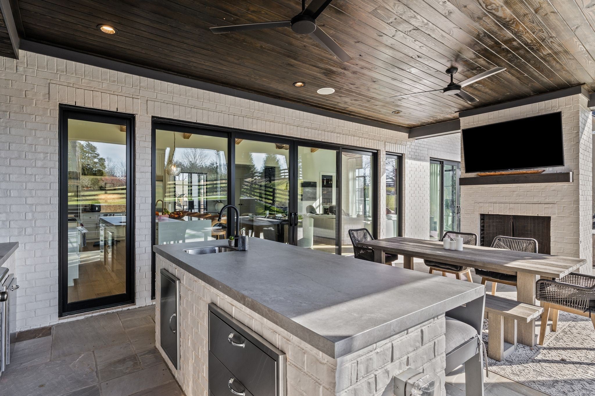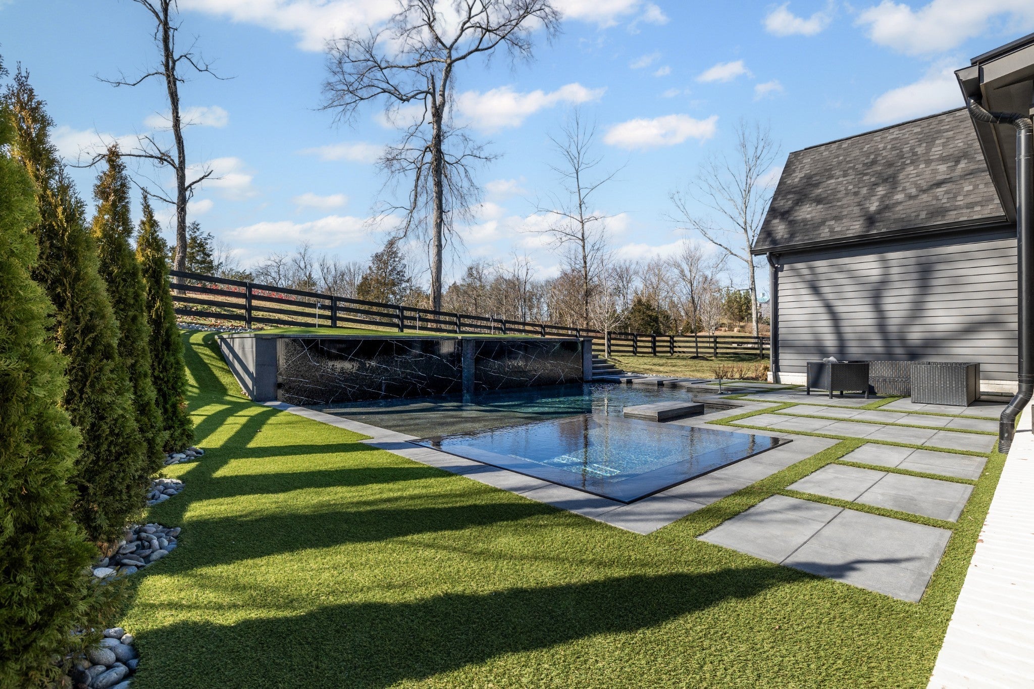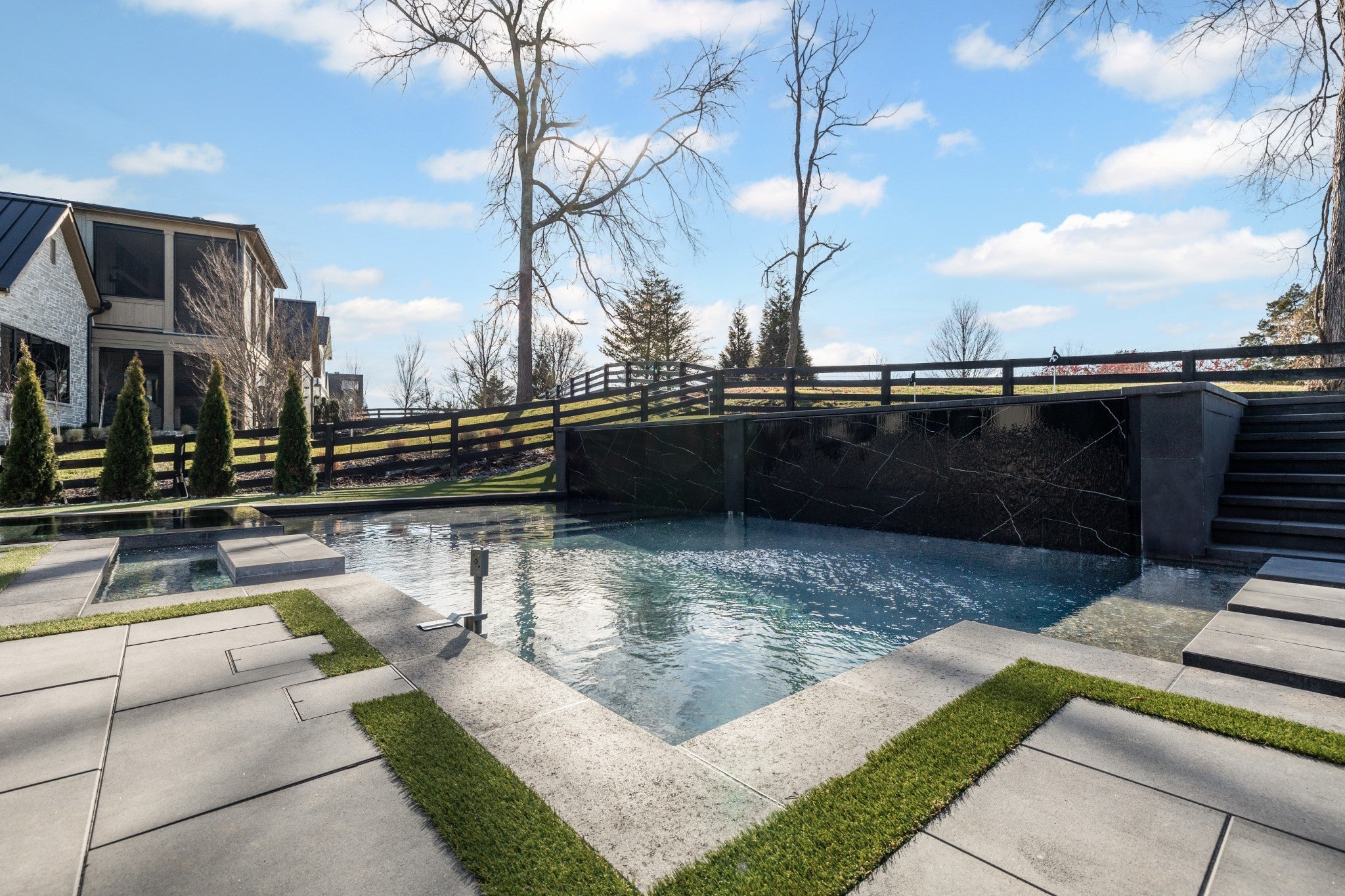 Welcome to this stunning custom-built residence in the prestigious Troubadour Golf & Field Club, crafted by Tennessee Valley Homes in 2022. Spanning 5,929 square feet on a 0.45-acre lot, this architectural masterpiece combines modern elegance with timeless design, offering an unparalleled lifestyle in one of Middle Tennessee’s most sought-after communities. This home features five spacious bedrooms, five full bathrooms, and two half baths, providing ample space for family and guests. Step inside to discover an open-concept floor plan flooded with natural light and adorned with wide-plank hardwood floors. The soaring ceilings and exposed beams create a sense of grandeur, while sleek, modern finishes provide a warm and inviting atmosphere. The gourmet kitchen boasts top-of-the-line appliances, a large island, and seamless flow into the dining and living areas—perfect for entertaining. A dedicated office space with custom millwork and large windows offers serene views and an ideal work-from-home environment. The luxurious primary suite serves as a private retreat, featuring a spa-like bathroom and generous closet space. For the ultimate in leisure and entertainment, enjoy the indoor bar room with a glass-enclosed wine cellar, a state-of-the-art golf simulator, and multiple lounge areas designed for relaxation and social gatherings. The expansive outdoor entertaining area is a true showstopper, featuring a fully equipped kitchen, a cozy fireplace, and ample seating for guests. The highlight is the resort-style pool and hot tub, surrounded by sleek stonework and lush landscaping, offering breathtaking views of Troubadour’s Tom Fazio-designed championship golf course. Additional features include striking curb appeal with modern architectural design, large glass doors that seamlessly connect indoor and outdoor spaces, designer lighting fixtures, custom finishes throughout, and a three-car garage with ample storage. This home is more than a residence—it’s a lifestyle.