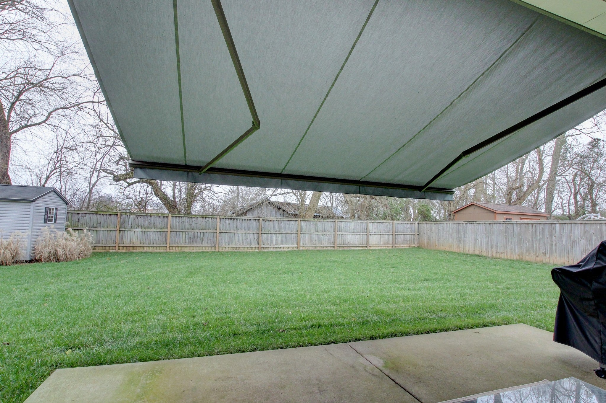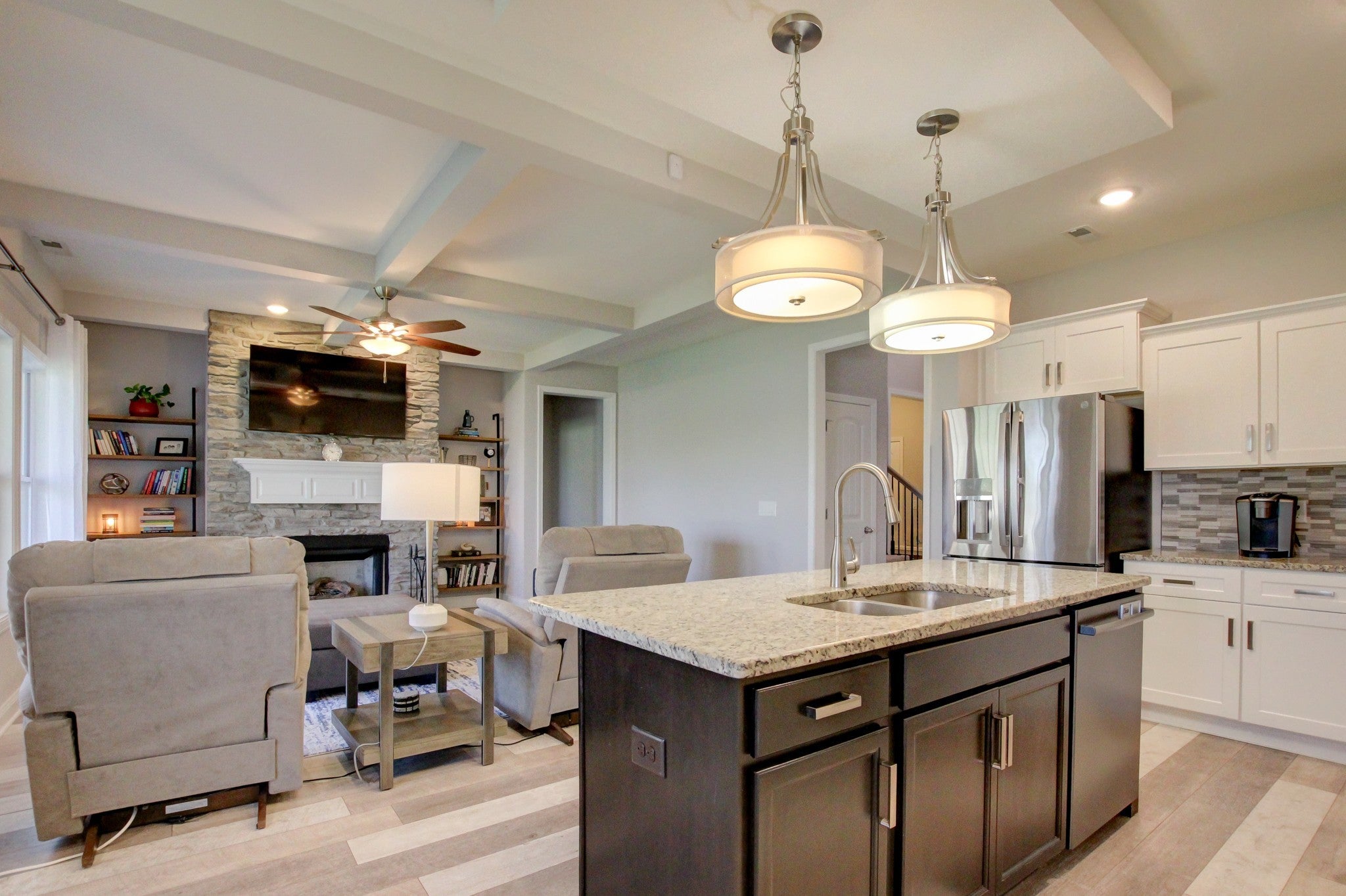 This stunning 4-bedroom, 3-bath home offers a wealth of features. Spacious open living room floor plan with a center piece stone fireplace, along with a coffered ceiling above. Beautiful flooring and neutral paint colors throughout. Big windows that look out to the back lawn area. The kitchen features SS appliances, with an upgraded refrigerator. Along with granite countertops, a large kitchen island, and excellent lighting. The cozy downstairs primary bedroom has its own separate door out to the patio. Along with a large tiled walk-in shower and his/her sinks. A second downstairs bedroom/bathroom is available for added convenience. Upstairs offers a large open bonus room. With 2 more bedrooms and a full bathroom. Private fenced-in backyard with no rear neighbors. A unique remote awning that goes over the patio for added shade. This home offers many upgrades throughout and shows extremely well.