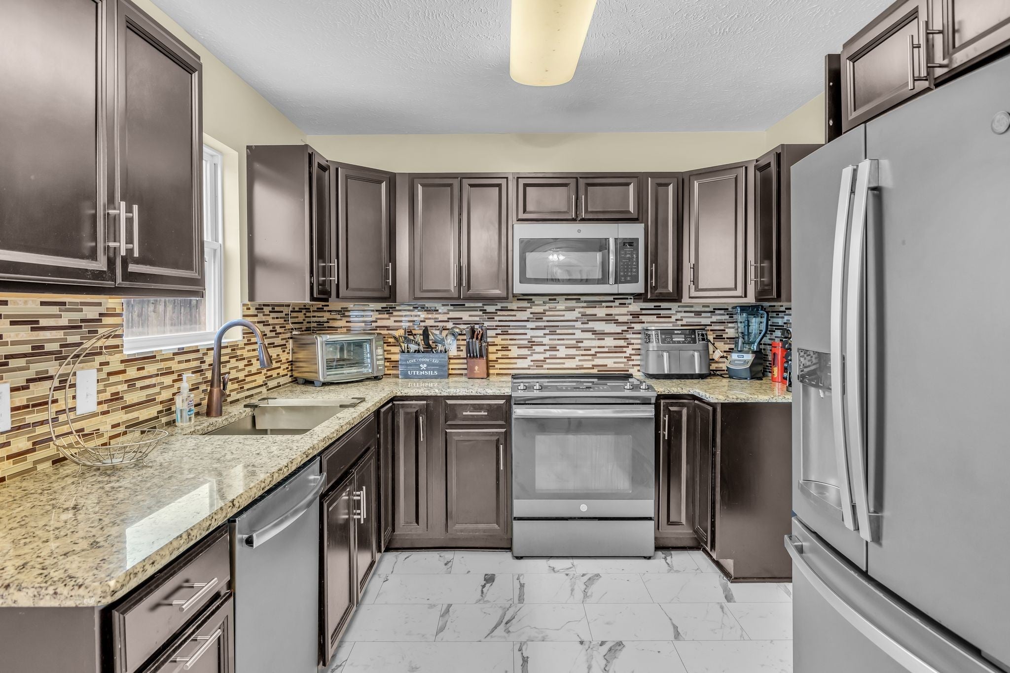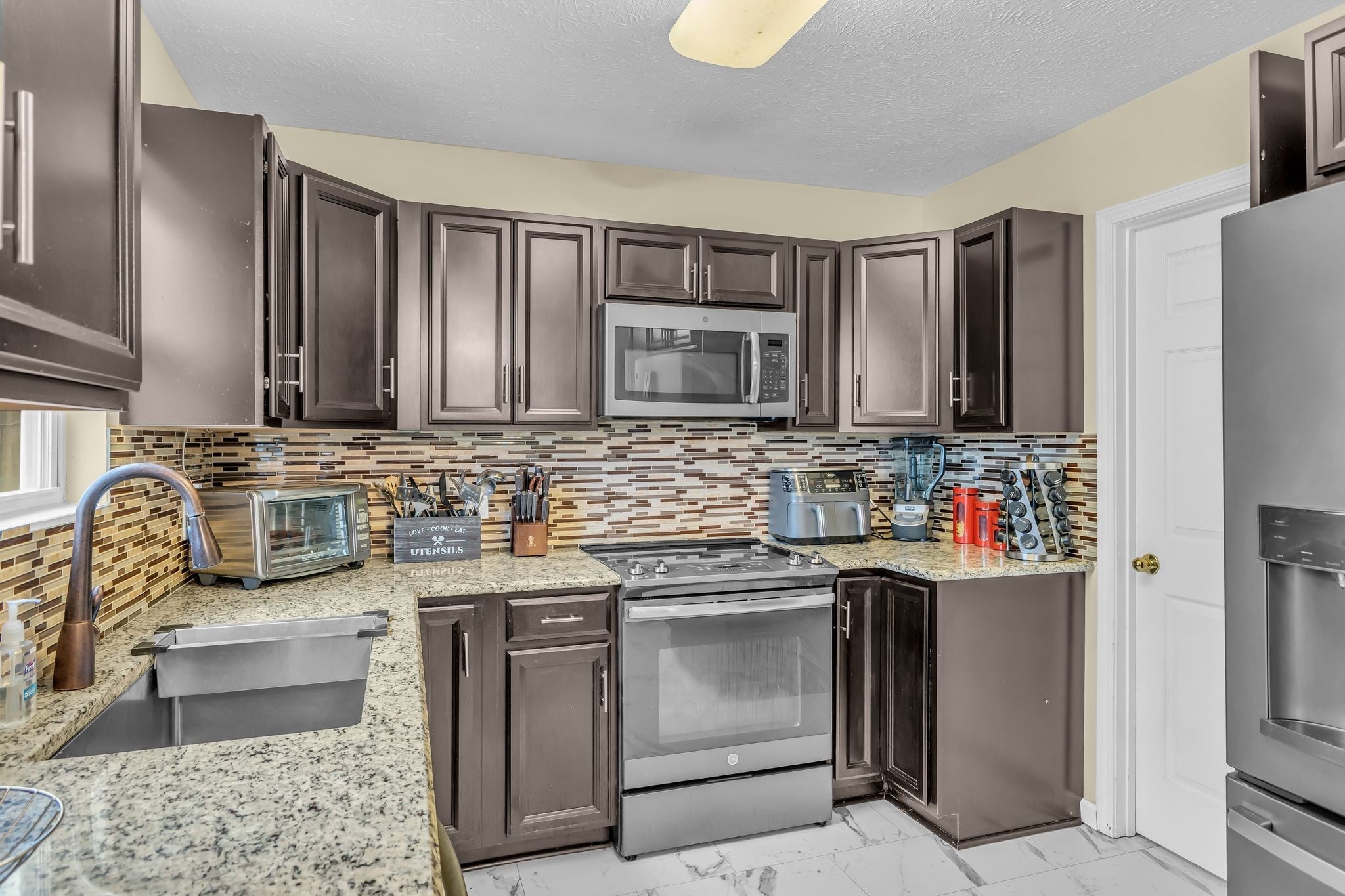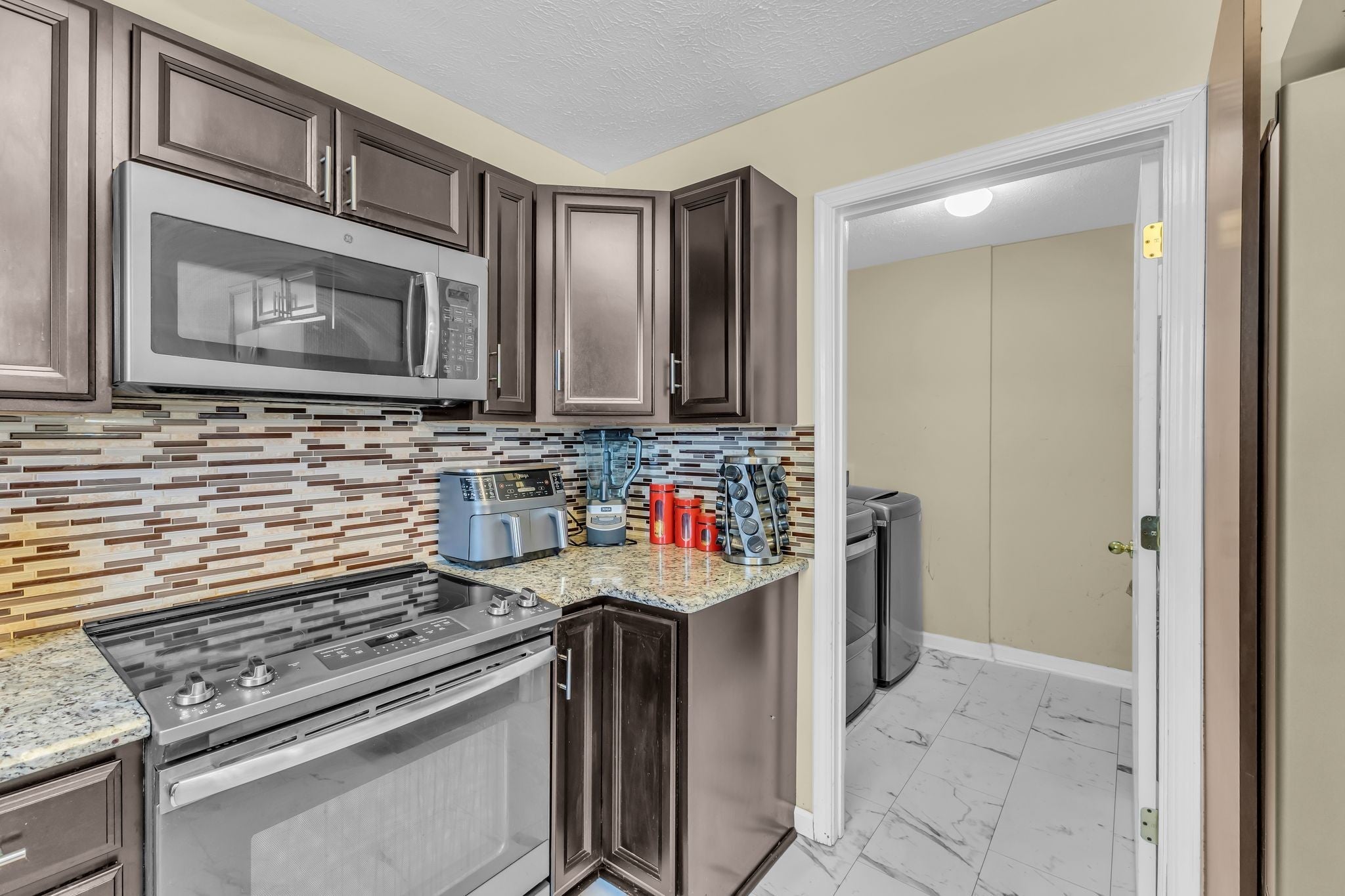 - Electric Oven, Electric Range, Dishwasher, Disposal, Microwave, Refrigerator, Stainless Steel Appliance(s)