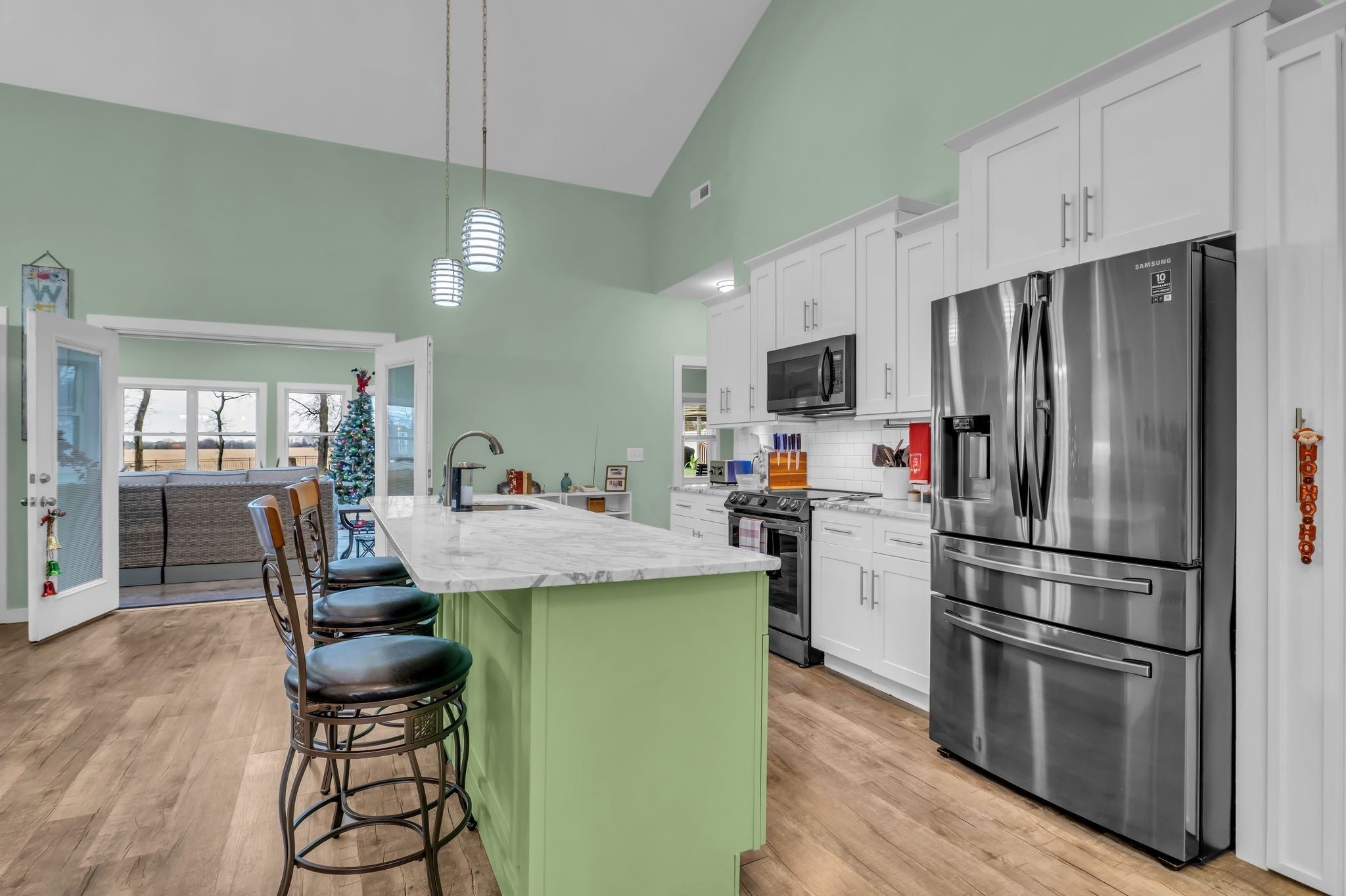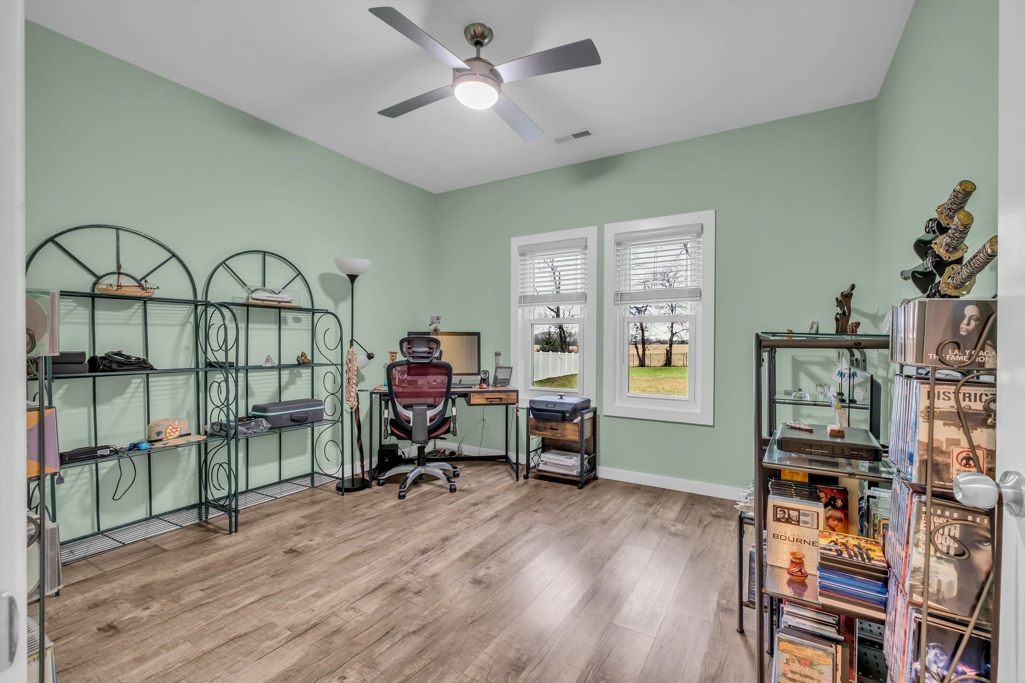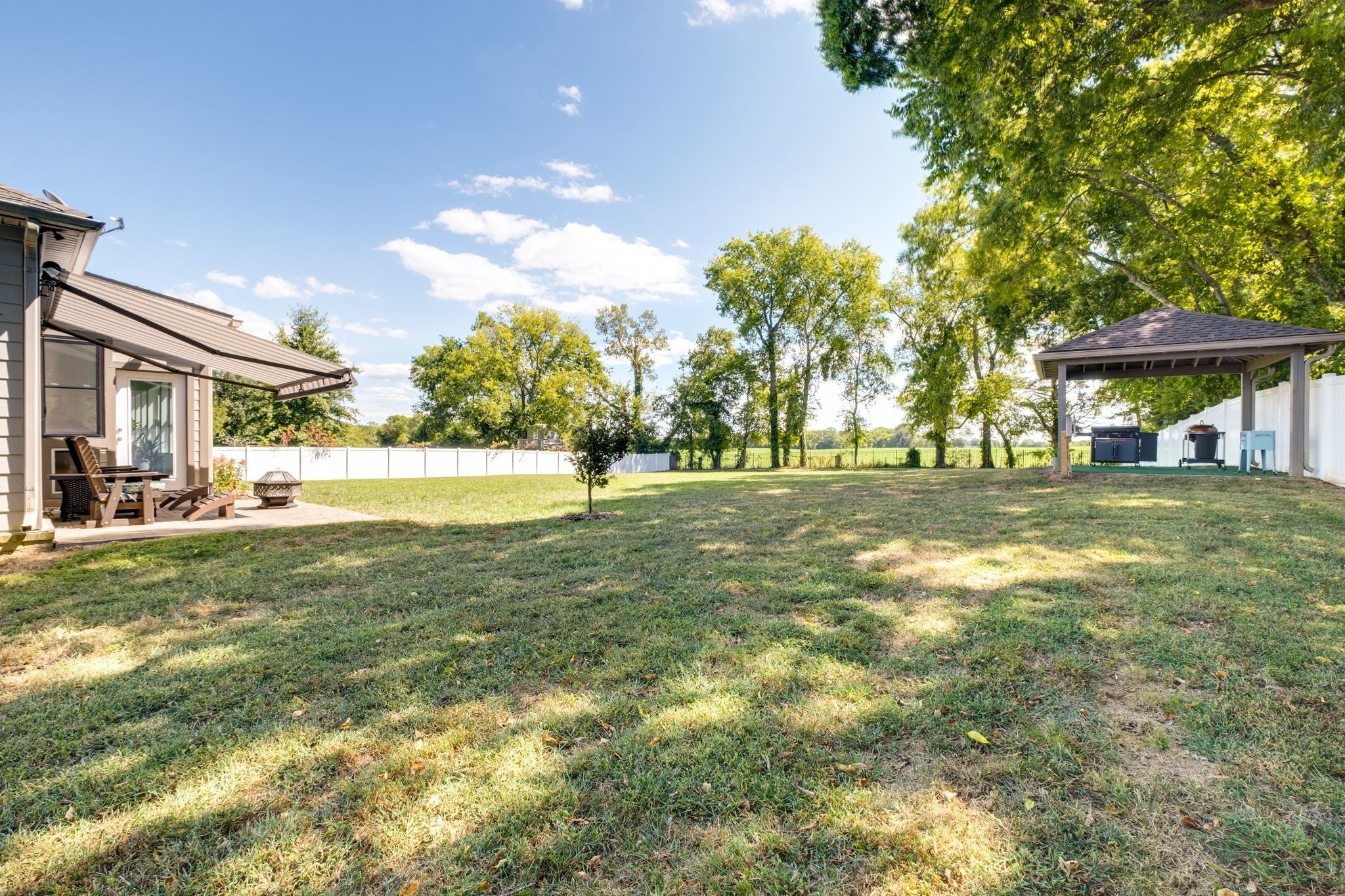 Tucked away in a small, quiet community with a low HOA, this beautifully maintained one-level home sits on nearly an acre and backs directly to a peaceful family farm—offering privacy, open views, and a true sense of retreat. Inside, the expansive great room stuns with soaring 20-foot ceilings, an electric fireplace, and durable LVP flooring throughout the entire home—no carpet anywhere. Thoughtfully designed for comfort and efficiency, the home features over 2,700 square feet of single-level living with three bedrooms, two baths, and a dedicated office. A 600+ square foot sun/rec room added in 2023 creates an incredible second living space, highlighted by a wall of energy-efficient windows overlooking the backyard. Step outside to enjoy a fully fenced yard, complete with a pergola and an exterior porch featuring an electric awning with sun screens—perfect for relaxing or entertaining in every season. Recent upgrades include all new energy-efficient windows (2023), custom blinds, a new electrical panel, newer HVAC systems (two units have 8 years left on a transferable warranty which includes parts & labor), a tankless water heater, and a one-year-old garage door. The septic system was pumped in 2025 with all filters cleaned, offering peace of mind for the next owner. The primary suite is a true retreat with a jetted tub and a spacious walk-in shower. All appliances remain, making this home truly move-in ready. With space, privacy, and extensive updates—this Gallatin gem delivers comfort, functionality, and serene surroundings just minutes from town.