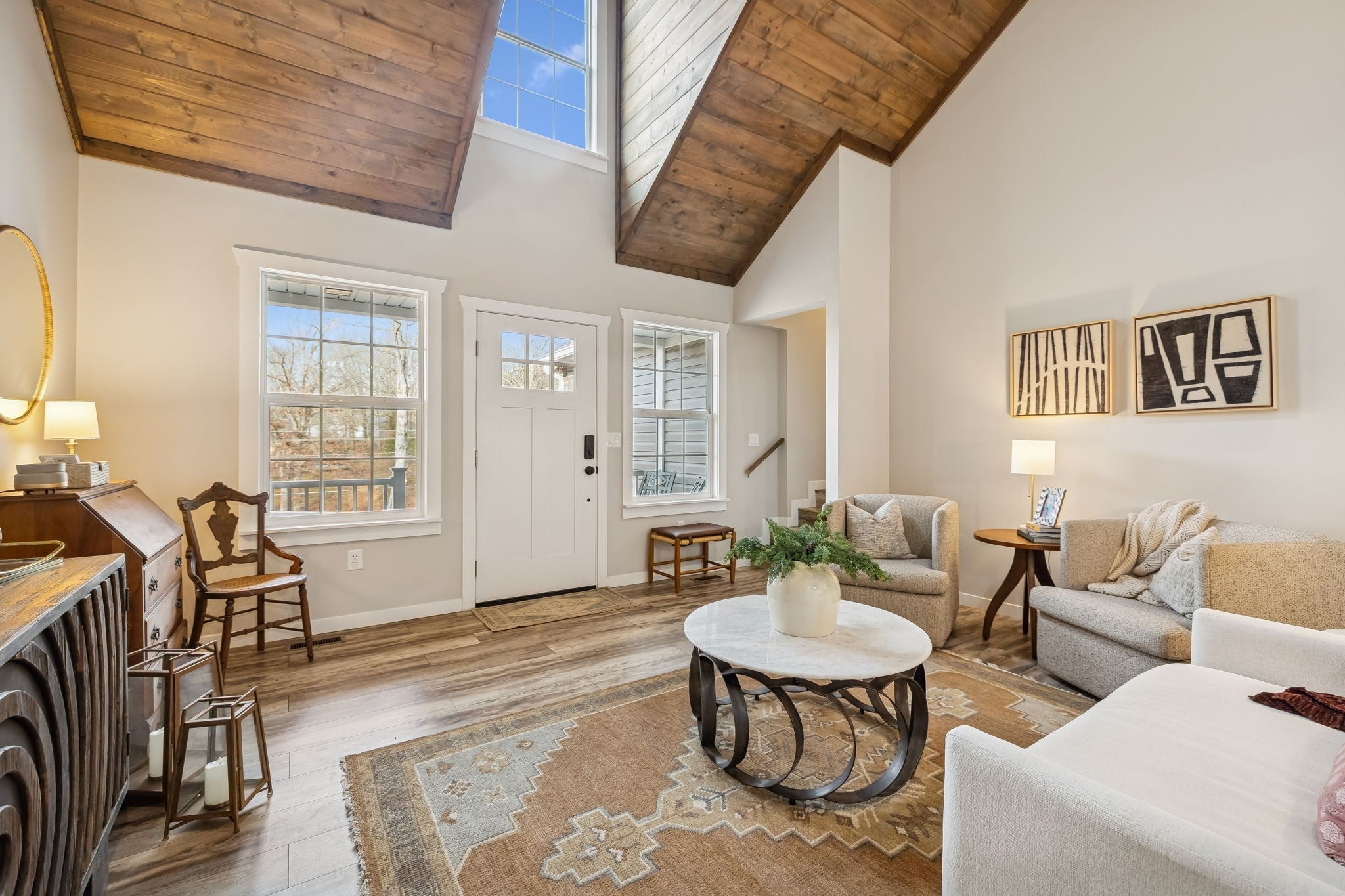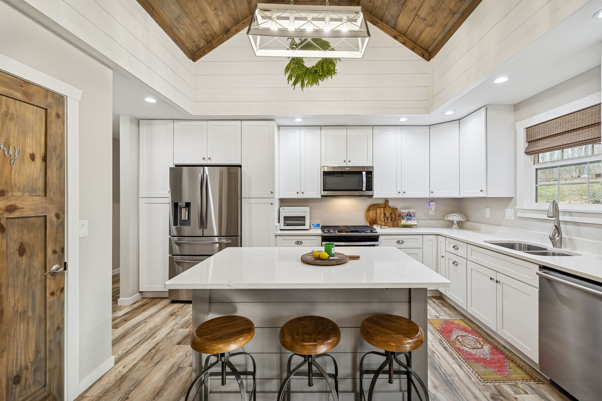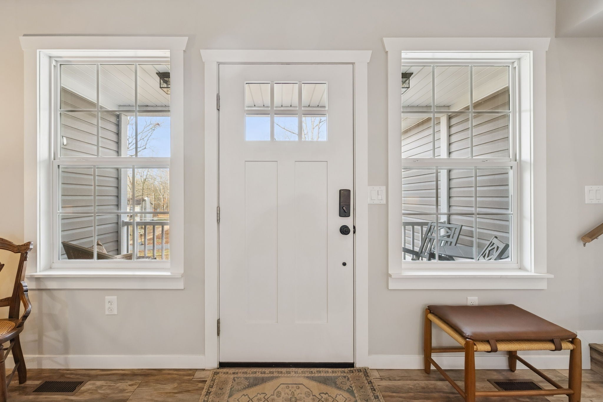 Built in 2020, this beautifully maintained home offers just over 2,900 square feet of well designed living space with 5 bedrooms and 3.5 bathrooms. Interior features include vaulted ceilings, LVT flooring, ceramic tile, and an open concept layout ideal for everyday living and entertaining. The kitchen features a large center island, stainless steel appliances, and abundant cabinetry and storage. Three bedrooms are located on the main level, including the primary suite and laundry room. A spacious flex room just off the main level provides excellent options for a bonus room, den, or additional bedroom. The upper level includes a full bathroom, living area, bedroom, and extensive storage, making it ideal for guests or an in law suite. Outdoor living is highlighted by a covered and screened back porch with cedar ceiling and decking overlooking a private wooded view. Additional upgrades include professional landscaping, a moisture controlled crawlspace, tankless water heater, mechanical room, and ample storage throughout. This home offers comfort, functionality, and quality construction in a desirable setting.