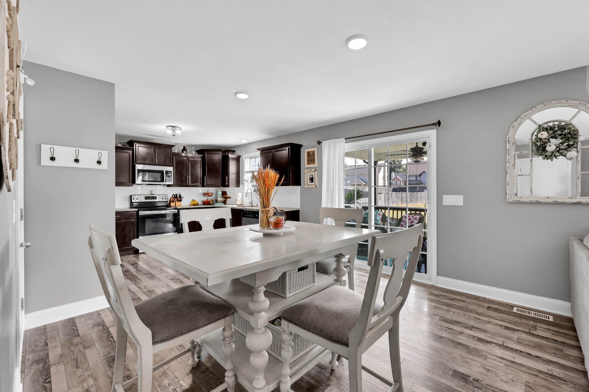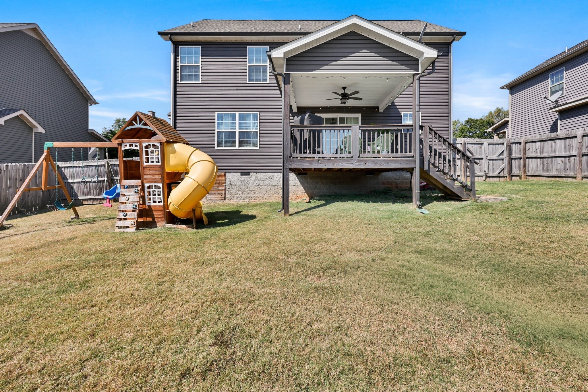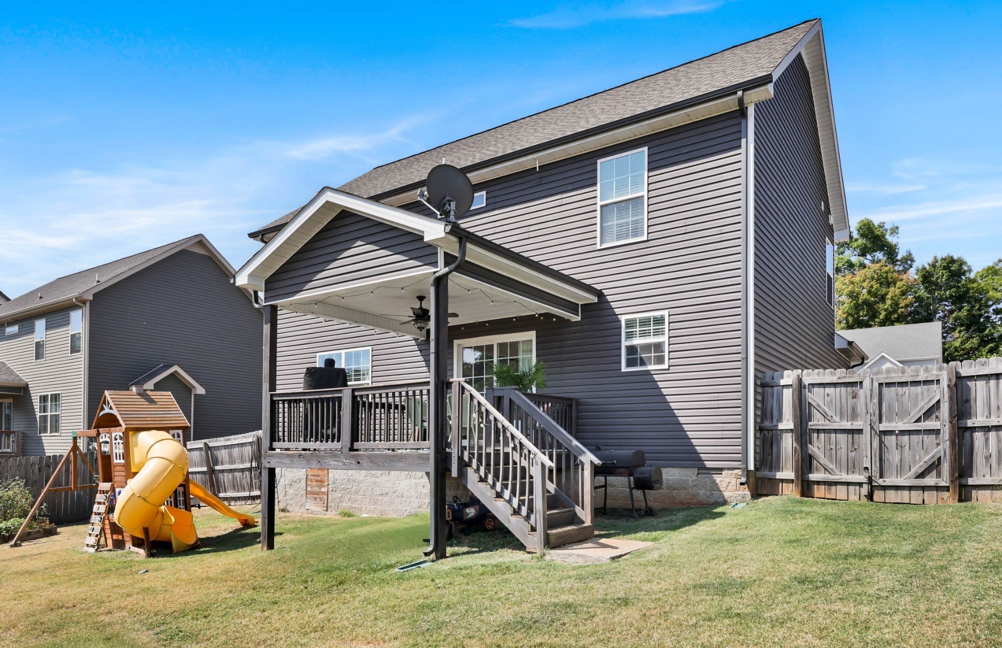 Seller to assist with closing costs! Located just minutes from Ft Campbell, this stunning home features an open-concept layout with a spacious living room and cozy fireplace. The kitchen is equipped with ample cabinetry, granite countertops, a stylish backsplash, and a pantry for additional storage. The primary suite offers a true retreat, complete with a walk-in closet and a luxurious bathroom that includes double vanities and a large tile shower. The third bedroom also provides extra storage and a walk-in closet. Home equipped with ADT alarm panel and downstairs window sensors. The fully fenced backyard is perfect for entertaining guests, providing a safe play area for children, or accommodating pets. The neighborhood enhances the living experience with a playground, dog park, and a variety of family-friendly holiday events. $3120 lender credit with preferred lender.