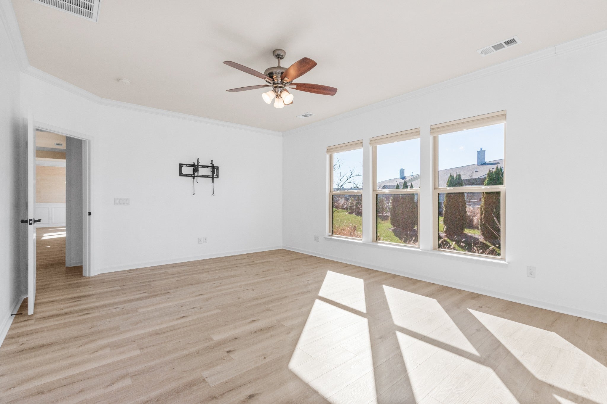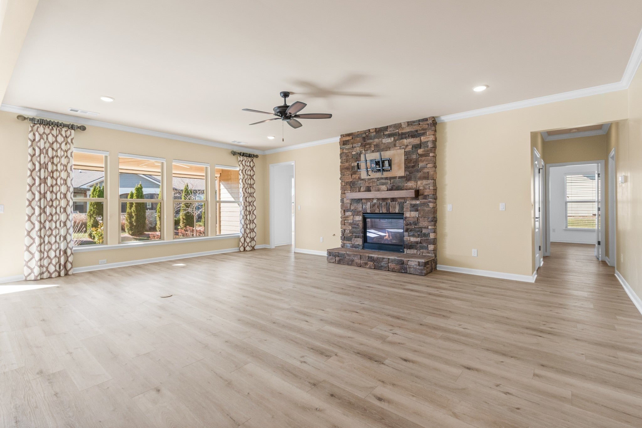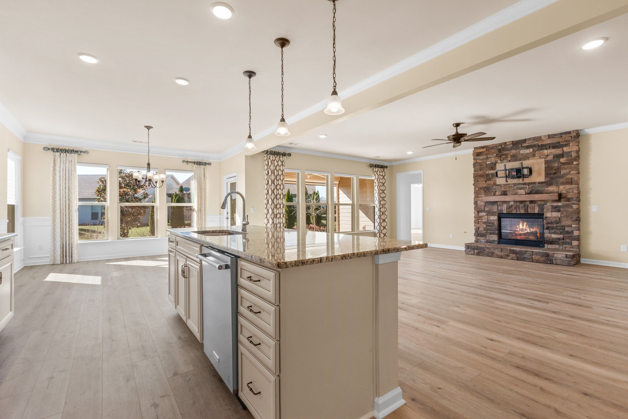Spacious open concept Dunwoody Way Model with a golf cart garage on a lavishly landscaped lot on one of the most desirable streets in Southern Springs by Del Webb 55+ active adult community. Crown moulding, wainscoting, ceiling fans, high end custom drapes, and stone gas log burning fireplace.All new LVP flooring, no carpet. Primary bath has double sink vanities, granite countertops, walk-in tile shower, linen closet, and separate water closet with bidet. Primary closet has modular closet system and tons of storage. Kitchen has granite countertops, dovetail drawers, soft close doors, roll out shelving, built-in microwave and oven, gas cooktop, tile backsplash, large island for entertaining, and walk-in pantry with custom shelving and pull out drawers. The flex room office has beautiful custom built-in shelving and desk area. Storm door at front entry. Professionally installed ionizer air cleaner on furnace, whole house surge protector at electrical panel, laundry room with custom built-in cabinetry and countertop. The large covered patio has ceiling fan and remote controlled Rainier retractable screens for increased privacy. The patio has a gas stub for connecting directly to your grill. Community has both indoor and outdoor pools, pickle ball, and tennis courts, gas fire pit, pavilion with gas grills and patio tables, clubhouse with fitness center and fitness classes, ball rooms, kitchen, conference room, card/game room, massage room, men's and women's locker rooms, and a dog park. Over 70 clubs and special interest groups, special programs, presentations, concerts, Southern Springs choir and band, as well as photography, painting, quilting, solo clubs, coffee club, Veteran's club, and so much more. Living in Southern Springs is like vacationing at a very active resort. Thirty-five minutes to/from BNA.
