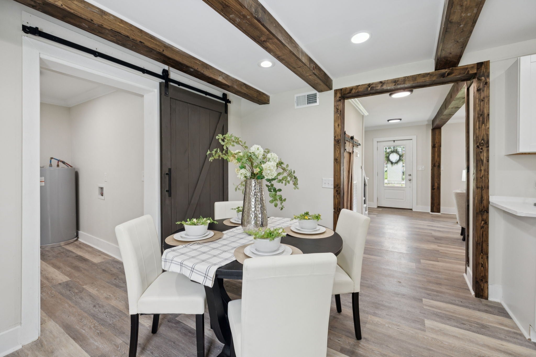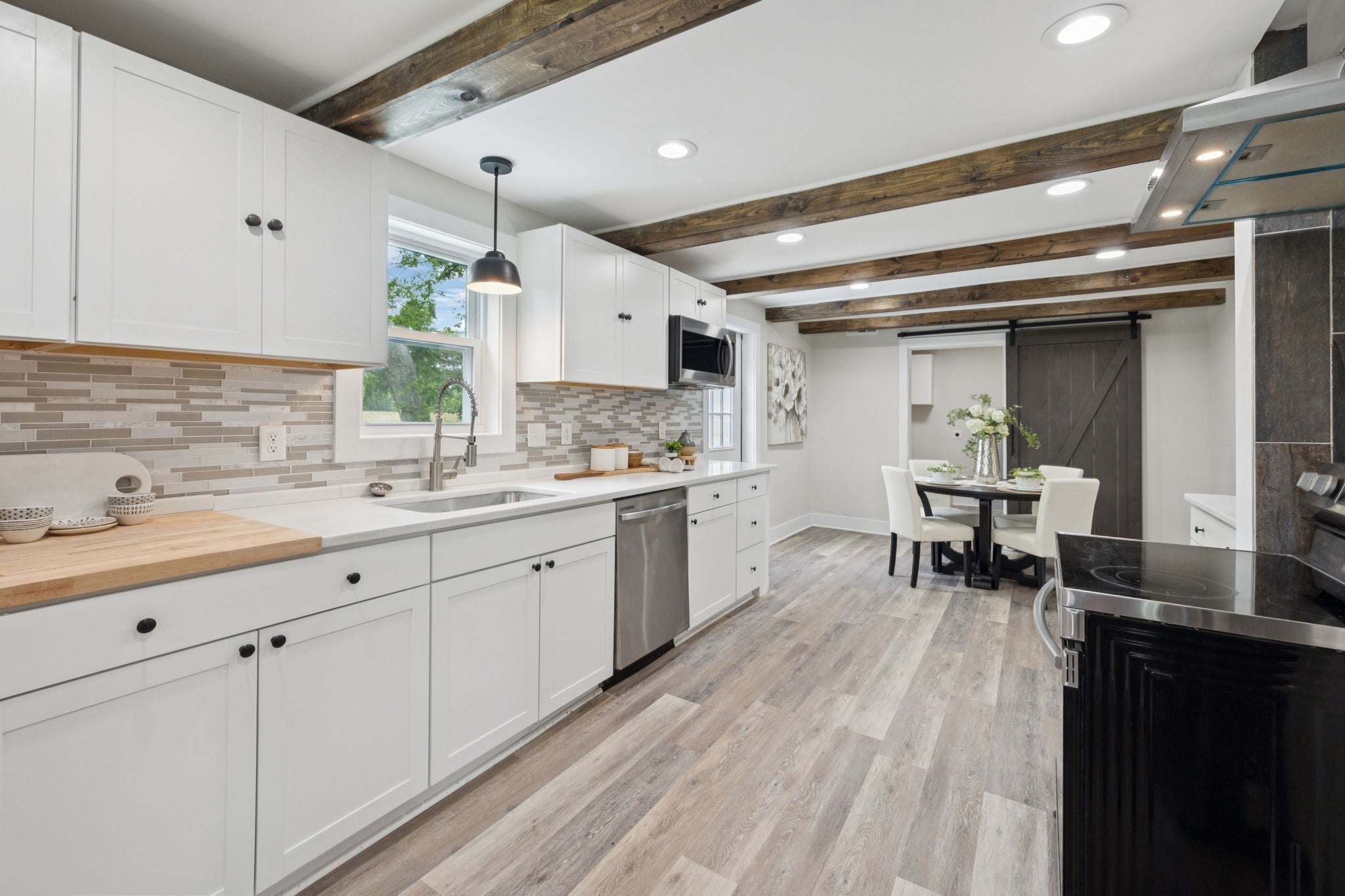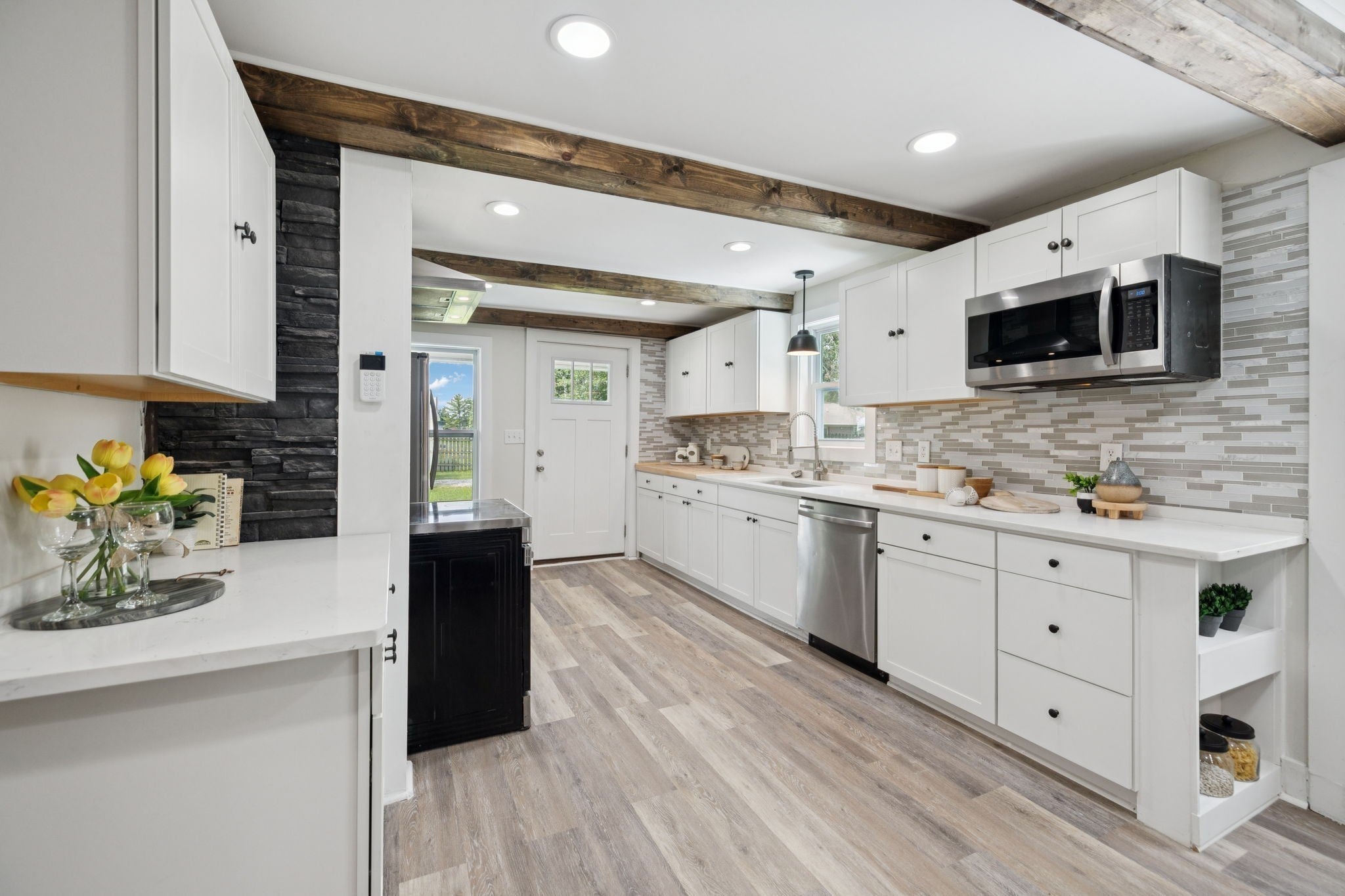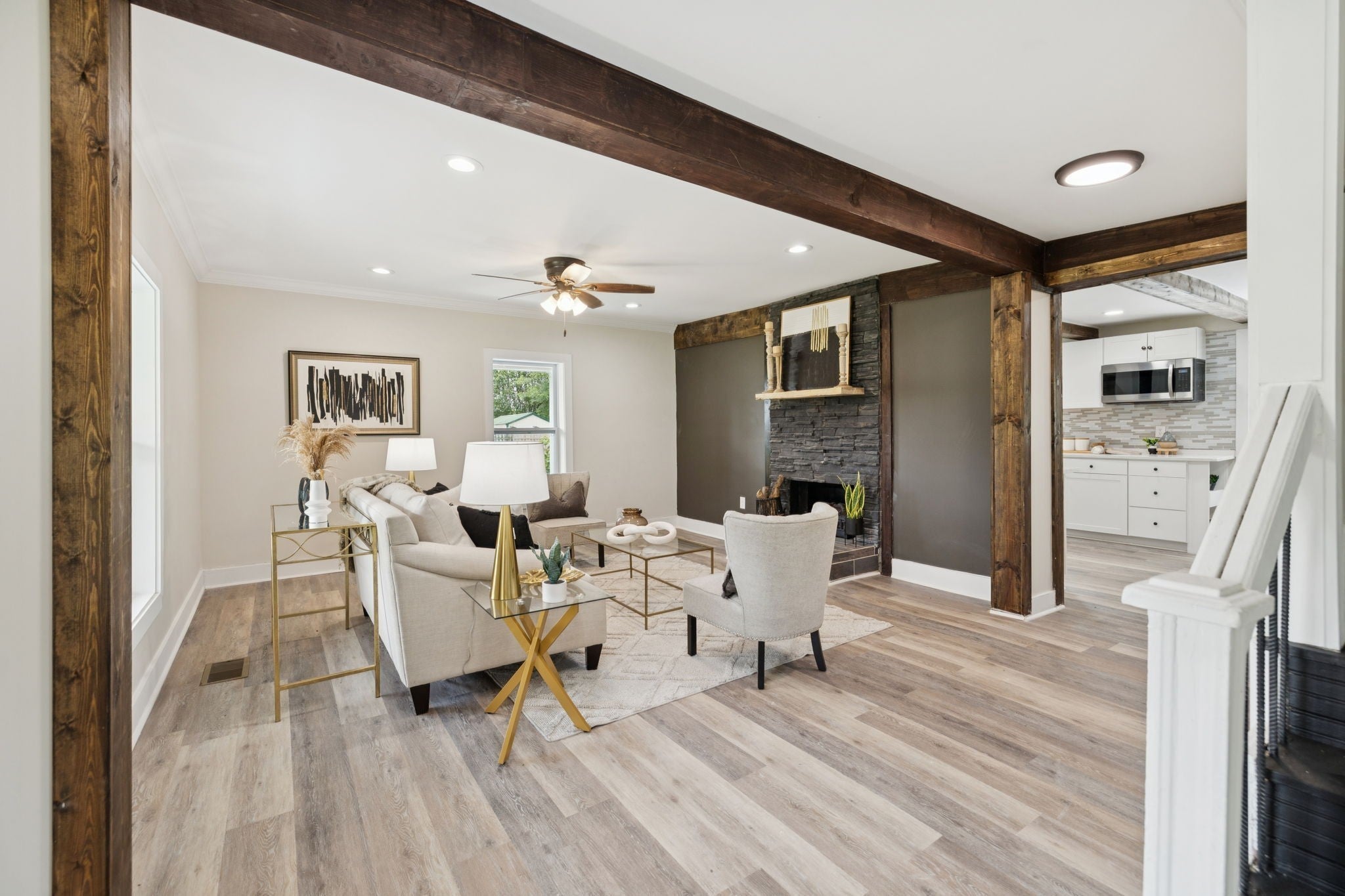 Tucked back in a peaceful country setting, this charming home blends vintage-inspired character with smart, functional updates. Sitting on a spacious lot with mature trees and room to breathe, it offers the serenity of rural life with easy access to both Manchester/I-24 and Downtown McMinnville. The wraparound porch welcomes you in, while inside you'll find thoughtful updates throughout: new LVP flooring, fresh paint, new cabinets, stainless steel appliances, wooden beams, and hard surface countertops. The redesigned main floor layout includes a cozy living room with a fireplace, an updated kitchen, and a flexible office or guest room with a closet. The primary bedroom is also on the main level and includes its own half bath. Upstairs, two bedrooms share a full bath, along with a bright window-lined flex space that offers endless potential: studio, reading nook, crafting corner, or quiet lounge. A large walk-in closet/room adds even more practical storage to the space. Outside, enjoy evenings on the large back deck or mornings on the front porch with a view of the open yard. The lot feels private and open, with space for a garden, pets, or just enjoying the fresh air. A brand new roof means one less thing to worry about. Fully renovated and move-in ready, this home has all the charm and updates of a modern country escape.