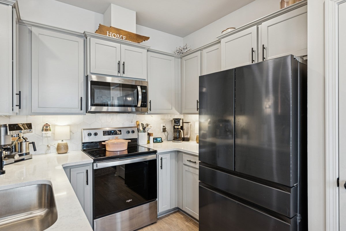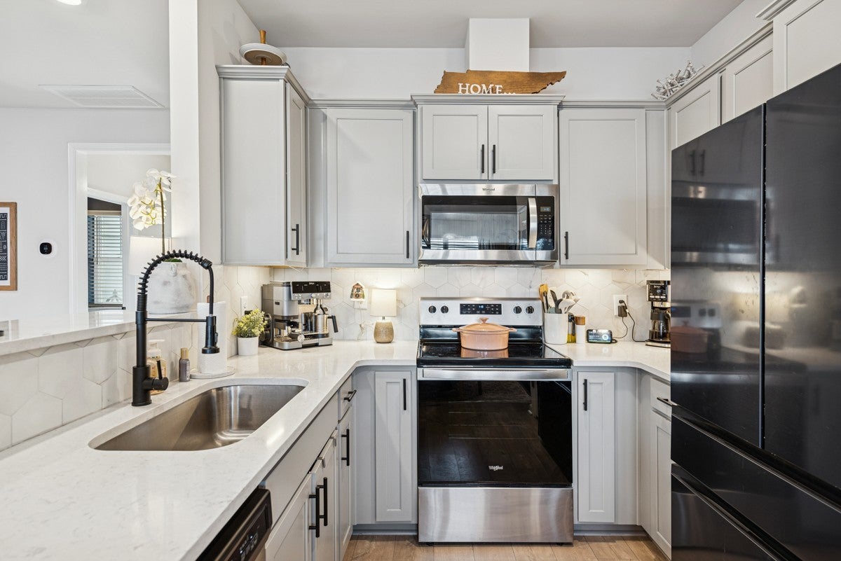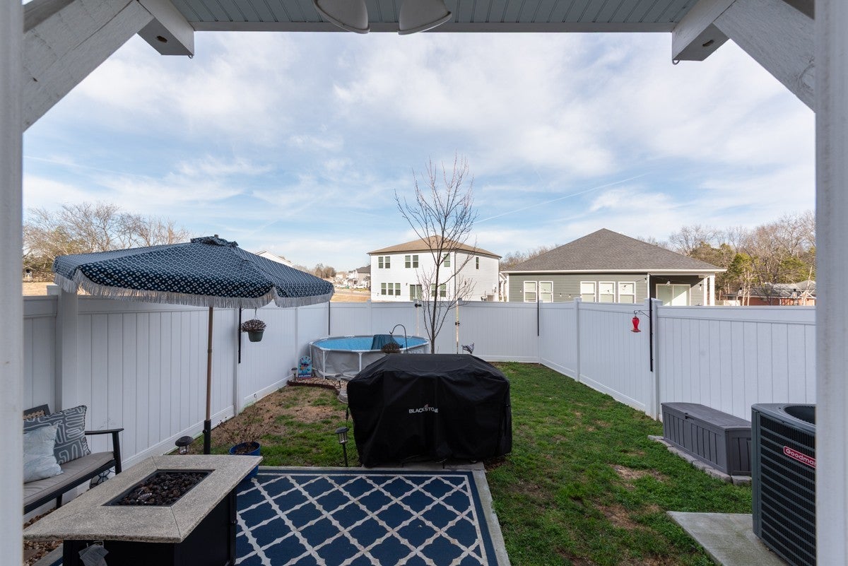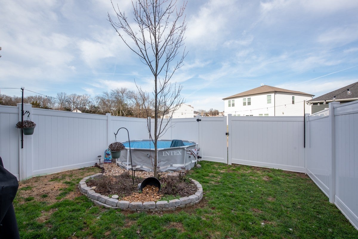 Come tour this beautifully maintained three bedroom, two and a half bathroom townhome centrally located between Nashville and Murfreesboro. Built in 2023 this is one of the only townhomes with a fully fenced in backroad. that features an above ground pool. With its unique and attractive dark gray exterior finish and interior accent walls, this home is the perfect starter home for any couple or new family! The main floor features an inviting open floor plan featuring a spacious living room with a dining area as well. Kitchen comes with all appliances and even has a pantry. With stainless steel appliances, ample cabinet space, and granite countertops, this home will be one you will love living in; especially with a Samsun Bespoke Refrigerator that is only two years old. Upstairs you will find all three bedrooms along with two bathrooms and a walk in laundry area. The primary bedroom features an en suite bathroom with walk in shower and double vanities. It also features a very spacious walk in closet that has a door leading directly to the laundry room. The upstairs also features a separate linen closet. Upgrades include black hardware throughout the home along with wiring for an electric car charging station. The HVAC system is a dual-zone with separate thermostats for upstairs and downstairs, featuring upgraded smart thermostats.