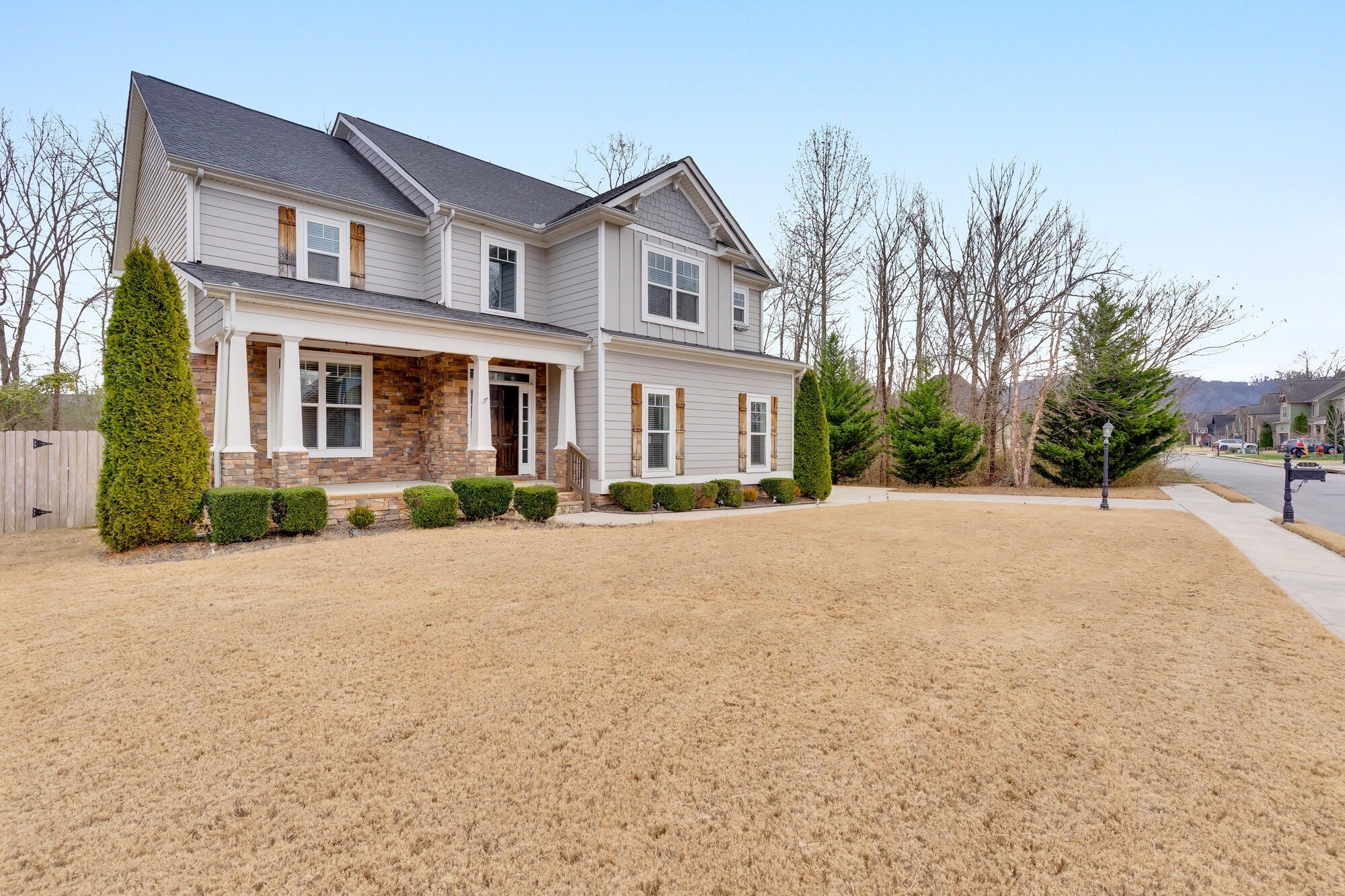 Love where you live in one of the best cul-de-sac lots in Stonewall Farms, offering exceptional privacy and a peaceful setting. This thoughtfully designed home features open-concept living with hardwood floors throughout the main level and fresh interior paint that creates a bright, move-in-ready feel. The spacious living area is anchored by a gas fireplace, perfect for cozy evenings and effortless entertaining. The large dining room provides ample space for hosting gatherings, while the kitchen flows seamlessly into the main living areas and out to the screened-in back porch, ideal for enjoying the outdoors year round. Step outside to a fully fenced backyard, offering both privacy and room to relax or play. The generous primary suite is a true retreat, highlighted by a beautiful detailed tray ceiling and ample space to unwind. Upstairs, professionally cleaned carpet adds comfort and convenience, while the layout offers flexibility for additional bedrooms, home office, or bonus space. Additional highlights include EV charging in the garage. Located in a well established neighborhood close to grocery stores, the lake, and Chester Frost Park, this home delivers the perfect blend of comfort, style, and location.