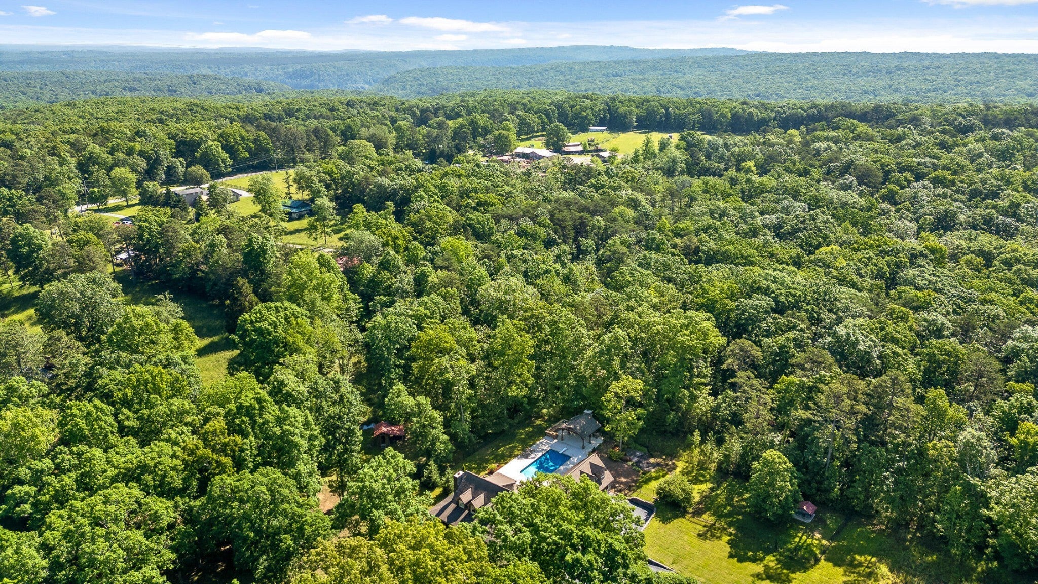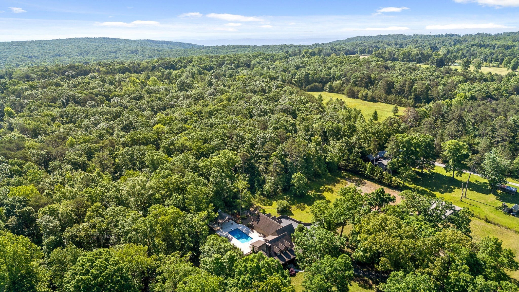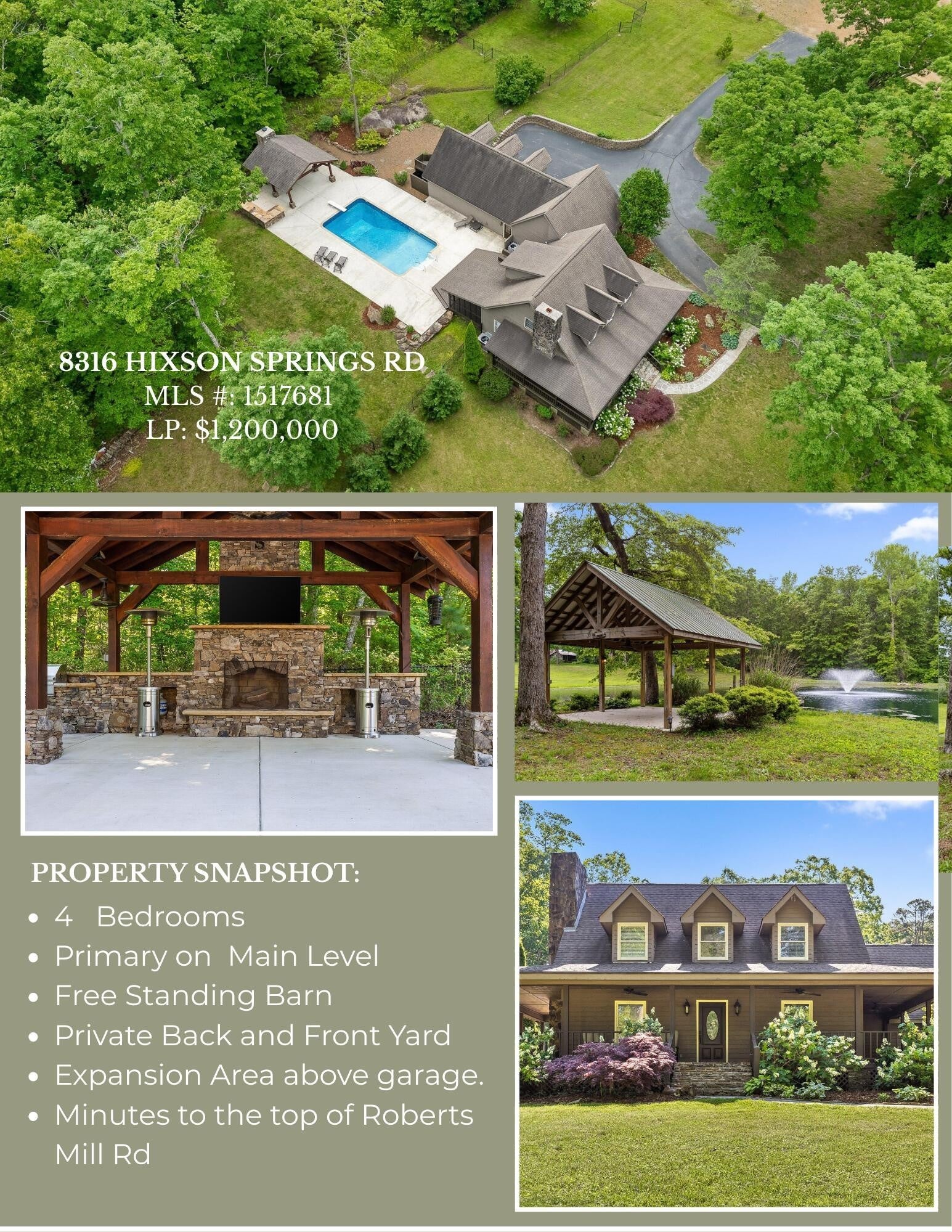 A stunning mountain retreat nestled on 8.3 acres conveniently located on Signal Mountain is waiting for you !! Although private in location, you're approximatly 20 minutes from the heart of Signal Mountain and your favorites, such as grocery store, The Bread Basket, and Signal Mountain Golf & Country Club. Hwy 27 and Hwy 153 are only 15 minutes away via Roberts Mill Rd. Easy access to Hixson, Northshore, and Downtown Chattanooga. For the hiking and biking enthusiasts there are multiple trails near by to enjoy. The possibilities are endless for this gorgeous property, with No HOA restrictions. Divide and create your own family community, grow beautiful vegetables and raise your favorite farm animals. The extra large enclosed 1224 sq ft free standing barn/garage, with separate office and RV carport is an amazing feature to this already perfect estate. You will have plenty of spaces to tinker on projects, use as a gym, or additional storage area. You may see it as a Barndominium for its future !! The private pond is stocked for your fishing relaxation with its own private pavilion on the waters edge. The back yard of this wonderful home is private and perfect to enjoy the exceptional outdoor entertaining spaces including an in-ground pool, outdoor kitchen with grill, green egg, and fireplace under the fabulous large gazebo and even an outside shower area. There is a screened-in porch, and partial wrap-around front porch on the home to relax on as well. This home features the primary bedroom on the main level, 3 living areas, stacked stone mountain fireplace, eat-in kitchen, room for expansion in the unfinished area above garage and MUCH MORE! And YES ! It is Zoned for award-winning Signal Mountain schools. Visit Today and be amazed !!