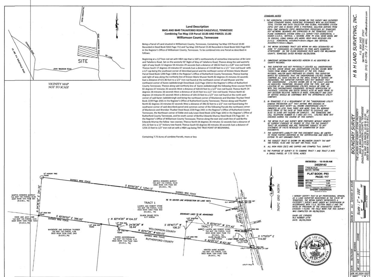 Discover serene rural living on this beautiful 7.73-acre Williamson County, TN property, consisting of two tracts sold together. The first tract (.96 acres) features a fully renovated, move-in-ready 2-bedroom, 1-bathroom home spanning 815 sq ft. The adjoining 6.77-acre tract includes an identified 6–7 bed soil site (suitable for drip system), offering excellent potential for expansion or a future build. Framed by peaceful woodlands with cleared pasture and preserved mature trees for privacy and natural beauty, the property also benefits from a new 24” culvert along the road frontage, a fresh driveway, and thorough site clearing. The move-in-ready home boasts recent exterior updates in 2024 including a new roof, gutters, front porch, door, and fresh paint. Interior upgrades feature new HVAC, hot water heater, insulation, electrical, PEX plumbing, refinished oak hardwoods, vaulted living room ceiling, custom kitchen cabinets with quartz countertops and new appliances, plus a refreshed bathroom with new vanity, fixtures, toilet, and tiled shower. Zoned for top-rated College Grove Elementary, it's just 8 minutes to I-840, 20 minutes to Franklin or Murfreesboro, 10 minutes to Arrington Vineyards, and 12–15 minutes to premier golf courses. Downtown Eagleville is 12 minutes away. Your peaceful Tennessee paradise awaits—rural charm with modern convenience.