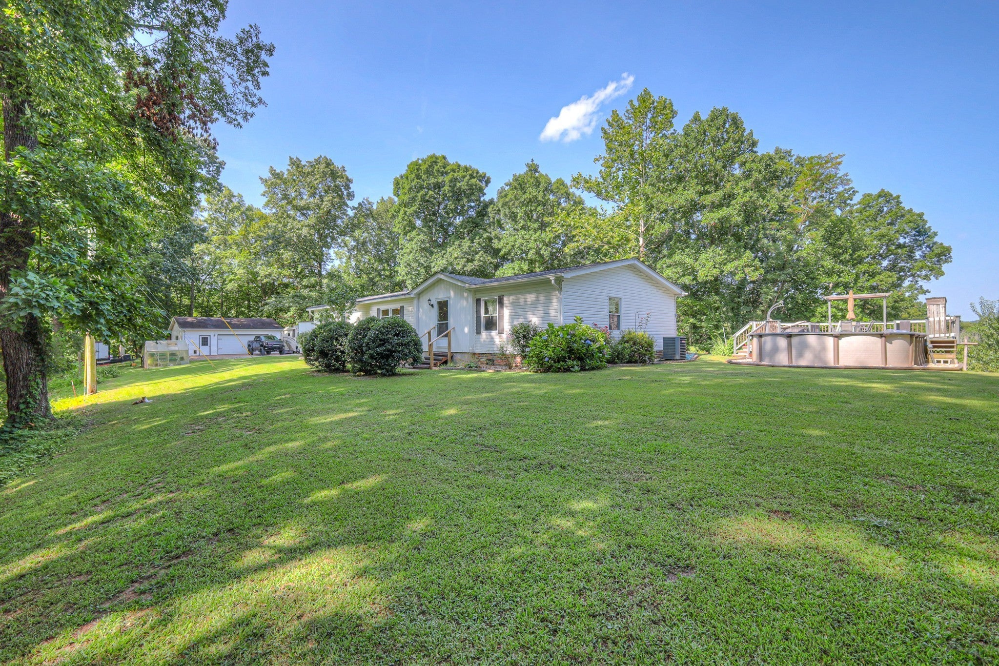 That view is everything! This home is perched on a ridge in Culleoka, yet you’re still only 10 minutes from I-65. Imagine waking up in your primary suite to stunning sunrises. The bathroom is oversized with tile floors, dual Jack-and-Jill vanities, and a spacious walk-in closet. The den features a cozy pellet/wood-burning stove along with built-in storage and a handy drop zone for all the kids’ gear. With an open floor plan, vaulted ceilings, and a breakfast bar that connects to the kitchen pass-through, entertaining feels effortless. From your kitchen window, watch wildlife stroll by or step out to enjoy the peace of your acreage. Every bedroom comes with its own walk-in closet, and Bedroom 2 even includes a flex space that could easily be converted into a 4th bedroom, if you need it. Outside is where this property truly shines—relax around the pool and deck, tend to your garden areas and fruit trees, or keep chickens in the large coop and hen house. There’s also a pergola, a two-car side-entry garage with plenty of storage, and even 220 power hookup for your toys or equipment. The property spans 17+ acres with tasteful landscaping, trails to explore, plus Greenbelt protection for those extra tax savings. Roof and HVAC are newer, so you’re all set to enjoy country living with modern comfort.