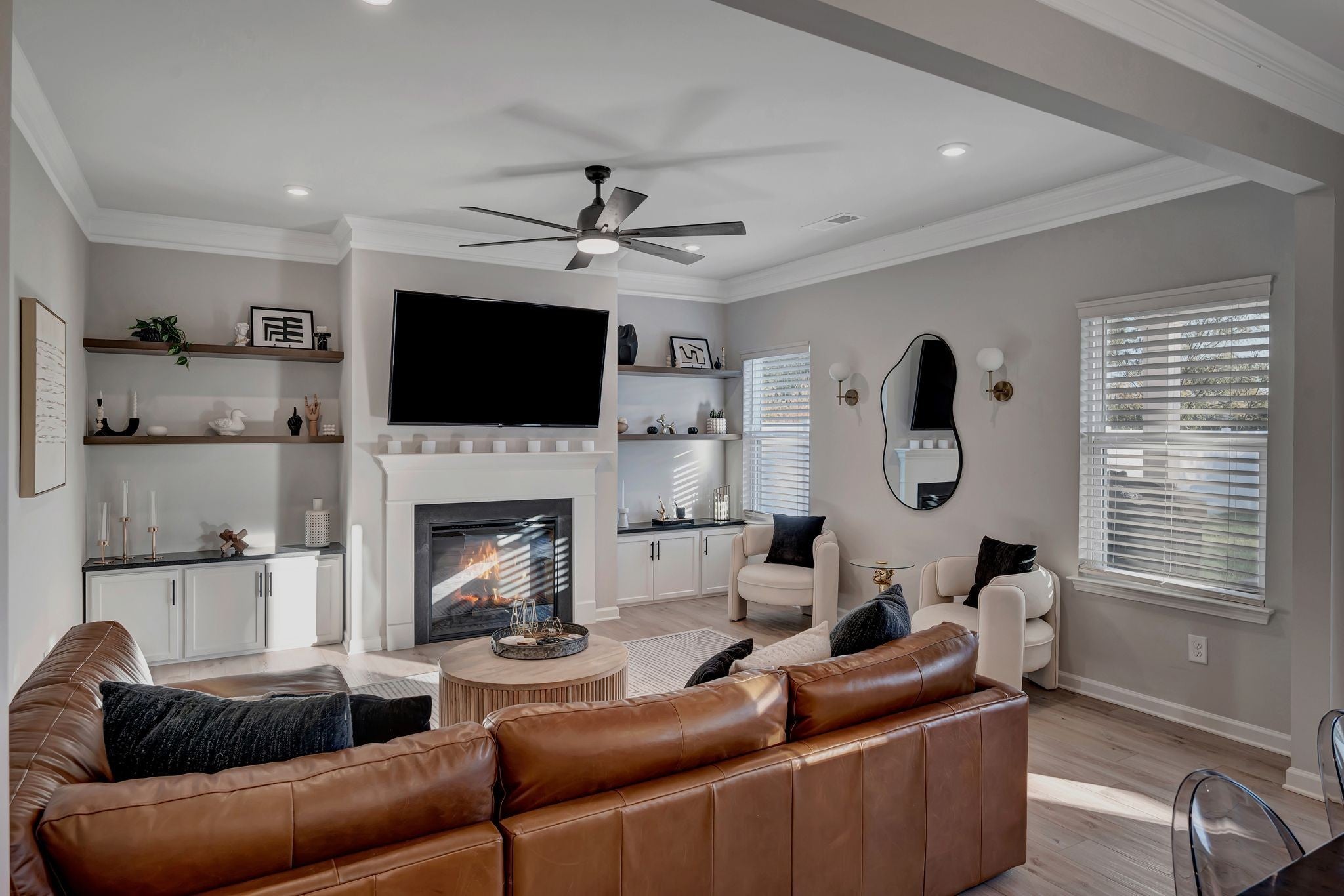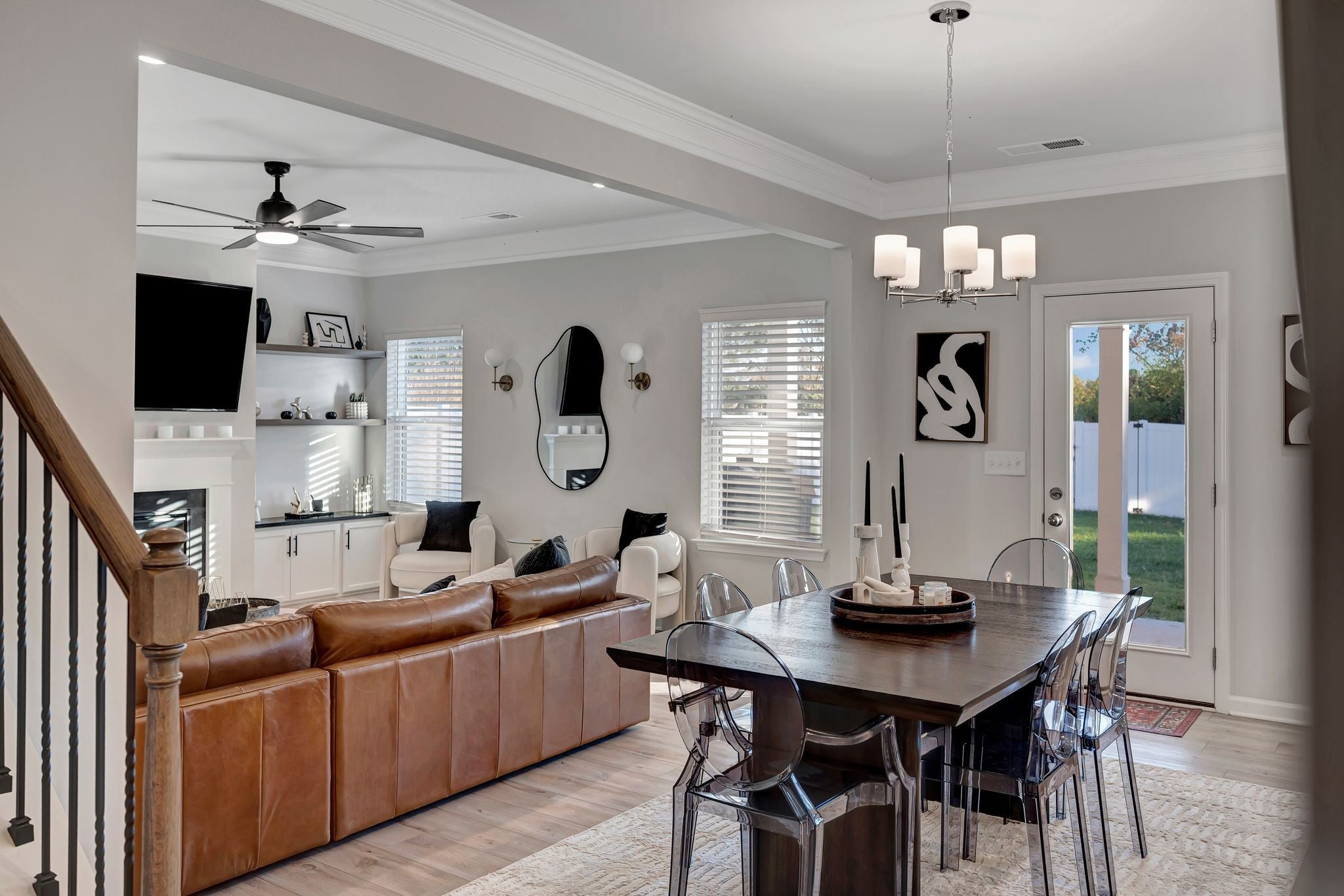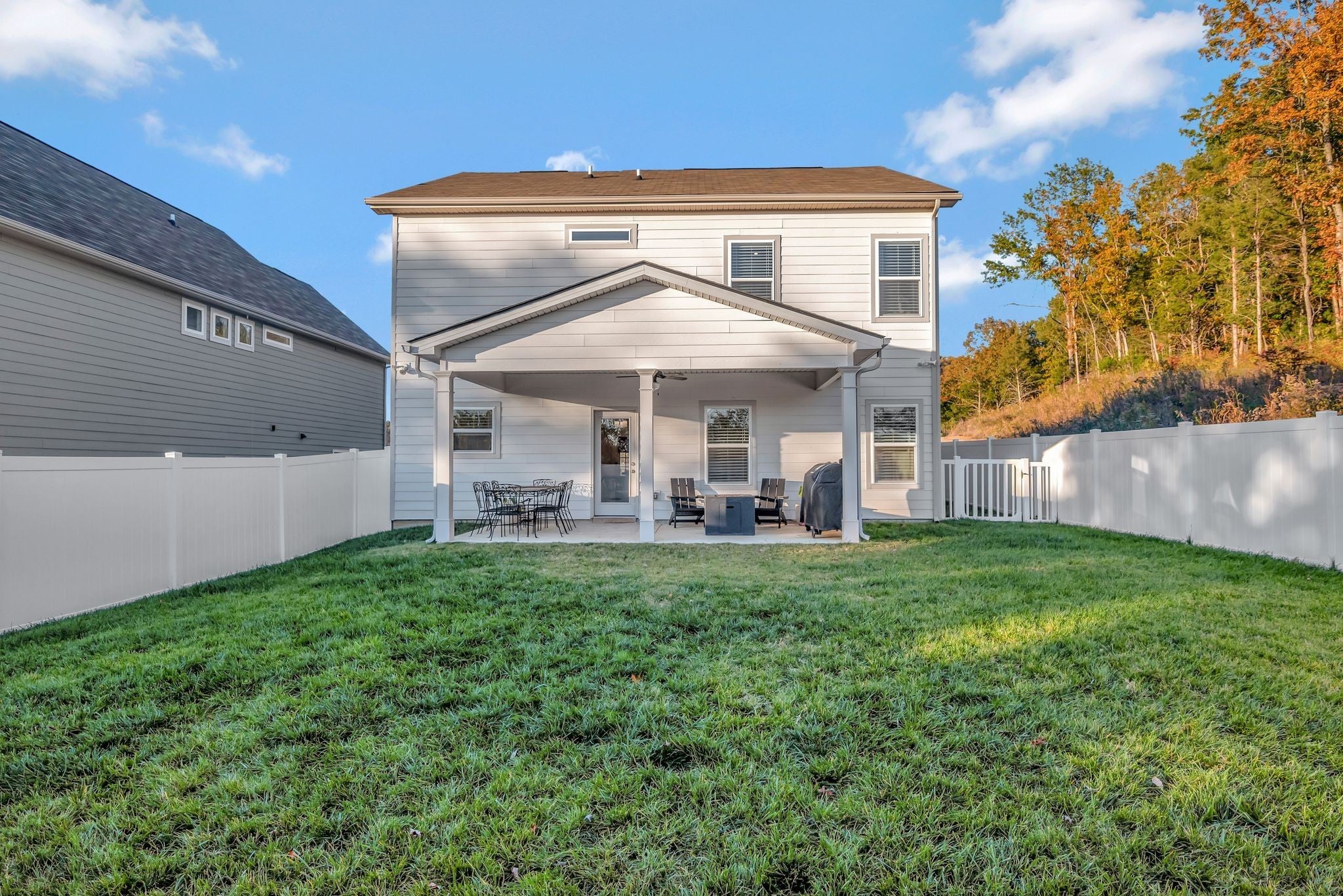 Welcome to this exceptional 2023 built home in The Crossing at Drakes Branch where modern design meets meticulous care | This spacious 2053 square feet of thoughtfully designed living space has 4 bedrooms 2.5 baths and a 2 car garage that feels better than new enhanced by numerous builder and owner upgrades | The main level showcases elegant crown molding, a warm electric fireplace, and stunning granite built-ins with custom shelving in the living room, perfect for both everyday living and entertaining | The open concept layout and kitchen with an island flow seamlessly to an extended covered patio, ideal for relaxing or hosting friends and family outdoors | The fully fenced backyard features a white vinyl fence and irrigation system covering the entire lawn gives both beauty and ease of maintenance | Upstairs, all bedrooms are outfitted with contemporary ceiling fans, providing comfort and style throughout | The primary suite is spacious and inviting with the modern finishes and generous walk in closet space | The garage has been upgraded with an epoxy coated floor and painted walls creating a clean and functional space | Every detail of this home reflects pride of ownership and thoughtful enhancements beyond standard builder offerings | This move-in-ready home combines modern construction, premium upgrades, and impeccable maintenance | Don't miss your opportunity to own a like-new home without the wait!