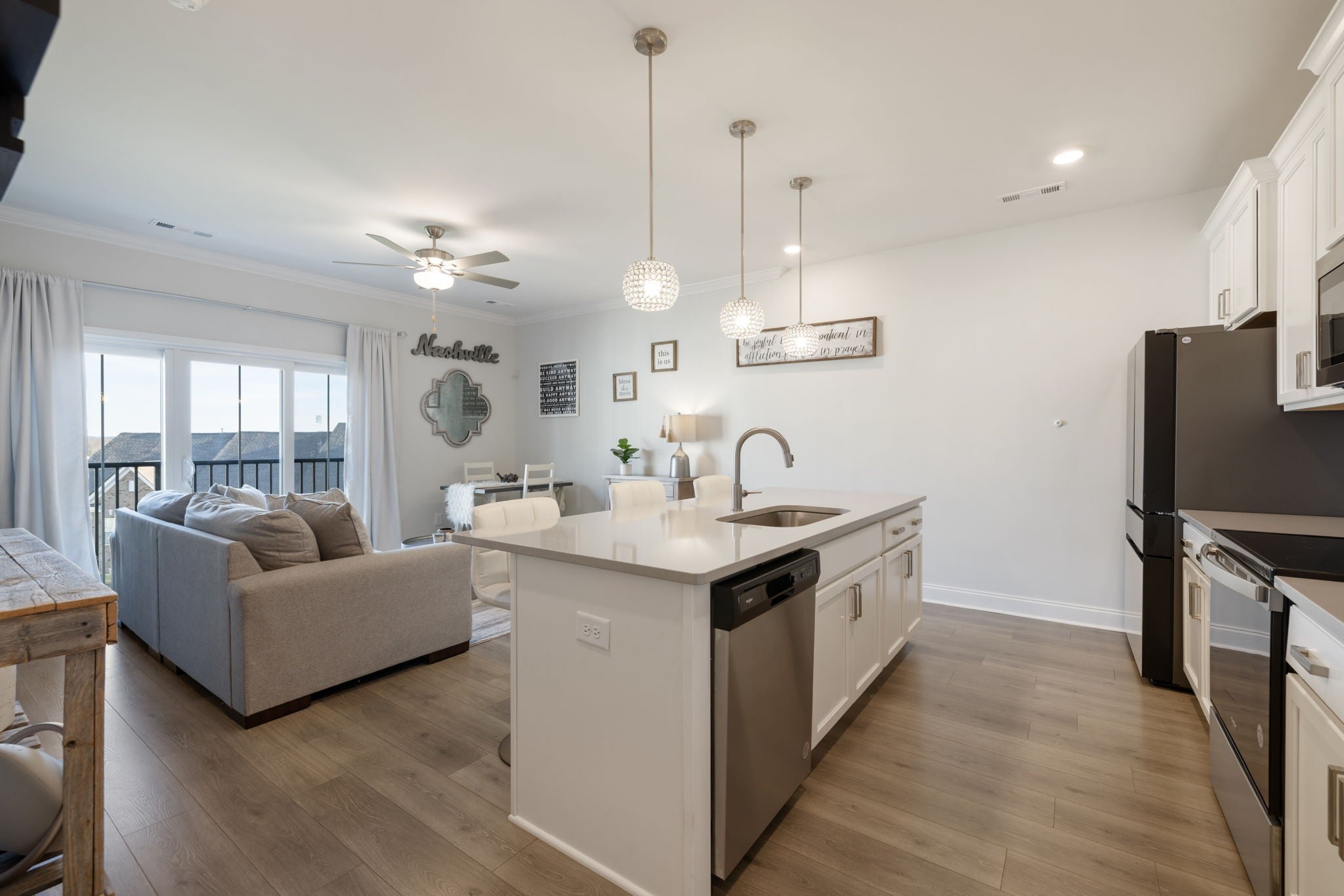 Welcome to Ridgeview 20 at Burkitt Ridge. This nearly new, thoughtfully designed townhome offering modern comfort, flexible living, and an exceptional location is just minutes from Nolensville-Brentwood line, the new outlet malls, and an easy commute to Nashville, I24 and Nashville Airport. This stylish 2-bedroom, 2.5-bath townhome offers 1,820 square feet across three well-planned levels, plus a 2-car garage and beautiful views of the Tennessee Hills. The entry level features a flexible living area perfect for a home office, sitting room, or media lounge, along with a convenient half bath and additional storage. The main living level features a bright open-concept kitchen and living space designed for entertaining, anchored by a large island with bar seating. The adjoining area offers flexibility for dining or lounging and is currently styled as a comfortable sitting and dining space overlooking beautifully maintained community green space. Upstairs, the top level is dedicated to privacy and comfort with two ensuite bedrooms and a centrally located laundry area. The spacious owner’s suite includes room for a king-size bed, a dedicated office nook, walk-in closet, and a sleek bath with a walk-in shower. Open the Juliet balcony to enjoy peaceful sunrise views and scenic overlooks of landscaped green space and rolling Tennessee hills. A second bedroom with its own full bath & walk in closet completes the home. Additional highlights include charming Juliet balconies on both the main and upper levels and a front porch that faces the community green space—creating a welcoming entry and a quiet outdoor retreat. Located on the Brentwood–Nolensville line, Burkitt Ridge offers walking trails, green space, a dog park, nearby retail and restaurants—all with quick access to interstates, shopping, and downtown Nashville. This beautiful home can be sold fully furnished for a quick turn-key investment option. Don't miss this exceptional opportunity.