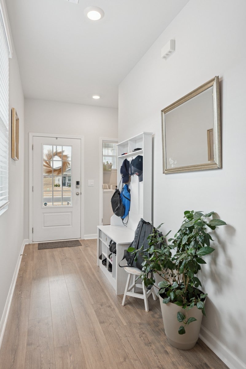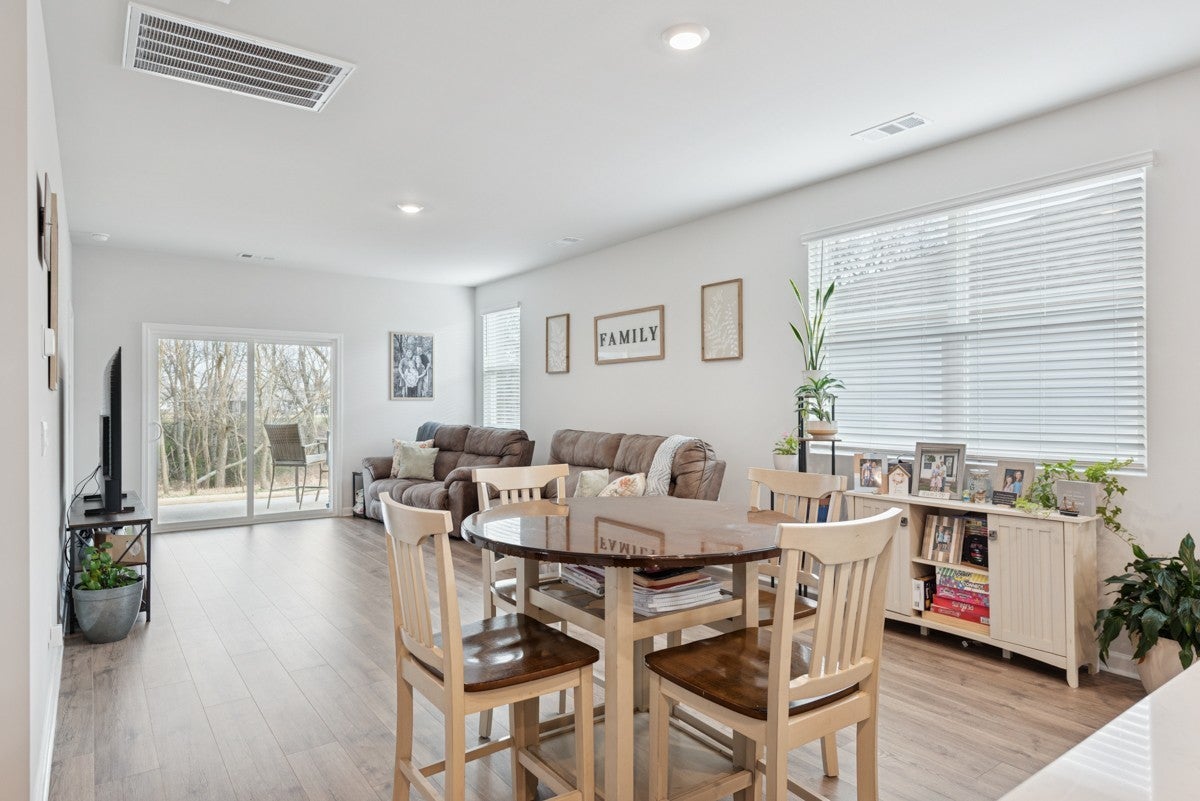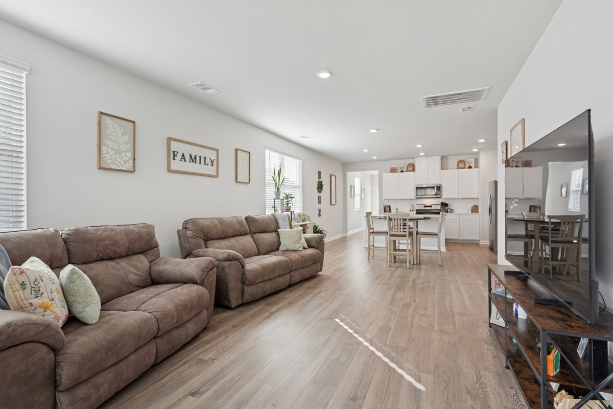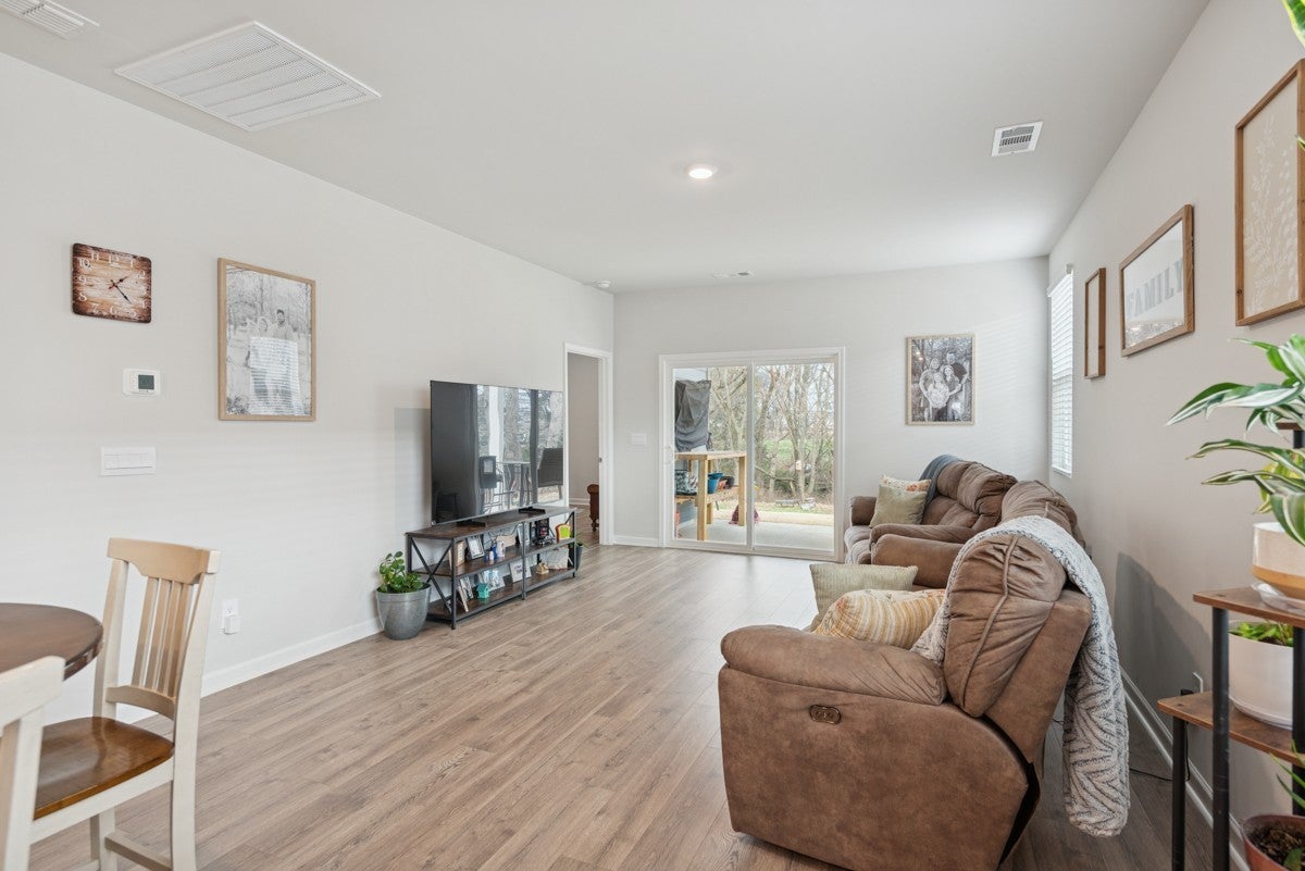 Welcome to this pristine, like-new home—only two years old and meticulously maintained, it shows as if it were brand new. Built by DR Horton, this home features the popular Jennings floor plan with an open-concept design and soaring ceilings throughout. This single-level home offers three bedrooms and two full baths. The gourmet-style kitchen is a standout, featuring granite countertops, a gas cooktop, a spacious pantry, and an oversized island perfect for entertaining. The open layout flows seamlessly into the main living area, enhanced by recessed lighting and stunning windows that fill the space with natural light. Situated on a premier lot, the home backs up to a peaceful wooded area with a creek, providing both privacy and beautiful views. The spacious primary suite includes a large walk-in closet and a well-appointed en-suite bath. Both guest bedrooms feature extra-large closets, offering ample storage. Additional highlights include laminate hardwood flooring throughout, high ceilings, attractive cabinetry, and a generously sized garage—ideal for a workshop, man cave, or she-shed setup. The community offers exceptional amenities, and the HOA conveniently covers lawn care, making for truly low-maintenance living. This home has just hit the market and won’t last long—schedule your showing today!