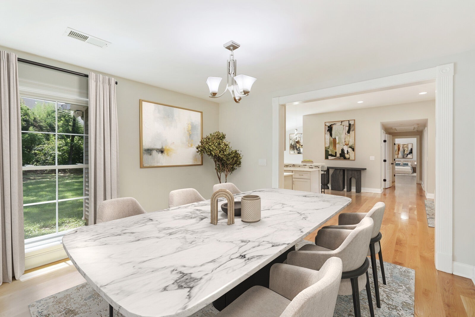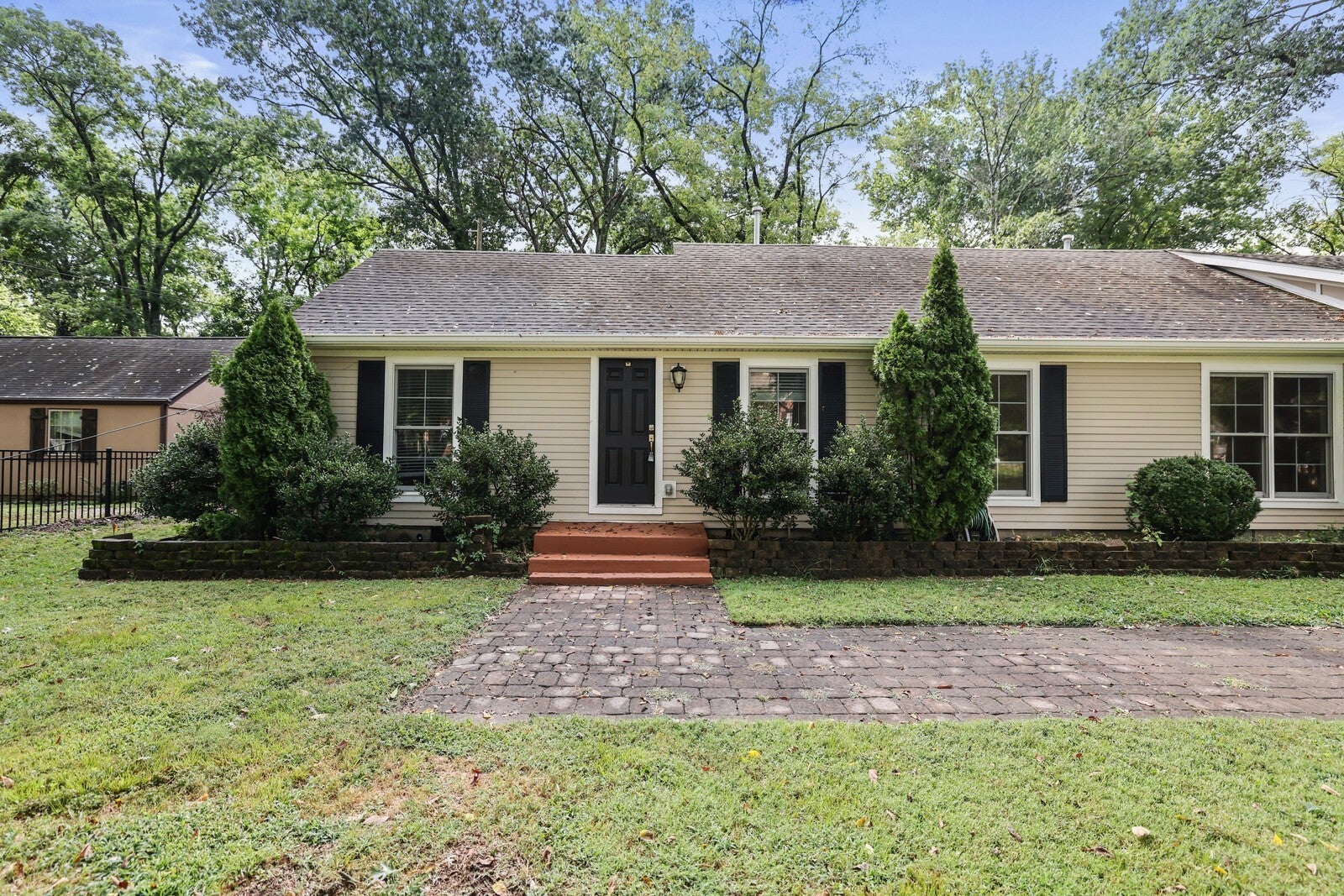 Welcome to this beautifully renovated 1940 ranch-style home nestled in the sought-after West Meade neighborhood. Set back from the street on a generously sized lot, this home offers both privacy and charm with its covered front porch, mature landscaping, and a warm, welcoming presence. Step inside to discover a grand open floor plan designed for effortless flow and comfortable living. The spacious living areas are complemented by gleaming hardwood floors, fresh paint throughout, and modern updates that enhance the home’s timeless character. The kitchen is a standout, featuring stainless steel appliances, rich cabinetry, and a large island with bartop seating, perfect for gathering and entertaining. A sunny eat-in dining area invites you to enjoy relaxing or entertaining. The primary bedroom is a true retreat, offering ample space and a beautifully appointed en-suite bathroom complete with split dual vanities, a soaking tub, and a separate shower. Additional bedrooms are generously sized and thoughtfully designed for comfort and functionality. One of the home’s most versatile features is the in-law suite, which has its own private entrance, making it ideal for guests, extended family, or even rental potential. The suite includes tile floors, plush carpeting, a full kitchen with dark wood cabinets and stainless steel appliances, and plenty of space for relaxing or entertaining. The home also includes a covered carport. With its combination of classic architecture, thoughtful renovations, and flexible living spaces, this home offers an exceptional opportunity in one of Nashville’s most desirable neighborhoods. Flood insurance required.