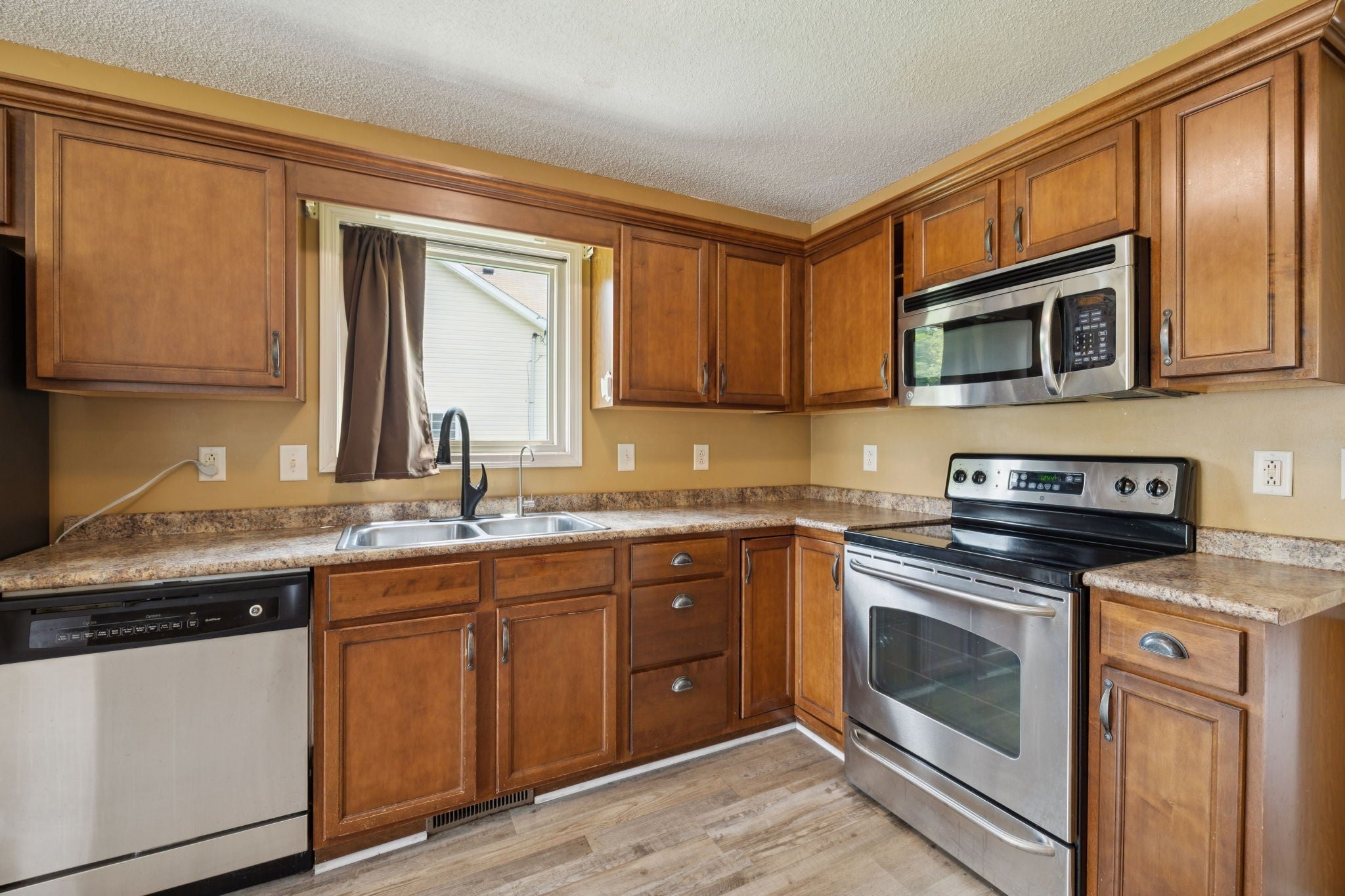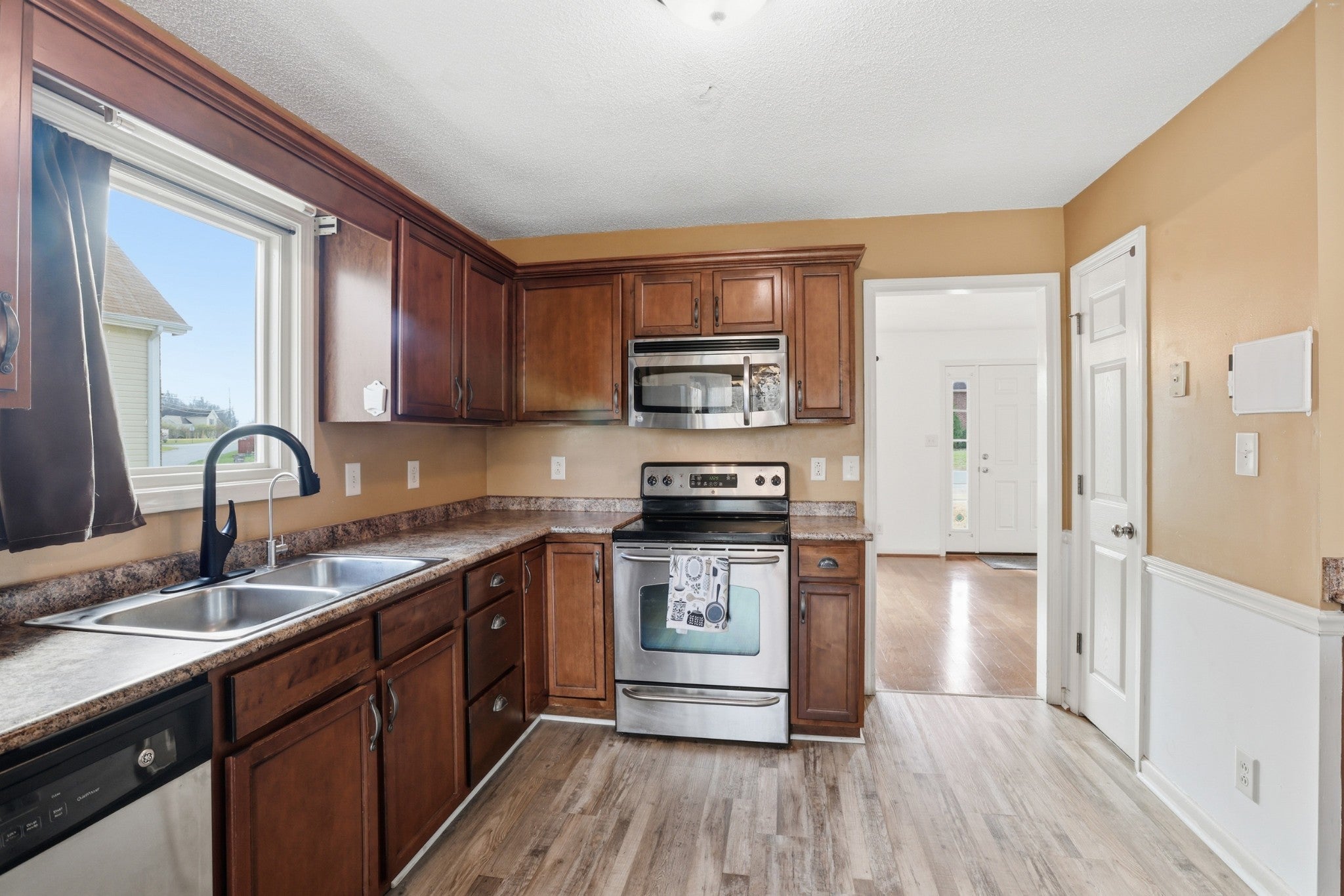 - Electric Oven, Range, Dishwasher, Dryer, Microwave, Refrigerator, Stainless Steel Appliance(s), Washer
