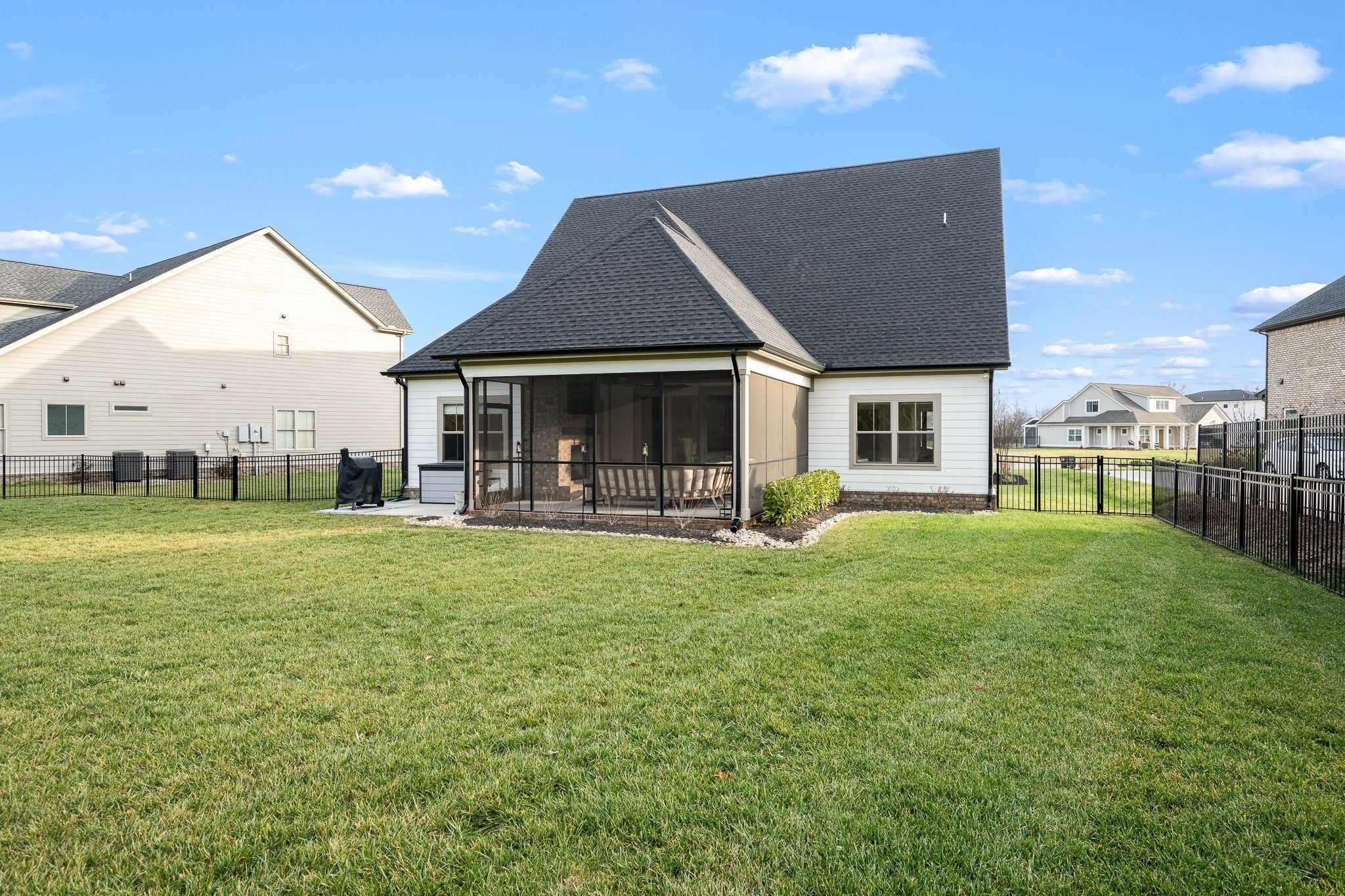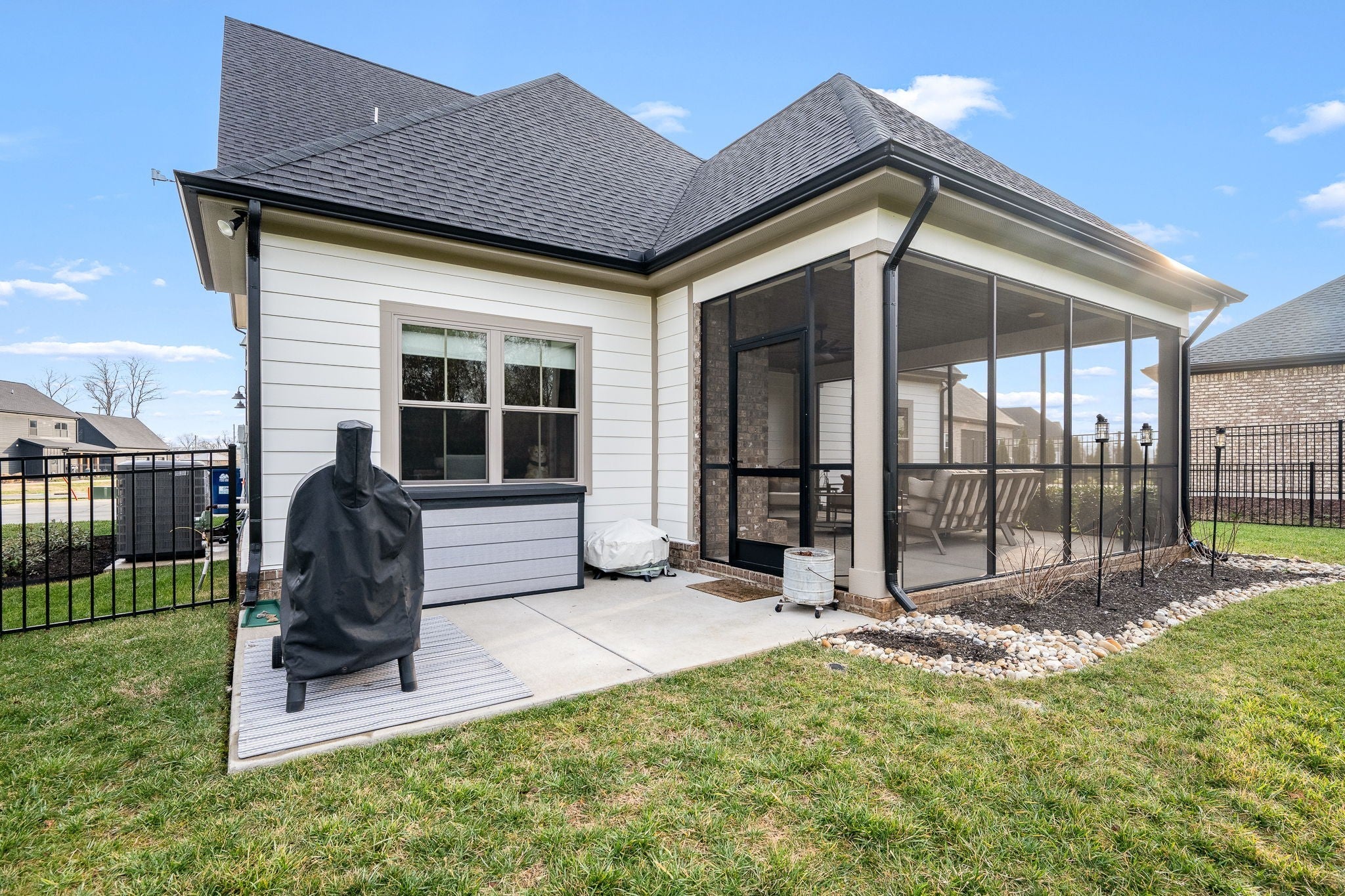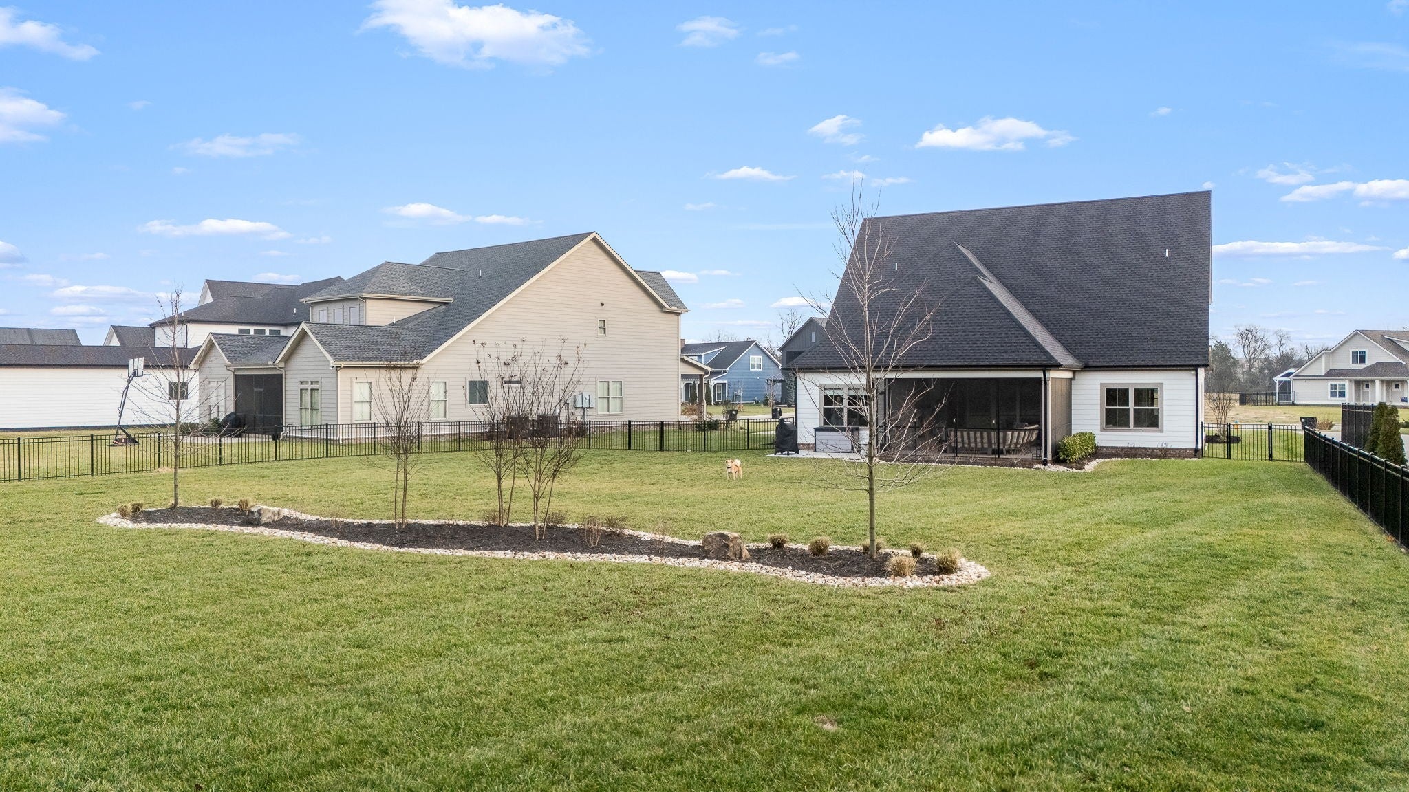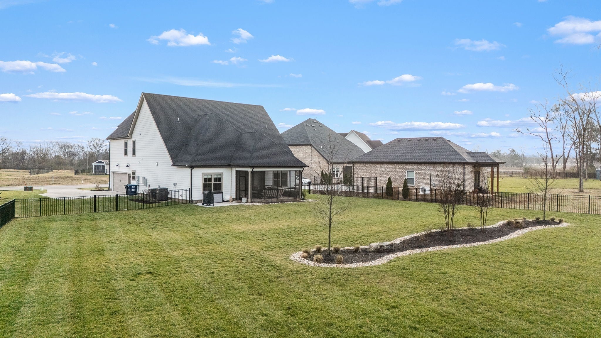 Built in 2023, this transitional-style home offers a thoughtfully designed living space in Parkside at Hidden River. The open floor plan features LVP flooring throughout the main level and a vaulted ceiling in the living room, creating a bright and inviting atmosphere. The kitchen includes upgraded Cambria quartz countertops, marble tile backsplash, soft-close cabinetry, a walk-in pantry, farmhouse apron-front sink, and a large island with bar seating. Designer lighting accents the space, which opens seamlessly to the living and dining areas. The primary suite is located on the main level and features an ensuite bath with a full tile shower, freestanding soaking tub, double vanities with extra storage, and a walk-in closet with custom built-in shelving. Additional bedrooms provide flexible use, along with a spacious bonus room over the garage. A 12-foot sliding door leads to a large screened porch with gas fireplace and cedar tongue-and-groove ceiling, overlooking a professionally landscaped 0.68-acre fenced backyard with black aluminum fencing and smart irrigation. Front and back porches feature matching cedar ceilings. Additional highlights include a drop zone, whole-house water softener and filtration system, and a security system with exterior cameras. Conveniently located near the Cason Lane trailhead with access to walking trails, dog park, playground, and pavilion.