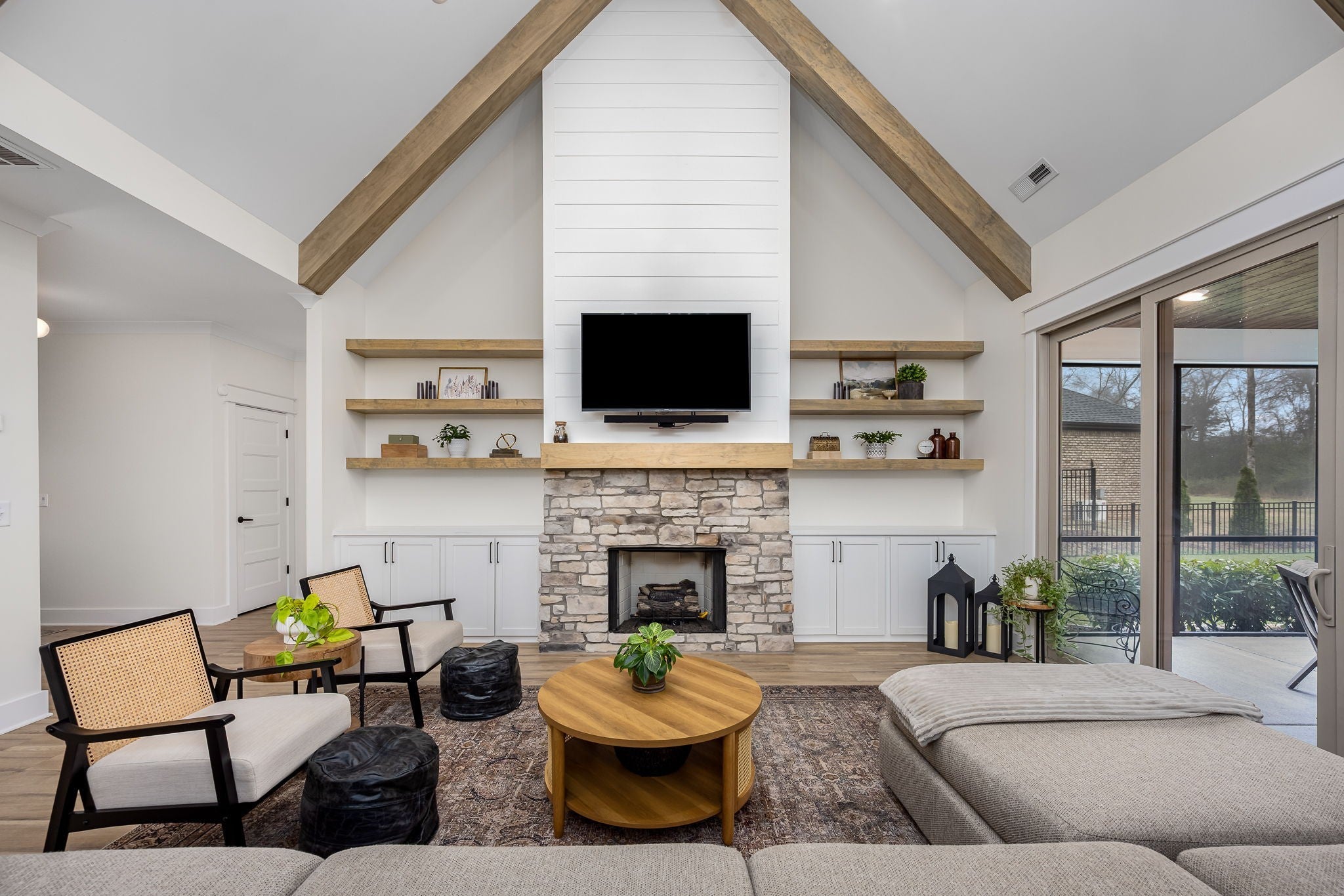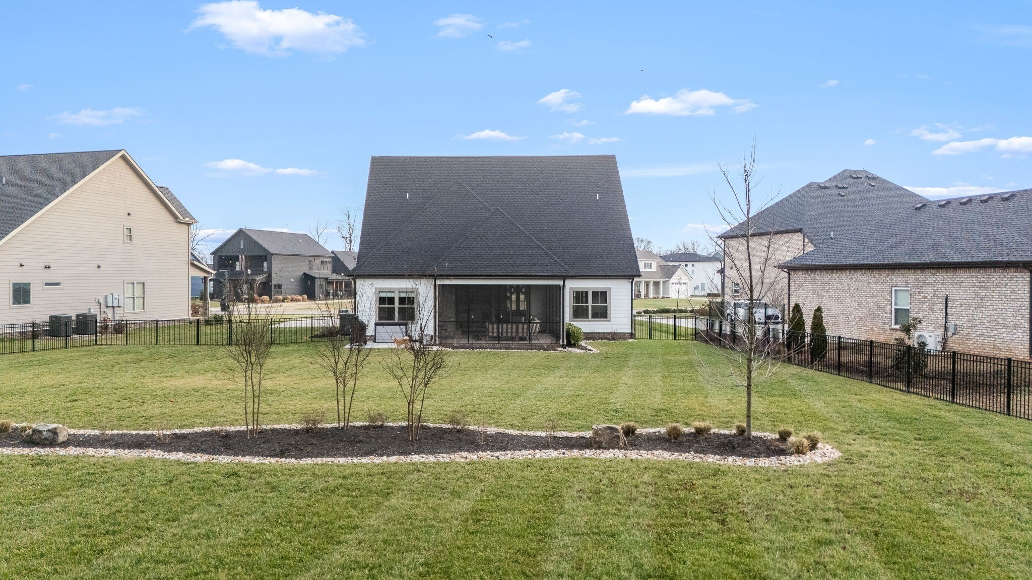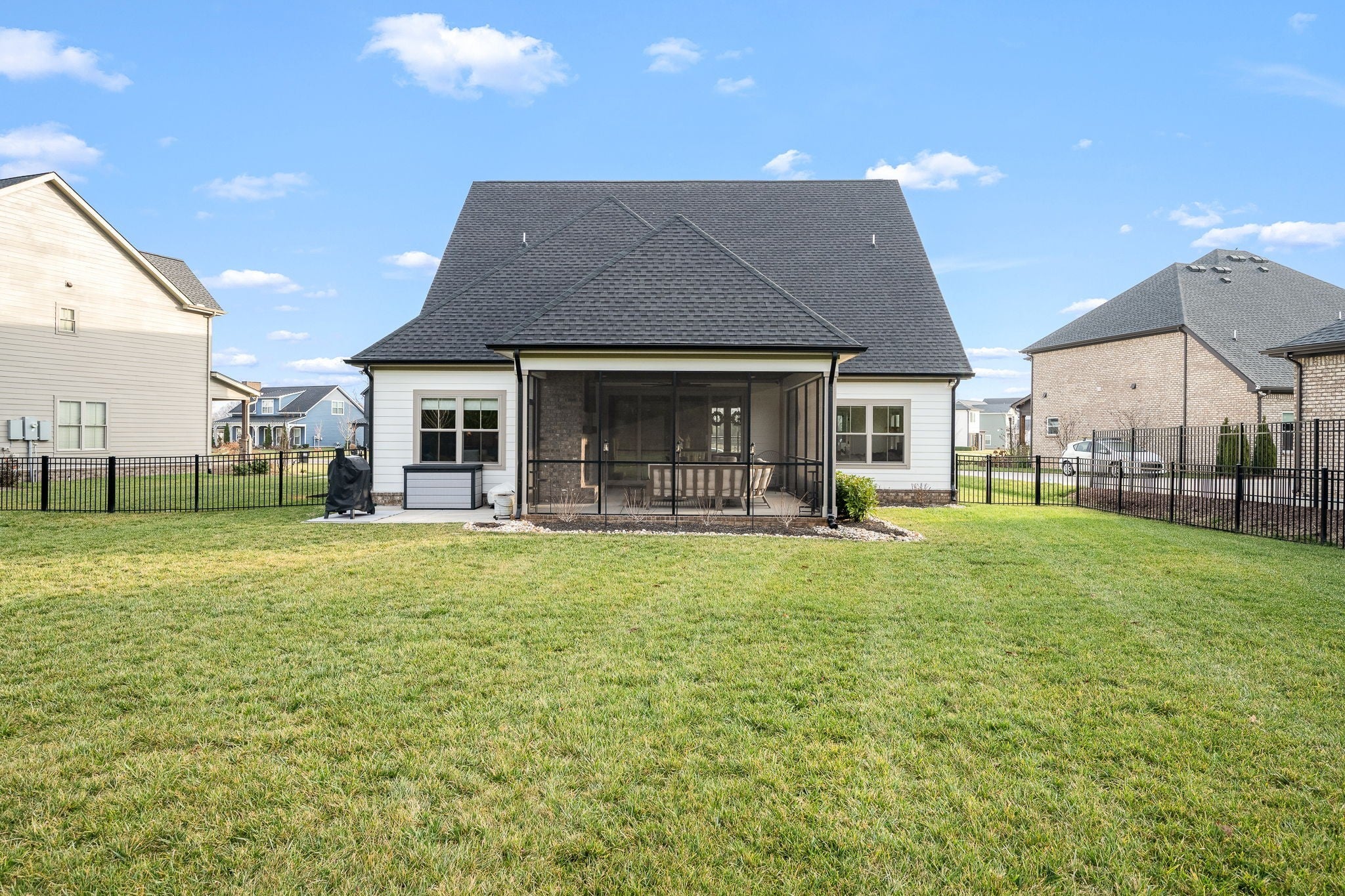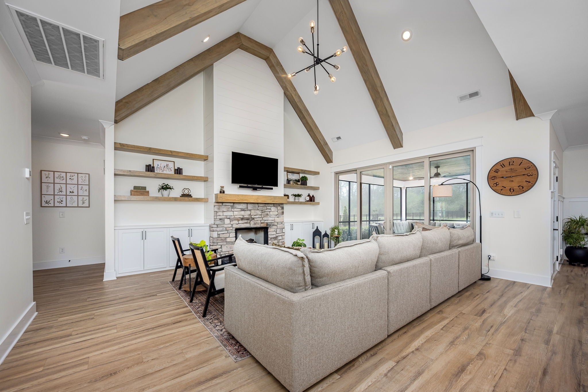 Built in 2023, this transitional-style home offers a thoughtfully designed living space in Parkside at Hidden River. The open floor plan features LVP flooring throughout the main level and a vaulted ceiling in the living room, creating a bright and inviting atmosphere. The kitchen includes upgraded Cambria quartz countertops, marble tile backsplash, soft-close cabinetry, a walk-in pantry, farmhouse apron-front sink, and a large island with bar seating. Designer lighting accents the space, which opens seamlessly to the living and dining areas. The primary suite is located on the main level and features an ensuite bath with a full tile shower, freestanding soaking tub, double vanities with extra storage, and a walk-in closet with custom built-in shelving. Additional bedrooms provide flexible use, along with a spacious bonus room over the garage. A 12-foot sliding door leads to a large screened porch with gas fireplace and cedar tongue-and-groove ceiling, overlooking a professionally landscaped 0.68-acre fenced backyard with black aluminum fencing and smart irrigation. Front and back porches feature matching cedar ceilings. Additional highlights include a drop zone, whole-house water softener and filtration system, and a security system with exterior cameras. Conveniently located near the Cason Lane trailhead with access to walking trails, dog park, playground, and pavilion.