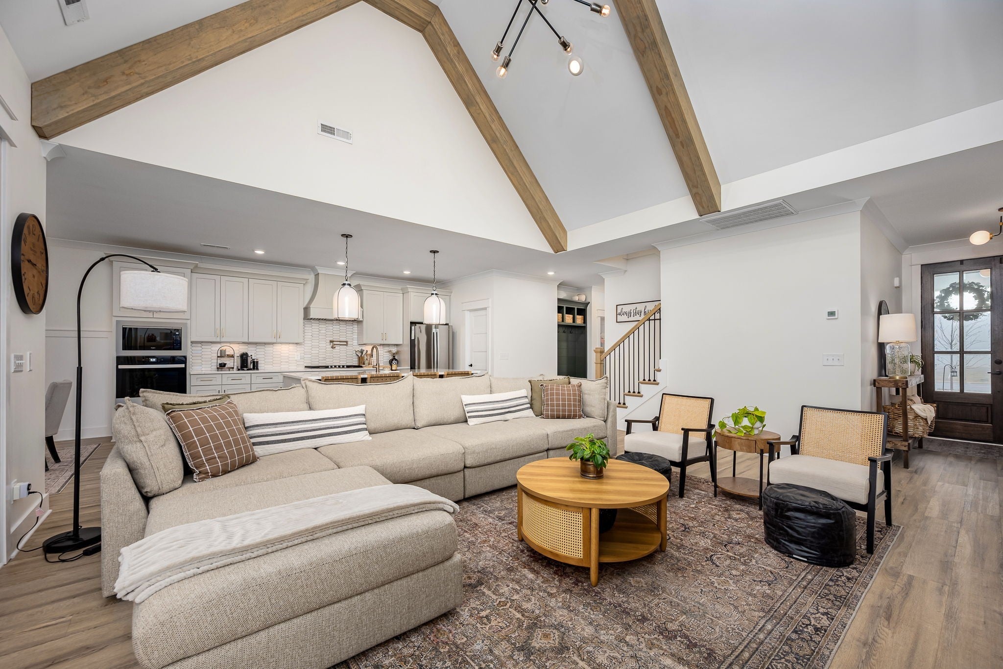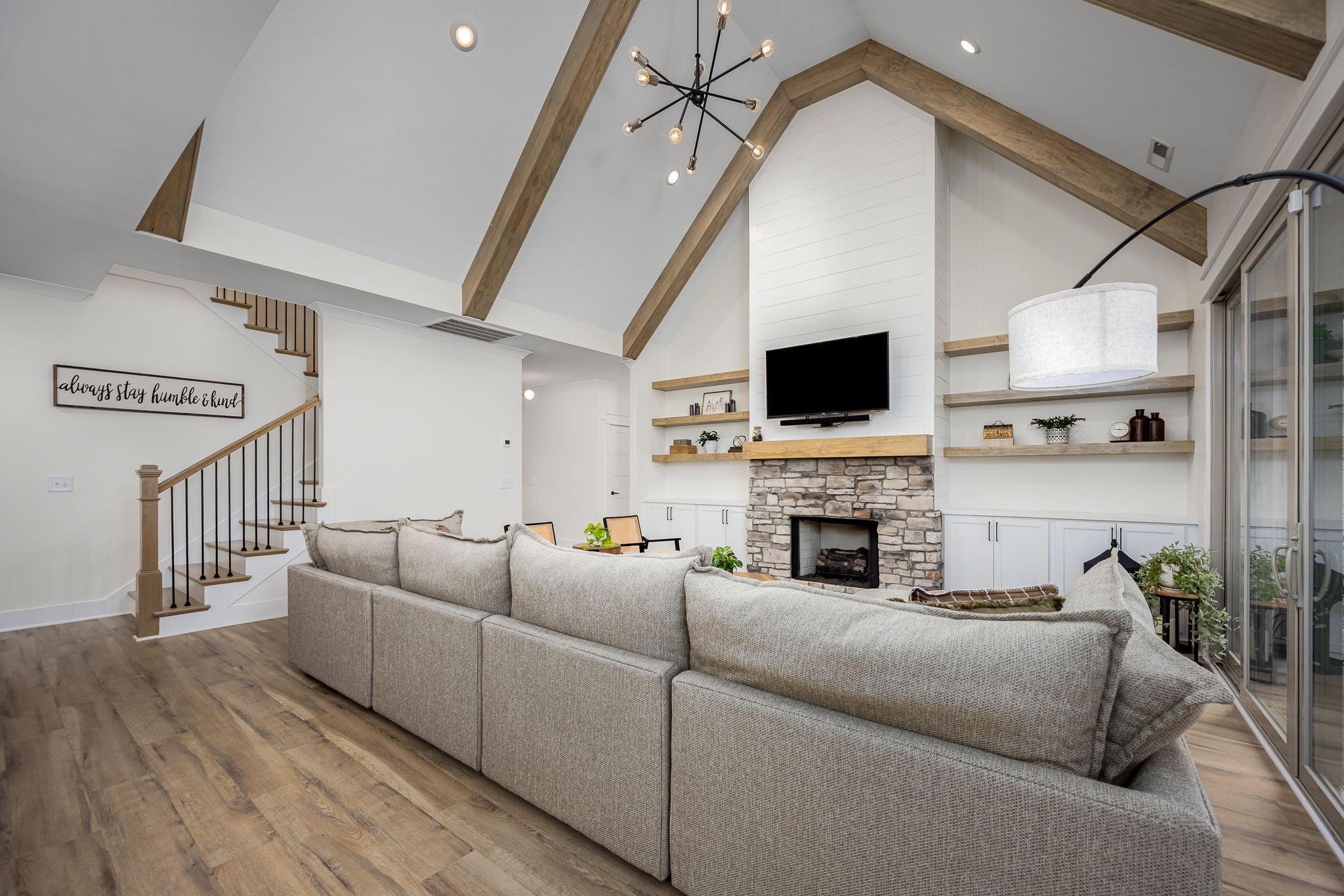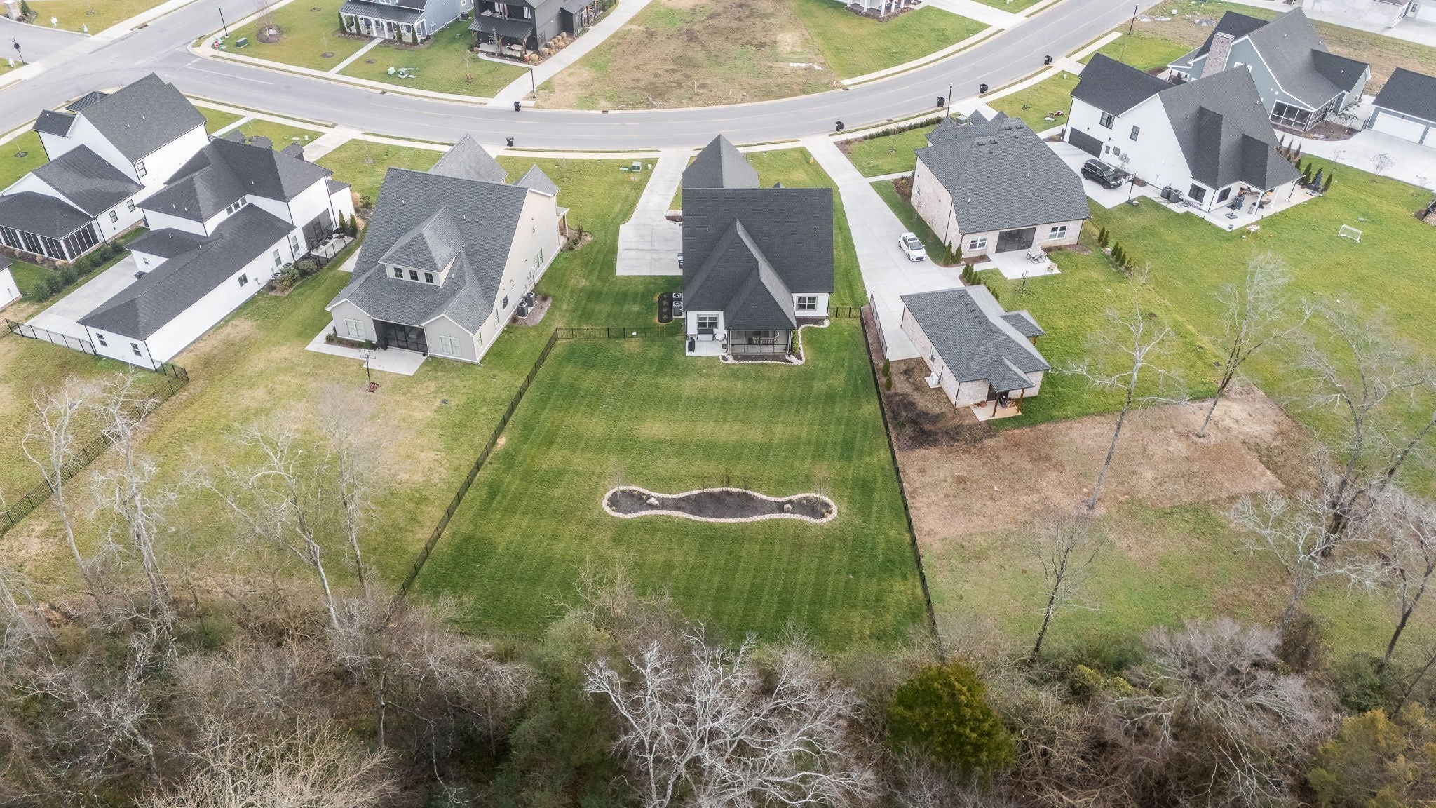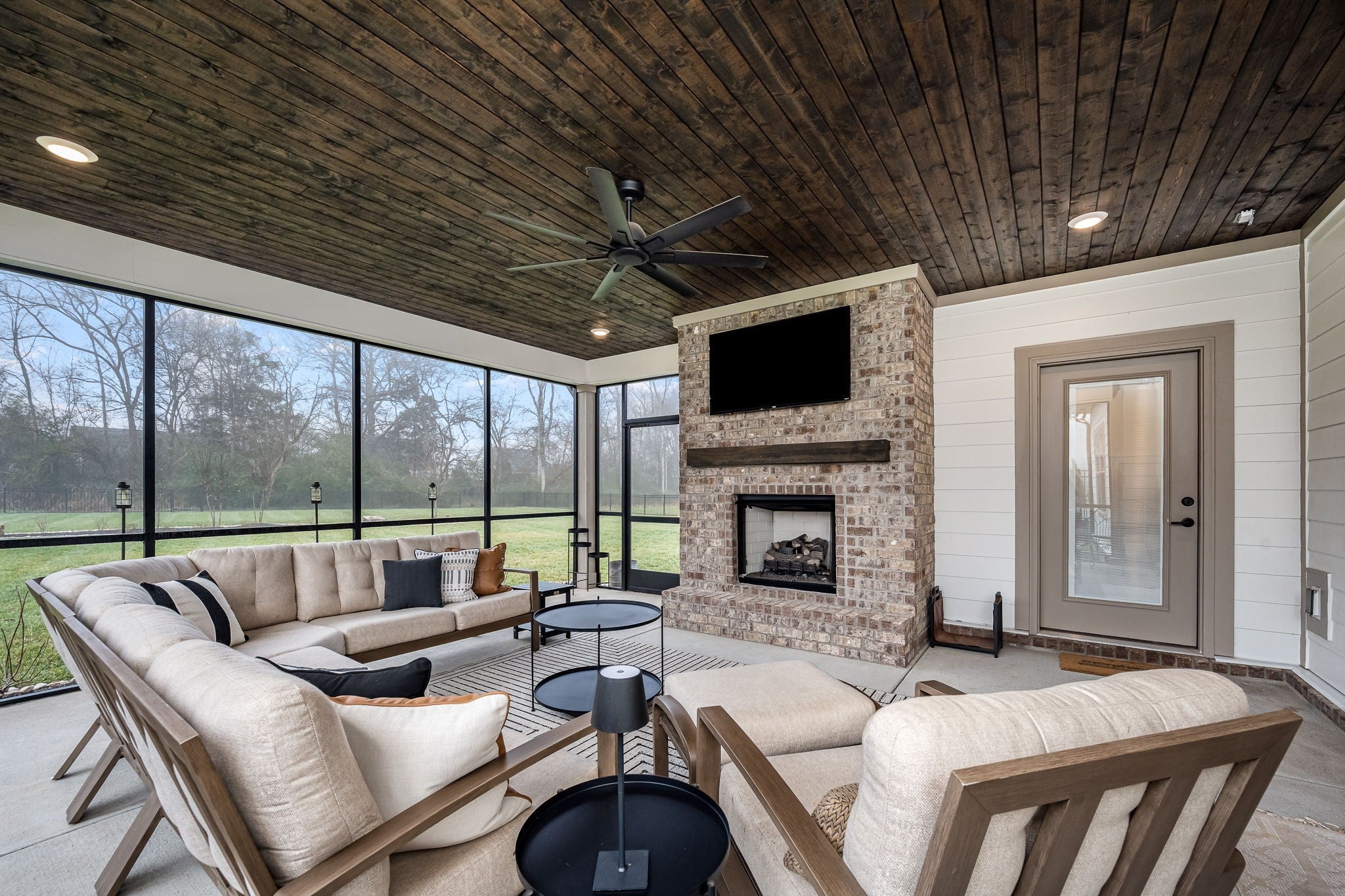 Built in 2023, this transitional-style home offers a thoughtfully designed living space in Parkside at Hidden River. The open floor plan features LVP flooring throughout the main level and a vaulted ceiling in the living room, creating a bright and inviting atmosphere. The kitchen includes upgraded Cambria quartz countertops, marble tile backsplash, soft-close cabinetry, a walk-in pantry, farmhouse apron-front sink, and a large island with bar seating. Designer lighting accents the space, which opens seamlessly to the living and dining areas. The primary suite is located on the main level and features an ensuite bath with a full tile shower, freestanding soaking tub, double vanities with extra storage, and a walk-in closet with custom built-in shelving. Additional bedrooms provide flexible use, along with a spacious bonus room over the garage. A 12-foot sliding door leads to a large screened porch with gas fireplace and cedar tongue-and-groove ceiling, overlooking a professionally landscaped 0.68-acre fenced backyard with black aluminum fencing and smart irrigation. Front and back porches feature matching cedar ceilings. Additional highlights include a drop zone, whole-house water softener and filtration system, and a security system with exterior cameras. Conveniently located near the Cason Lane trailhead with access to walking trails, dog park, playground, and pavilion.