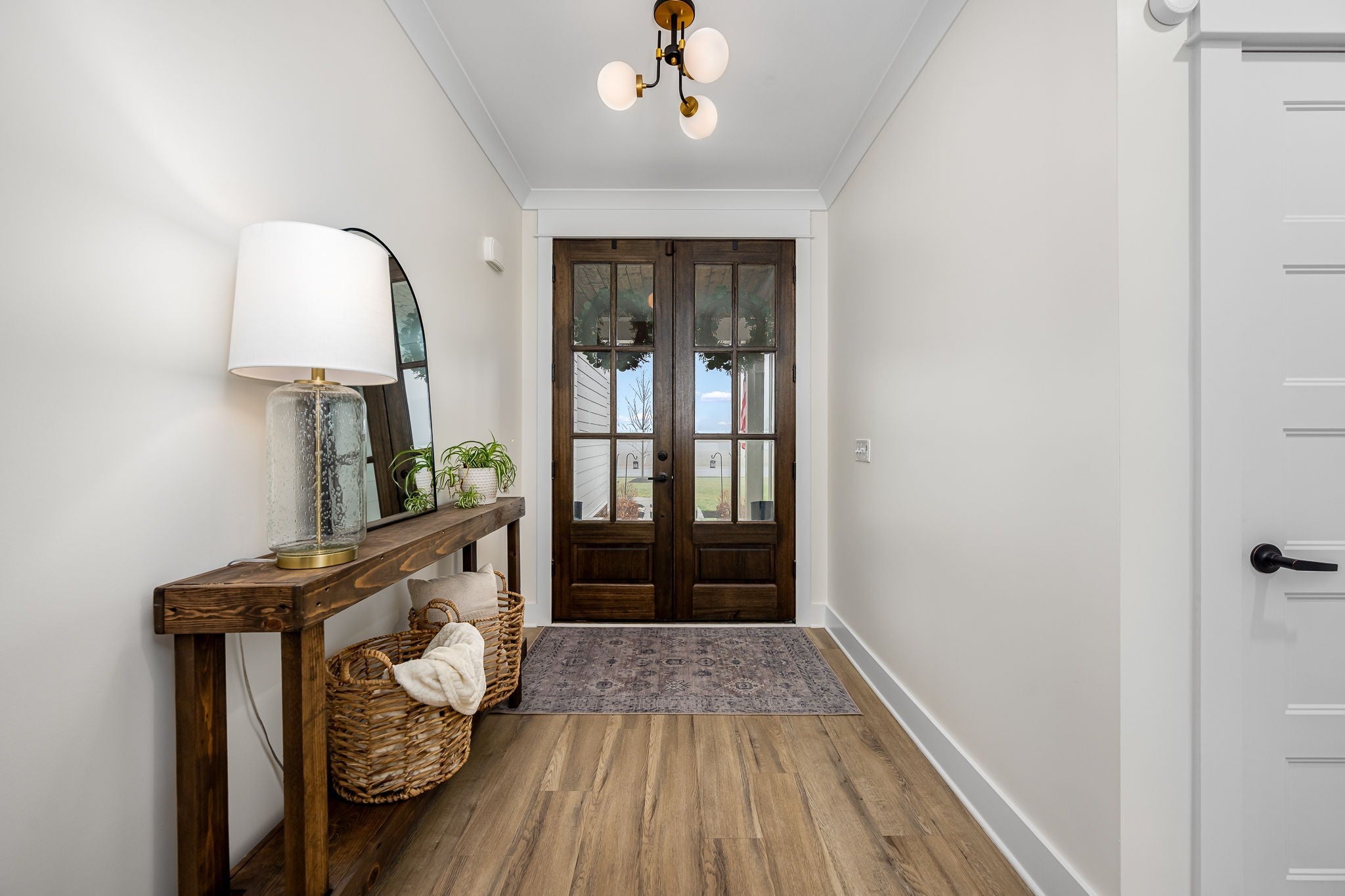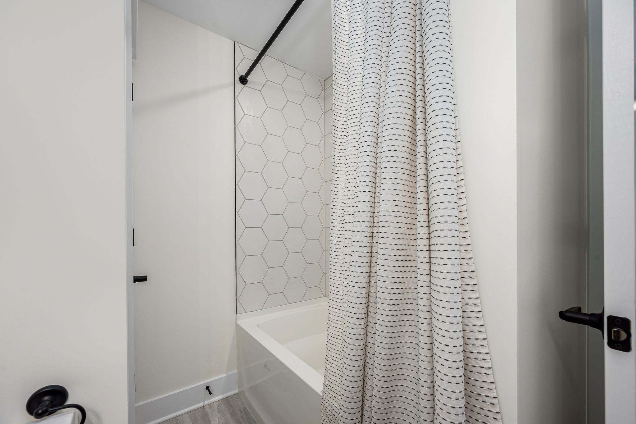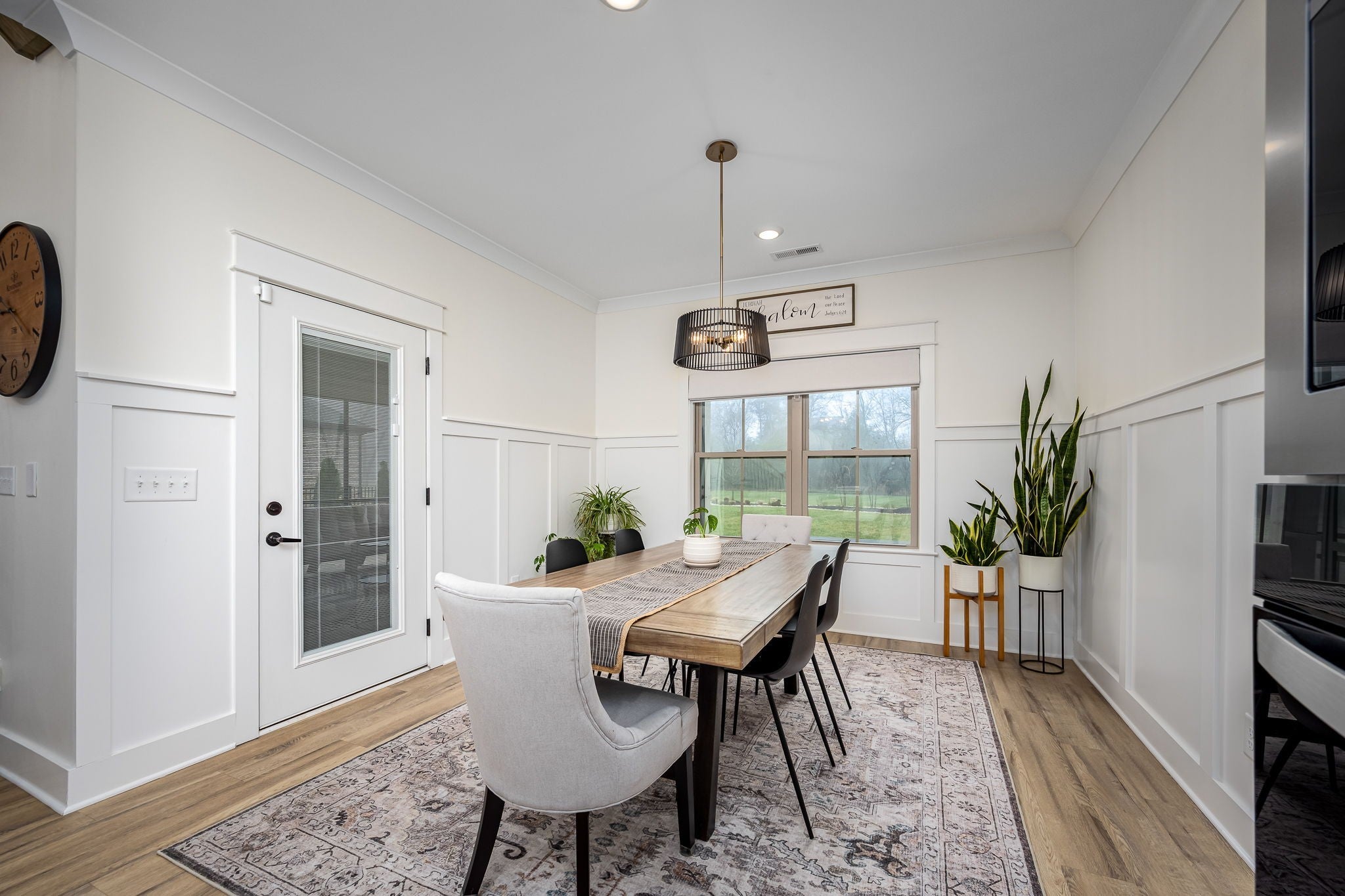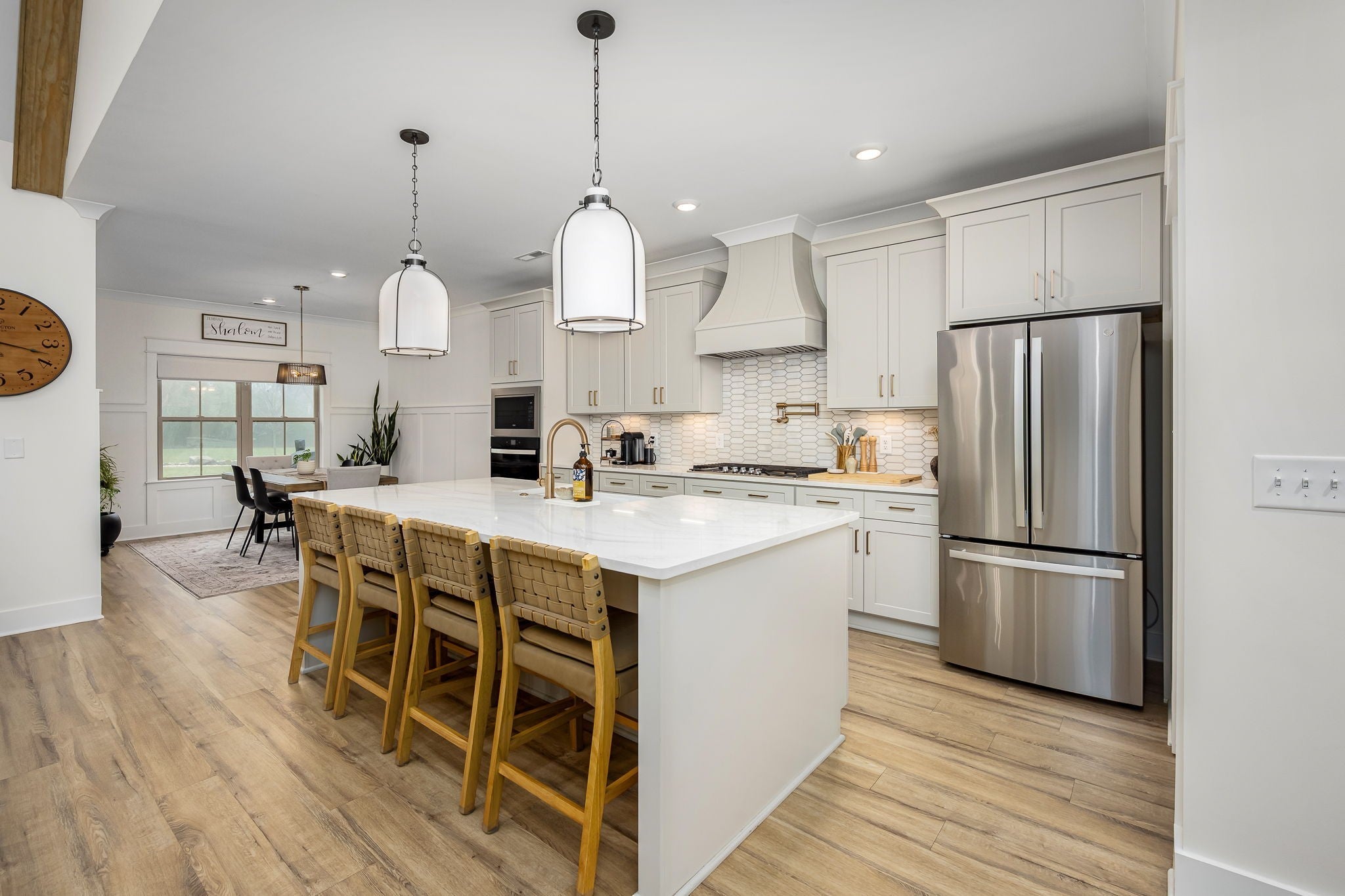 Built in 2023, this transitional-style home offers a thoughtfully designed living space in Parkside at Hidden River. The open floor plan features LVP flooring throughout the main level and a vaulted ceiling in the living room, creating a bright and inviting atmosphere. The kitchen includes upgraded Cambria quartz countertops, marble tile backsplash, soft-close cabinetry, a walk-in pantry, farmhouse apron-front sink, and a large island with bar seating. Designer lighting accents the space, which opens seamlessly to the living and dining areas. The primary suite is located on the main level and features an ensuite bath with a full tile shower, freestanding soaking tub, double vanities with extra storage, and a walk-in closet with custom built-in shelving. Additional bedrooms provide flexible use, along with a spacious bonus room over the garage. A 12-foot sliding door leads to a large screened porch with gas fireplace and cedar tongue-and-groove ceiling, overlooking a professionally landscaped 0.68-acre fenced backyard with black aluminum fencing and smart irrigation. Front and back porches feature matching cedar ceilings. Additional highlights include a drop zone, whole-house water softener and filtration system, and a security system with exterior cameras. Conveniently located near the Cason Lane trailhead with access to walking trails, dog park, playground, and pavilion.