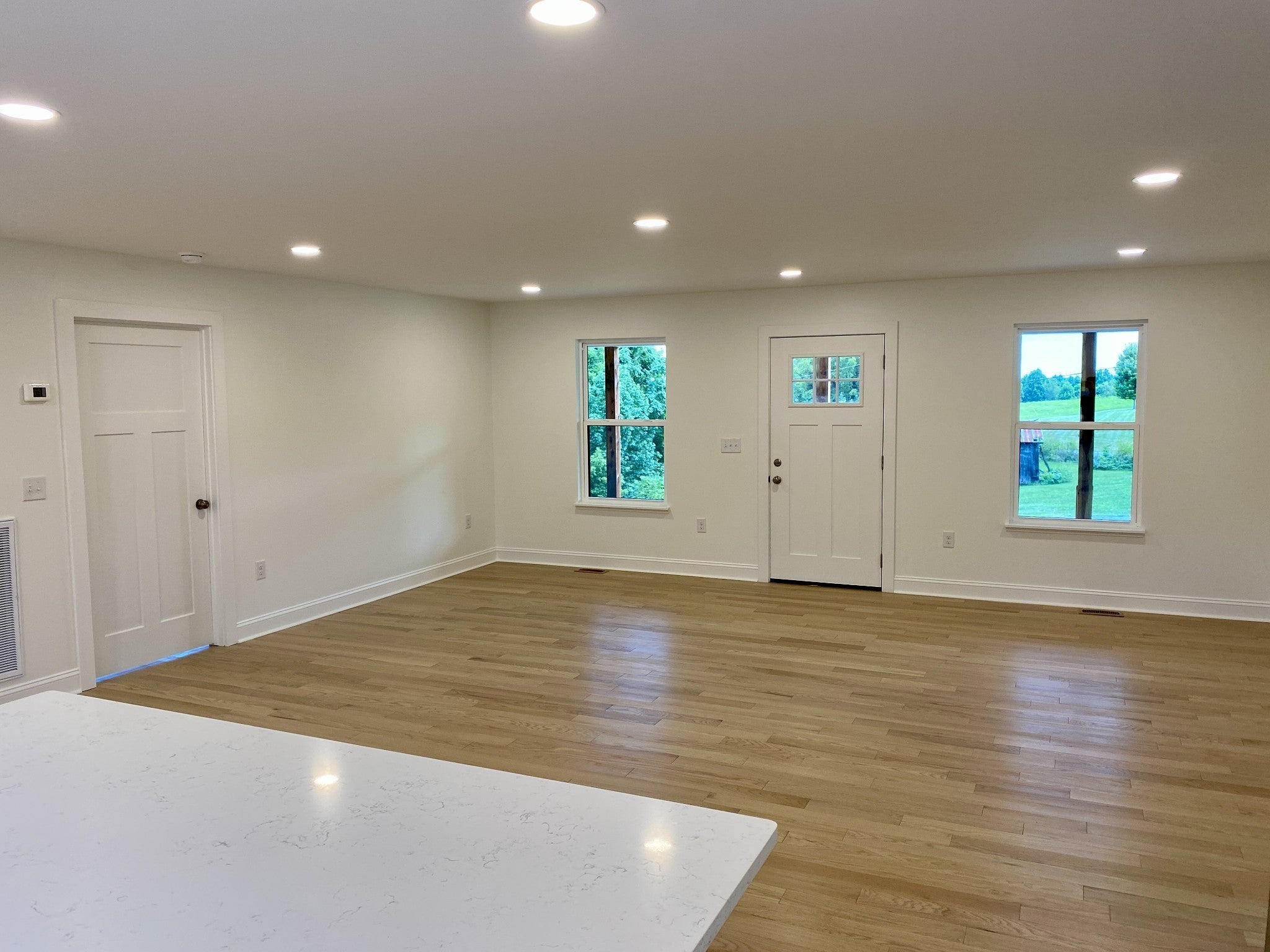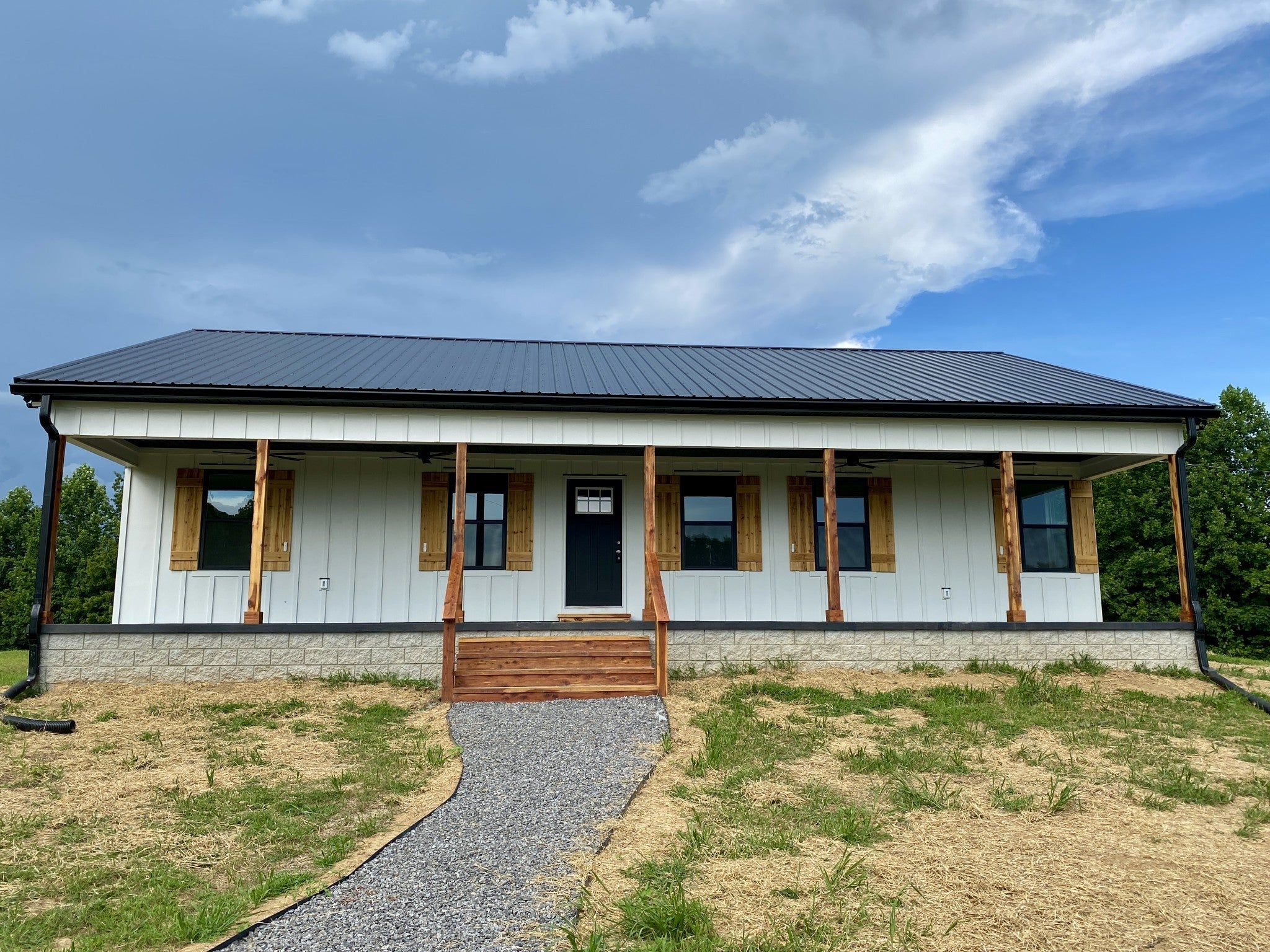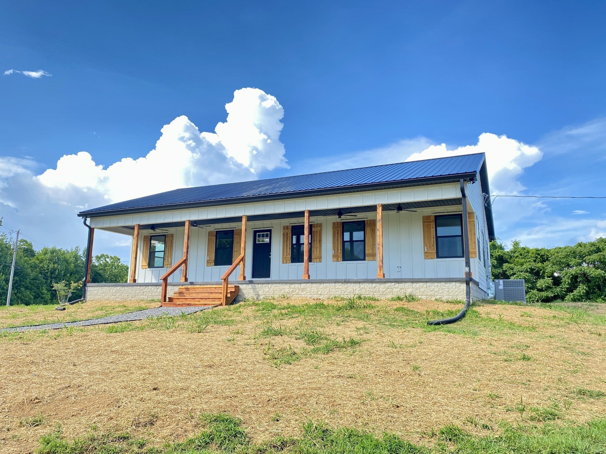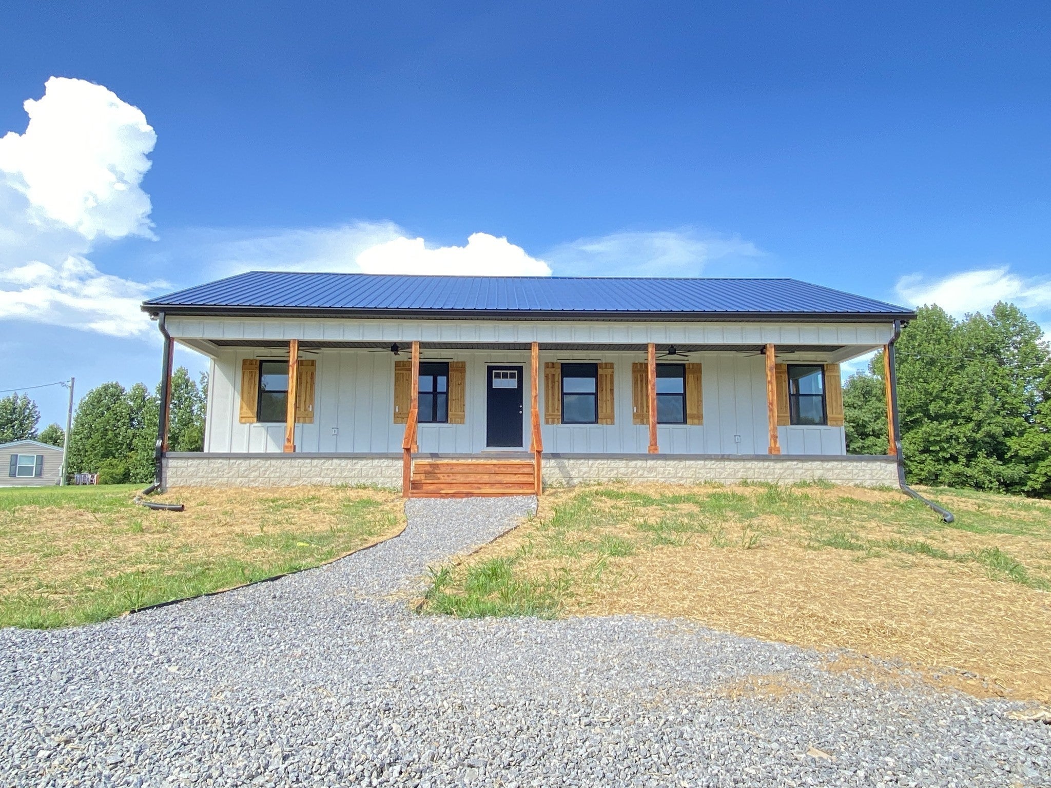 Breathtaking views and thoughtful craftsmanship define this brand-new 3BR/2BA ranch home on a level 1-acre lot in peaceful Chestnut Mound. Perched on the highest point of the property, the home features a full-length 8x50 covered front porch—perfect for taking in sunset views. Inside: white oak floors throughout the living areas, real wood vanities with granite tops in the bathrooms, and a spacious open-concept kitchen with quartz countertops, Whirlpool appliances, garbage disposal sink, tile backsplash, and custom plywood-constructed cabinets. Primary suite includes a 14x16 bedroom and 7x5 walk-in closet off the en-suite bath. Additional bedrooms are generously sized at 11x12. Step outside to a 12x15 back deck and enjoy the quiet. Built with lasting materials including hardyboard siding with a 30-year pre-painted warranty, cedar shutters and entry steps, and a steel roof. New 3-bedroom septic system in place. No HOA. Easy drive to Carthage or Cookeville.