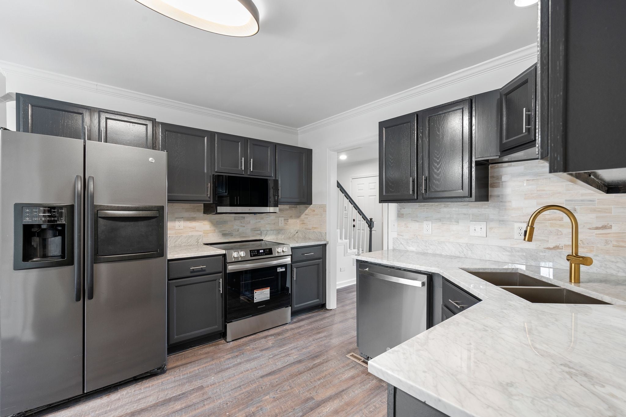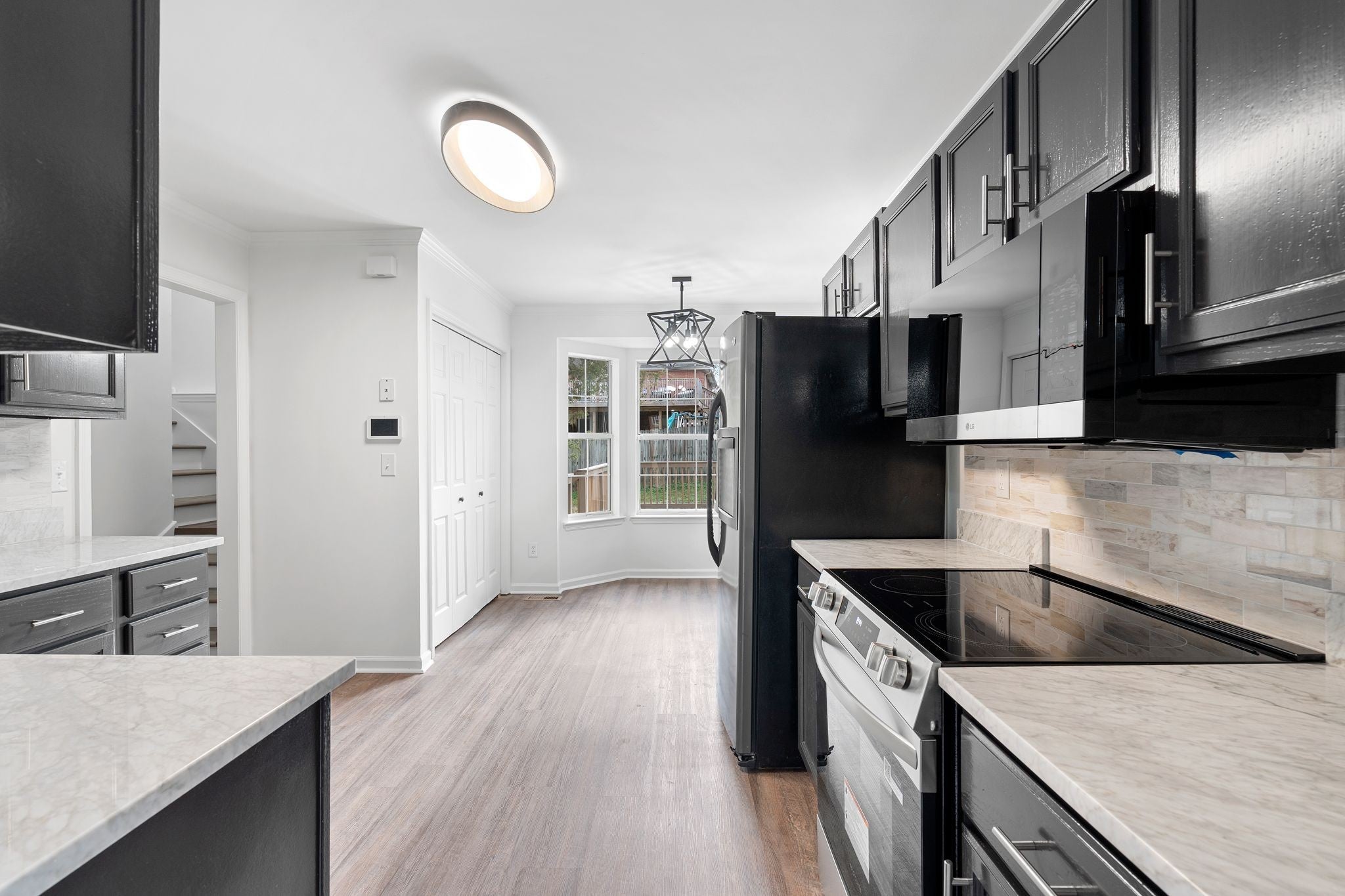 - Electric Oven, Cooktop, Dishwasher, Disposal, Microwave, Refrigerator, Stainless Steel Appliance(s)