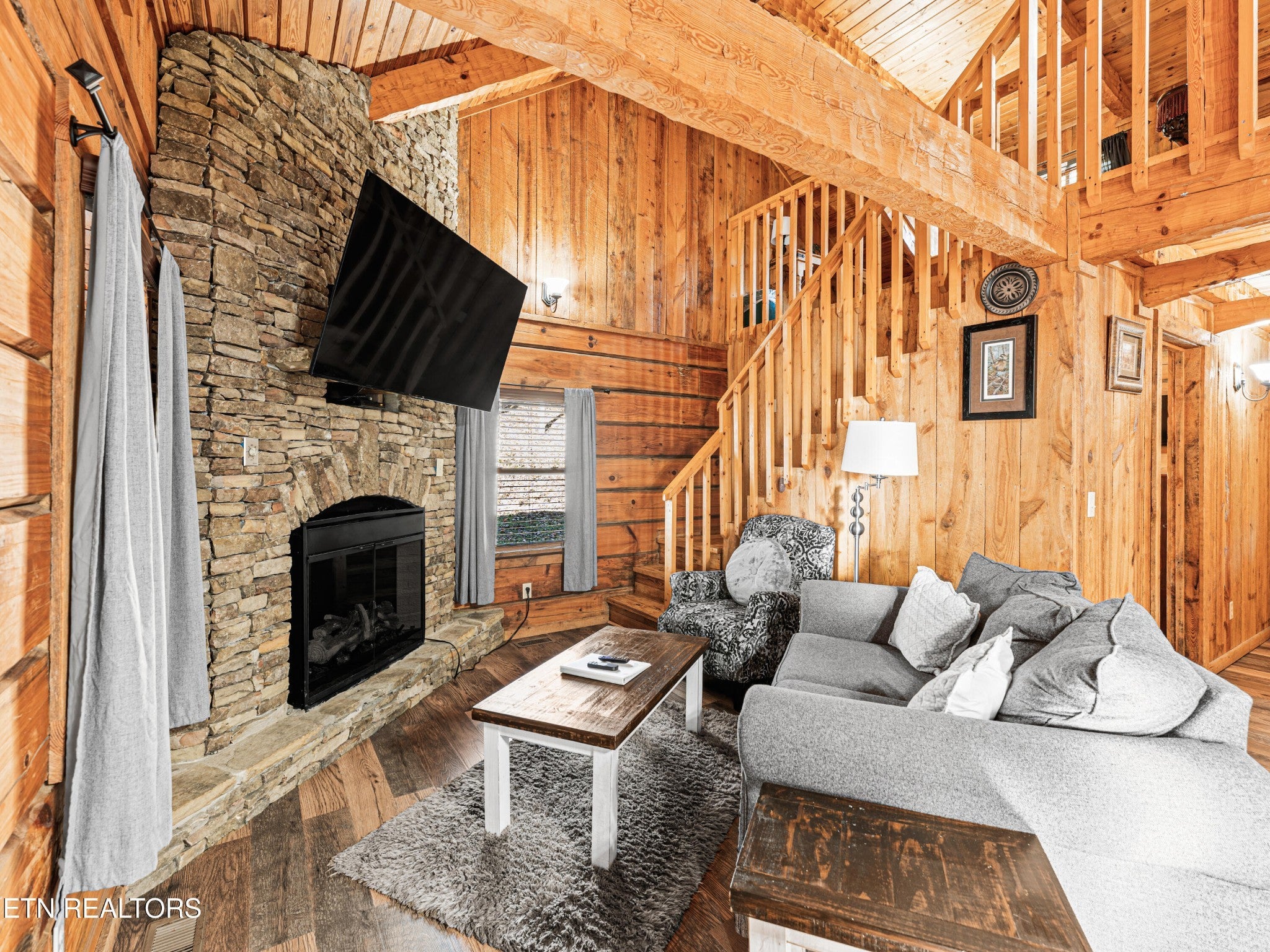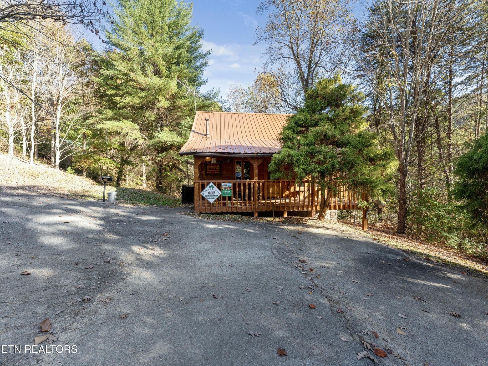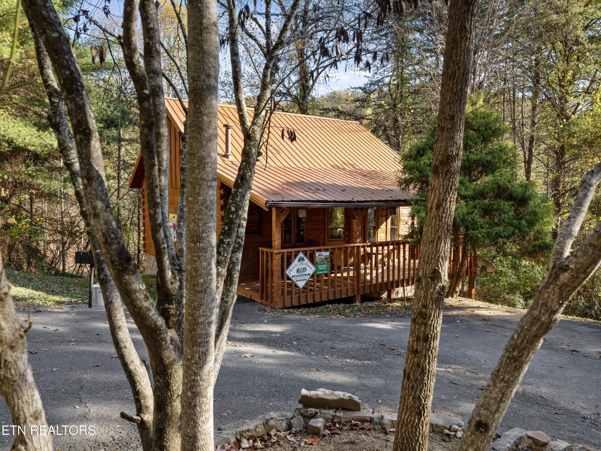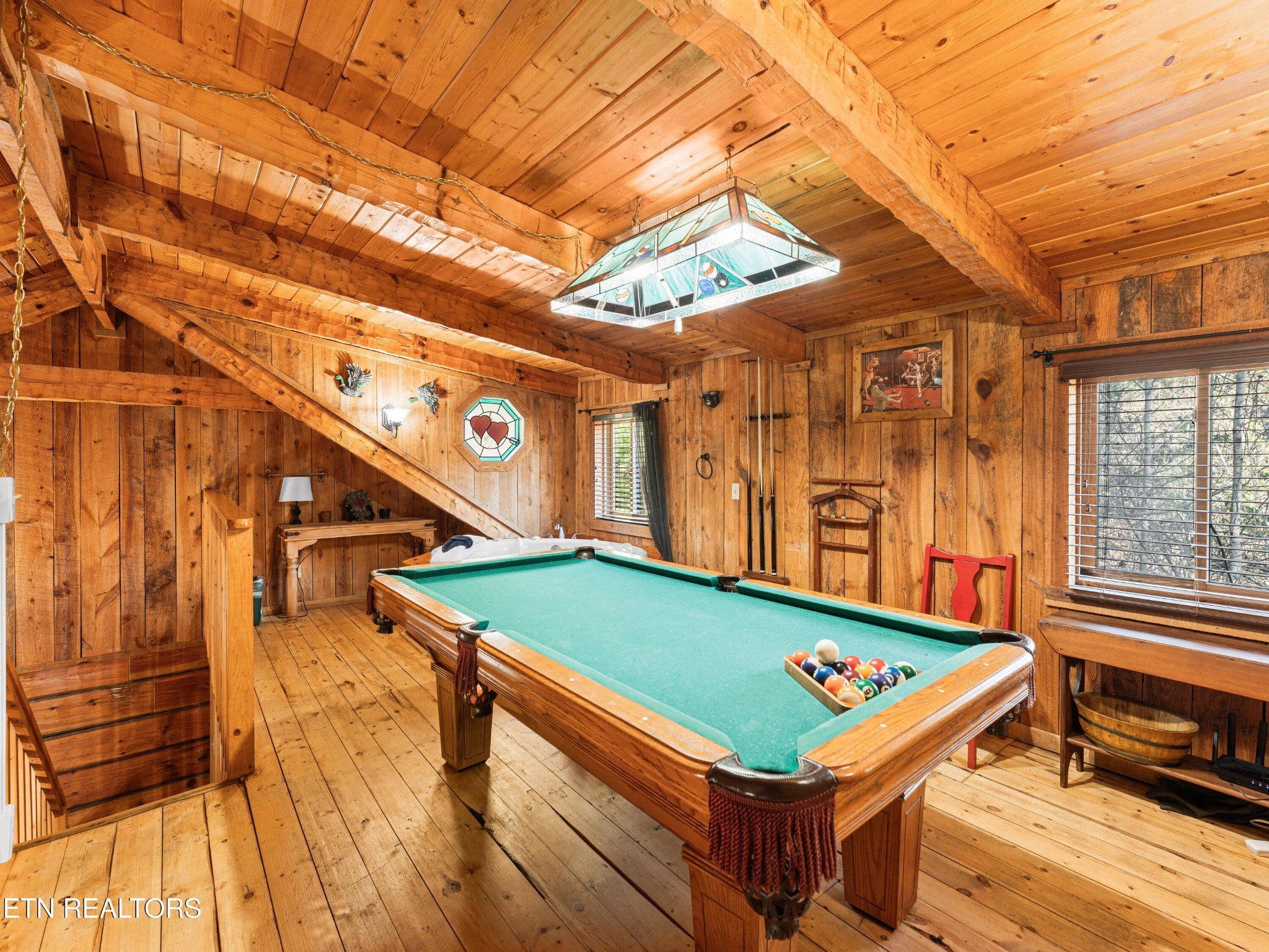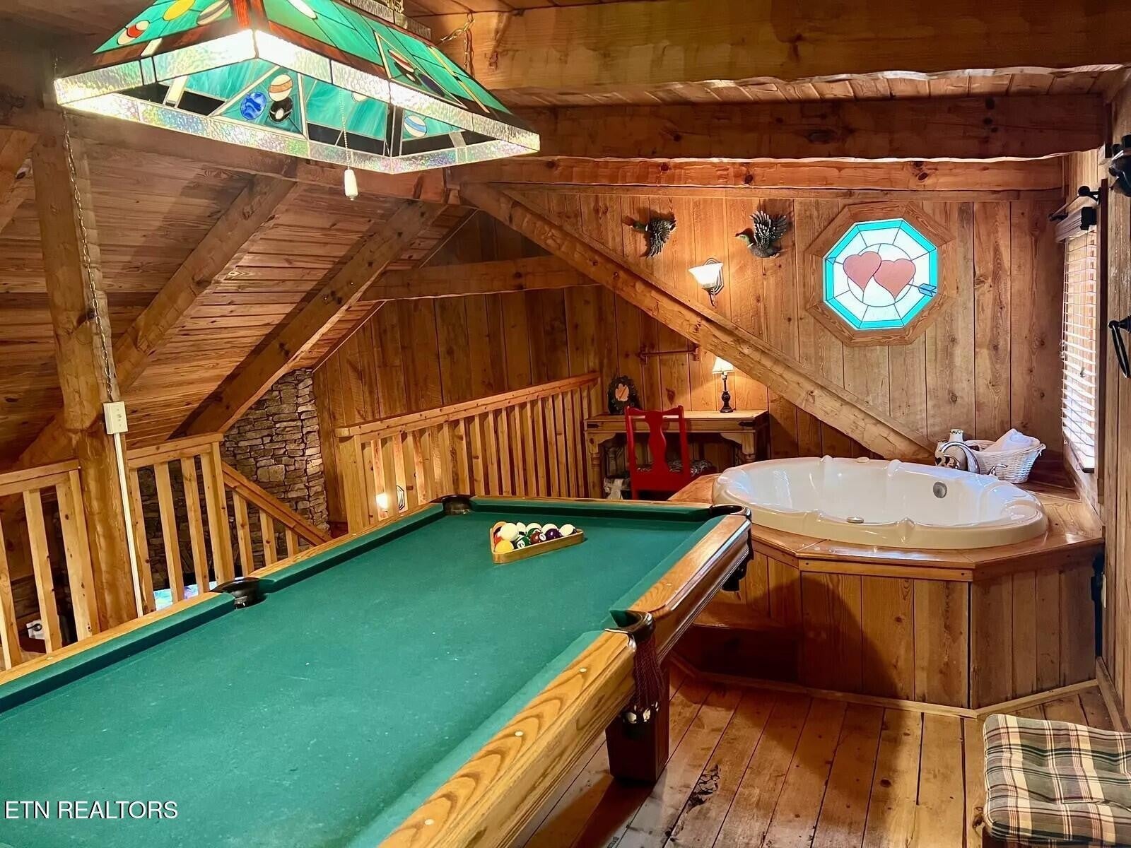This Romantic Getaway cabin is for you! Country Hearts is a classic log cabin style with a private hot tub on the back screened in porch; This cabin is conveniently located within minutes from the parkway and Wears Valley and everything Pigeon Forge. This is a turn key, move in ready cabin with a long cozy front porch with plenty of room to sit, take in the fresh air, and sip your coffee in the mornings. Walk in the front door and there's a living room stone surround fireplace with a TV mounted above it along with a couch to cuddle on, and an armchair. To your right is a fully equipped country kitchen and dining area. Down the hall is a queen size bedroom with a TV, a full bathroom with a standup shower, access to the screened-in porch with seating and an awesome, private hot tub perfect for soaking at the end of a long day. Head upstairs to the loft to take advantage of the jacuzzi tub or entertain a round or two of billiard ball. Come see the Country Hearts cabin today! By Appointment Only. STR Property. Parking with a large back yard.