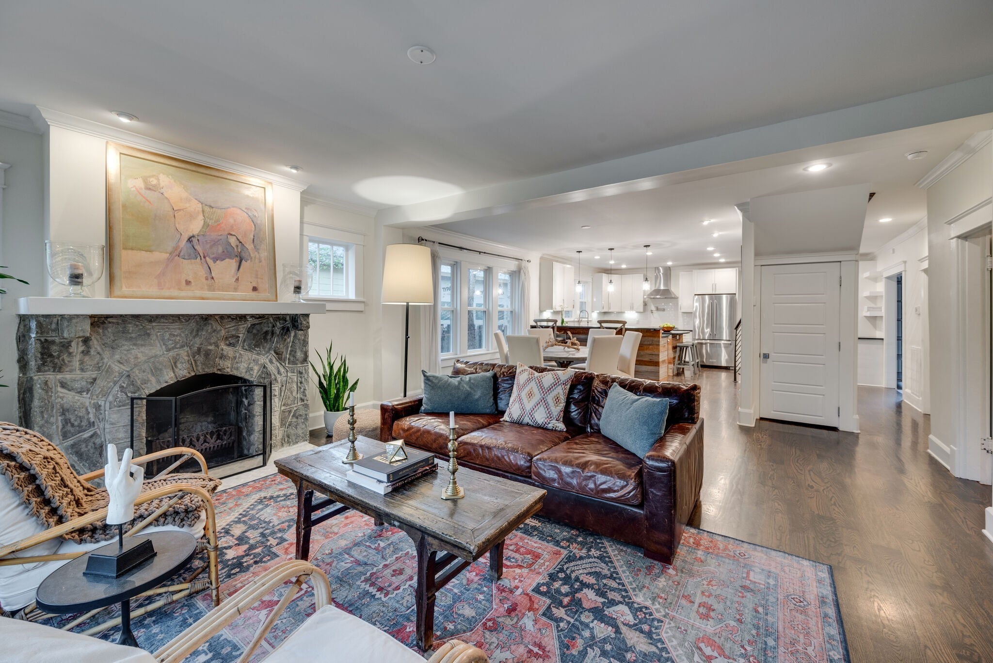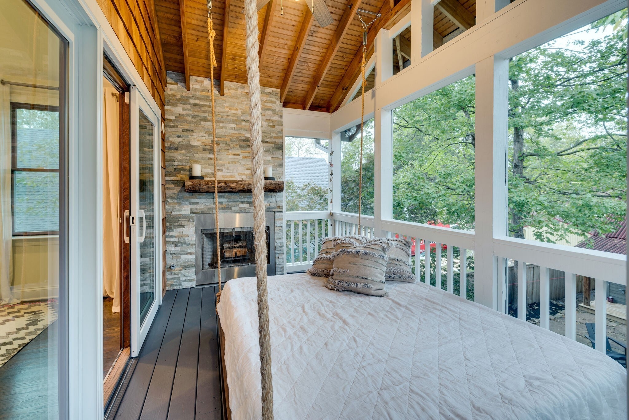 This fully furnished and newly renovated 1925 stone home on a quiet dead-end street in East Nashville’s beloved Eastwood neighborhood offers the perfect blend of historic charm and modern convenience. A short walk to Publix, Eastland Park, Café Roze, Ugly Mugs, schools and daycares - it’s an ideal location for both families and professionals seeking comfort and community. A winding walkway leads to the welcoming front porch swing and into a light-filled home where hardwood floors flow seamlessly through the open floorplan. The living room connects effortlessly to a chef’s kitchen with soapstone counters and Viking appliances. On the main level, you’ll find a guest room, full bath, and a rear-entry drop zone designed for both function and ease.The screened-in porch with fireplace frames the private, fully fenced backyard and two-car garage, perfect for entertaining or quiet evenings at home. Upstairs, custom steel railings open to a versatile bonus space, 2 additional bedrooms, 1 additional full bath, and a spacious primary suite with a steam shower, freestanding tub, and a second screened porch featuring its own fireplace and hanging porch bed. Pets, pet deposit, and utilities are negotiable. Lease term available from 3 months to 1 year. Fireplace in living room is non-functioning. Photos show previous furnishings; home is currently styled similarly. Please text/call; co-listing agent, Zac Koffler, with all inquiries (615) 891-0886