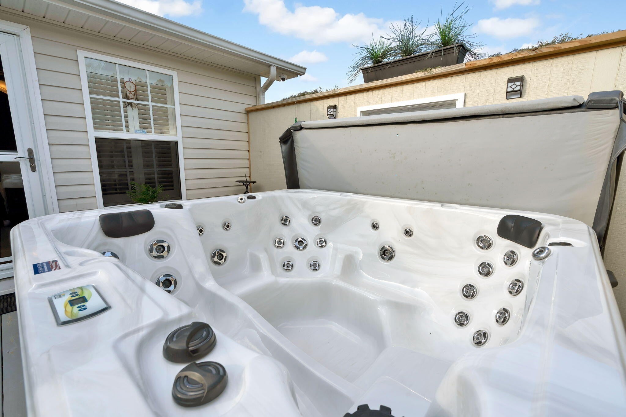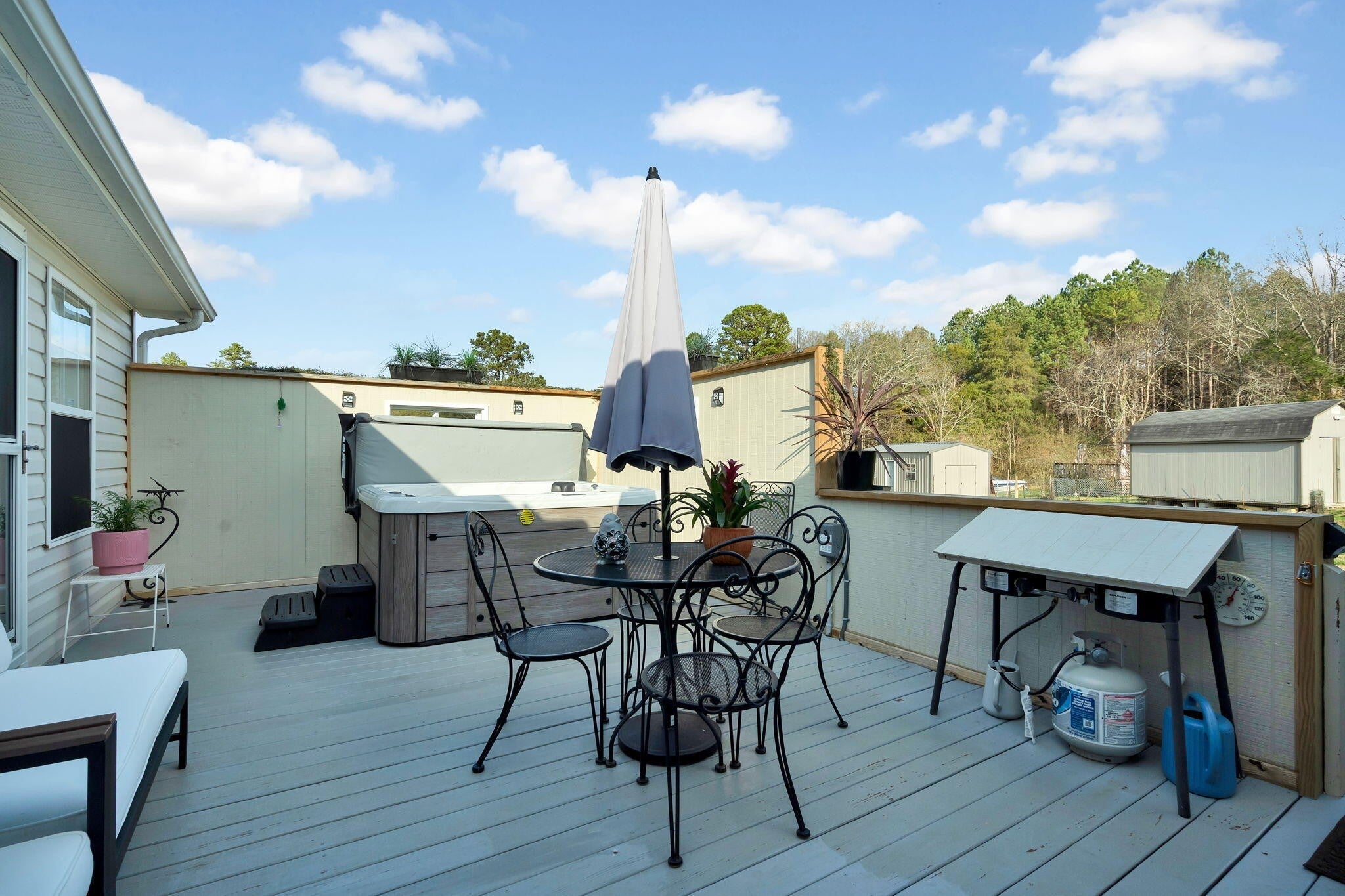 This beautifully maintained one level like new home on almost an acre, offers three bedrooms, two full bathrooms, and 1,272 square feet of comfortable living space with a practical, functional layout. A classic rocking chair front porch creates a welcoming first impression and provides a relaxing spot to enjoy the outdoors. Inside, the floor plan features connected living areas that support both everyday living and casual gatherings. The bedrooms are nicely sized, with the primary bedroom offering a private and comfortable retreat. From the primary suite, you can step directly onto the back deck, providing easy access to the hot tub and outdoor living space. Outdoor features truly enhance this property. The deck has been rebuilt and expanded, making it ideal for outdoor dining, entertaining, or relaxing, and a hot tub conveys with the home for convenient at-home enjoyment. The backyard is fenced, offering added privacy and flexibility for outdoor use. Two storage buildings with power provide excellent space for equipment storage, hobbies, workshop needs, or projects. Landscaping improvements include new bushes and flowers, fruit trees, crepe myrtle, and Leyland Cypress pines, creating seasonal color and year round appeal. A designated garden area is already in place for those who enjoy growing their own produce. Additional updates include a whole house carbon water filter for added everyday comfort. This property offers a thoughtful combination of indoor functionality and outdoor amenities. Schedule your private showing today to see all it has to offer.