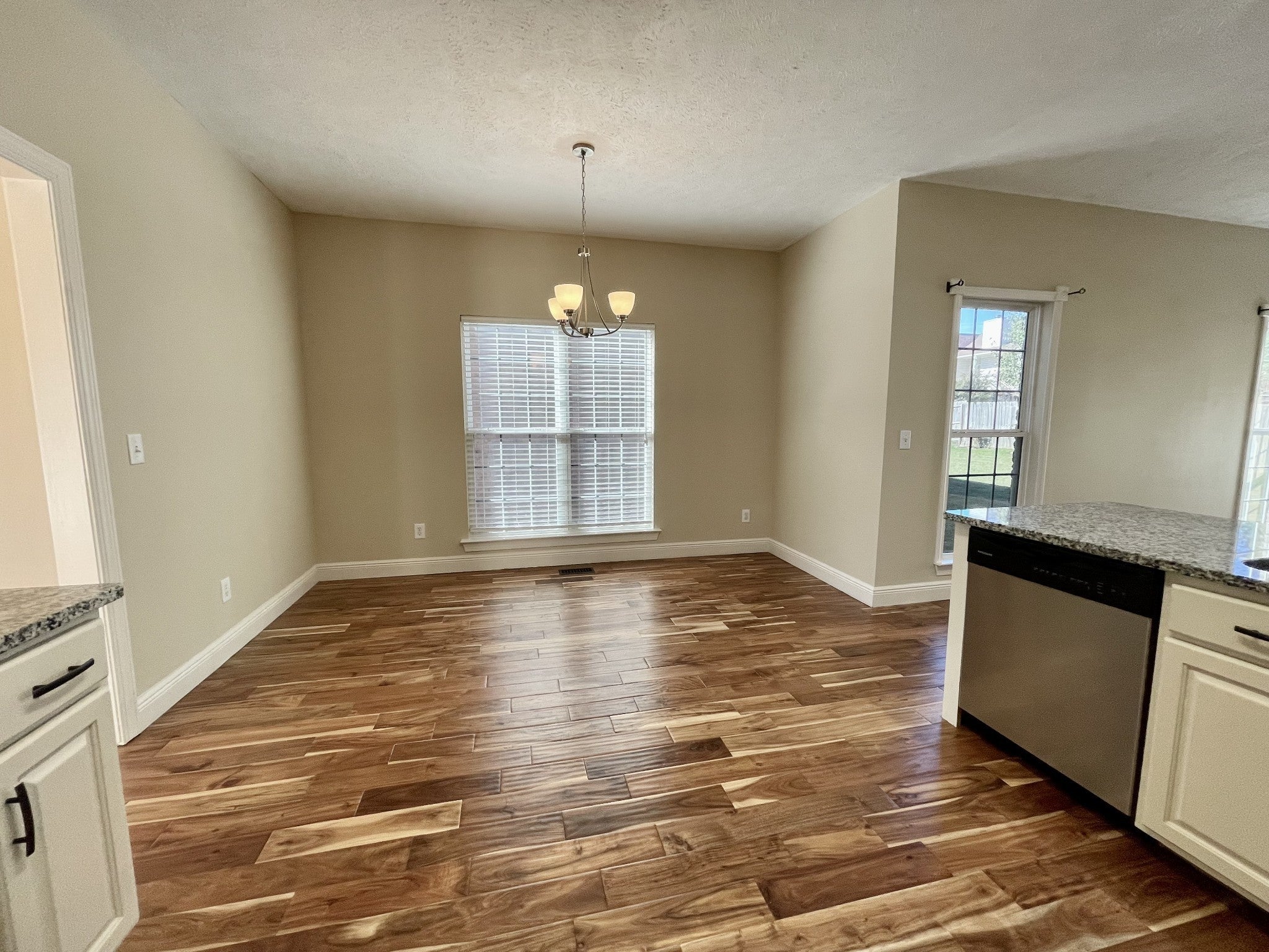 Beautiful home featuring an open floor plan with hardwood floors throughout. The spacious kitchen offers granite countertops, stainless steel appliances, and a sunny breakfast nook that opens to a cozy den with a fireplace and a formal dining room with high ceilings and large windows that bring in plenty of natural light. Step out from the den onto a large deck — perfect for outdoor enjoyment. The main-level primary suite includes generous closet space, a double vanity, and an updated tiled shower. Upstairs, a massive bonus room provides endless possibilities, along with three additional bedrooms, each with ample closet space, and a remodeled tiled bathroom. This home offers a functional and inviting layout ideal for entertaining and comfortable family living.