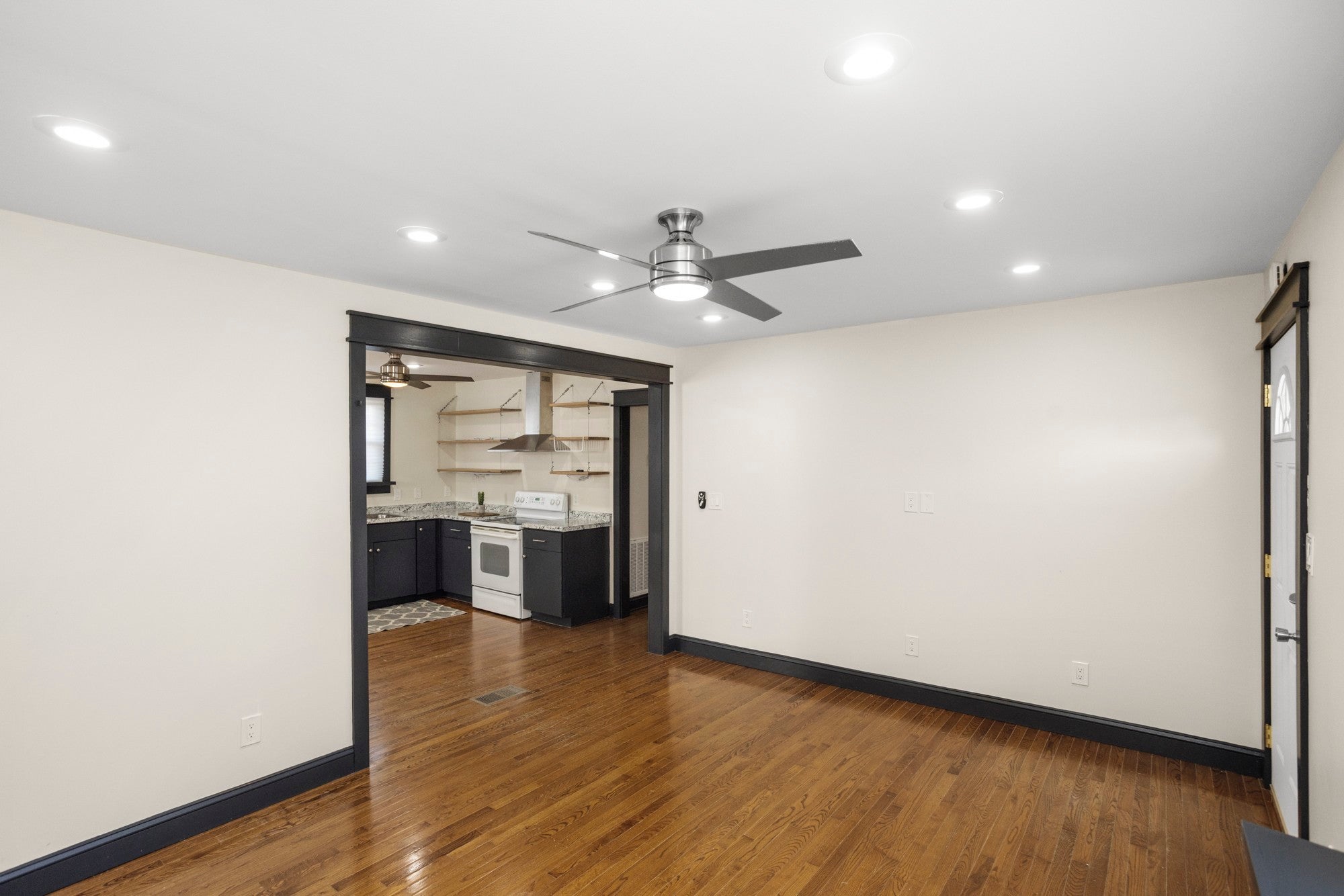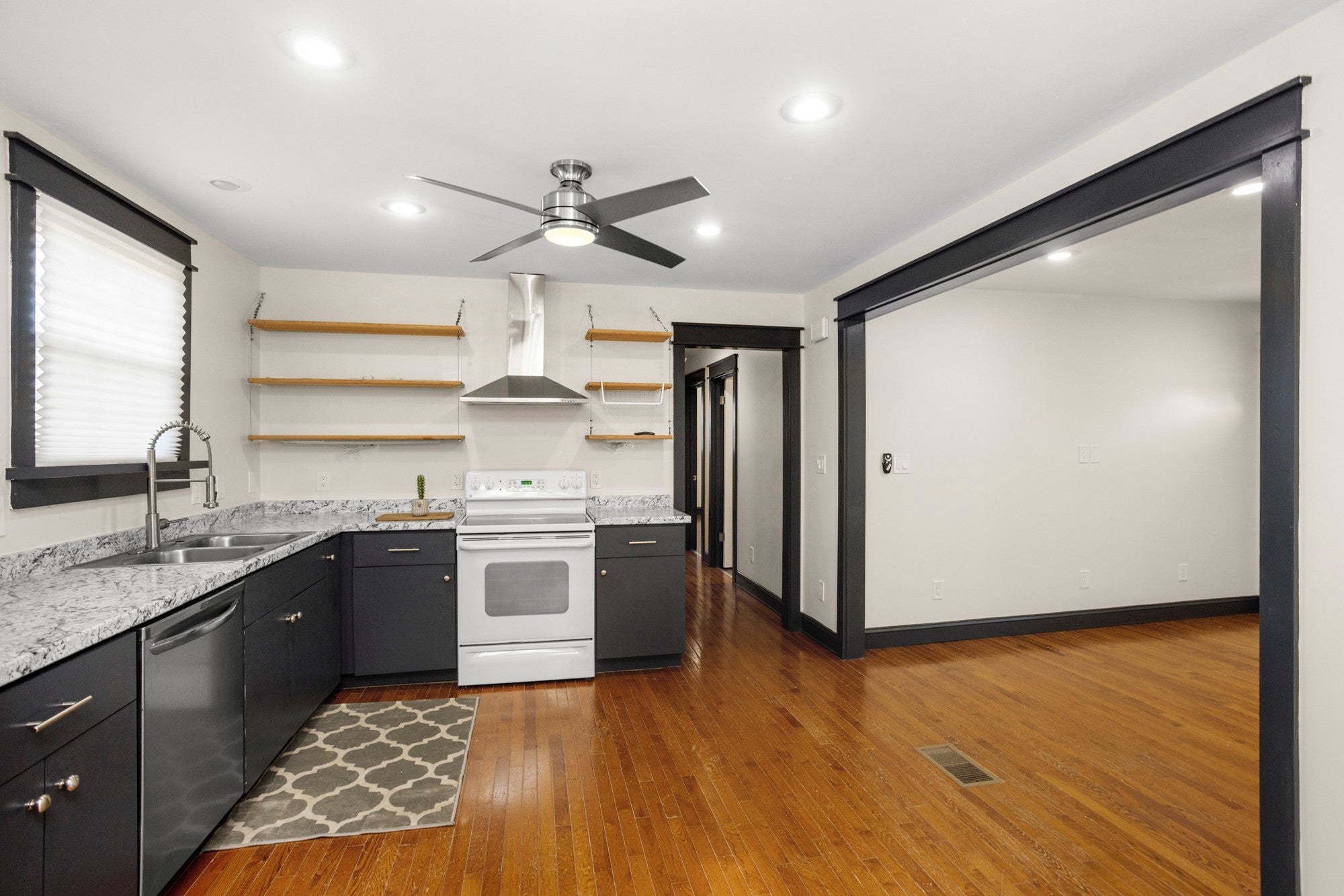 This fully renovated home offers 3 spacious bedrooms, 1.5 baths, wood floors/tile throughout, updated countertops in kitchen, new double basin stainless steel sink, floating shelves, recessed lighting, stylish ceiling fans in kitchen/dining area, newer appliances, oversized tile wrapped shower with dual shower heads and double vanities in primary bath. Additional amenities include: half bath located in owner's suite, dual closets in owner’s suite, new fixtures throughout, a sizable fenced treed backyard, large deck in rear for entertaining, an abundance of driveway parking including a turnaround, a storage shed, a partially finished rec room in the basement, (not included in listing square footage), and a 2 car garage adjacent to the rec room area that could be kept as a garage or converted for even more additional space.