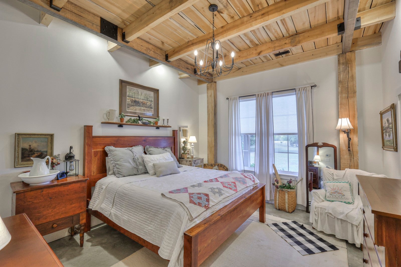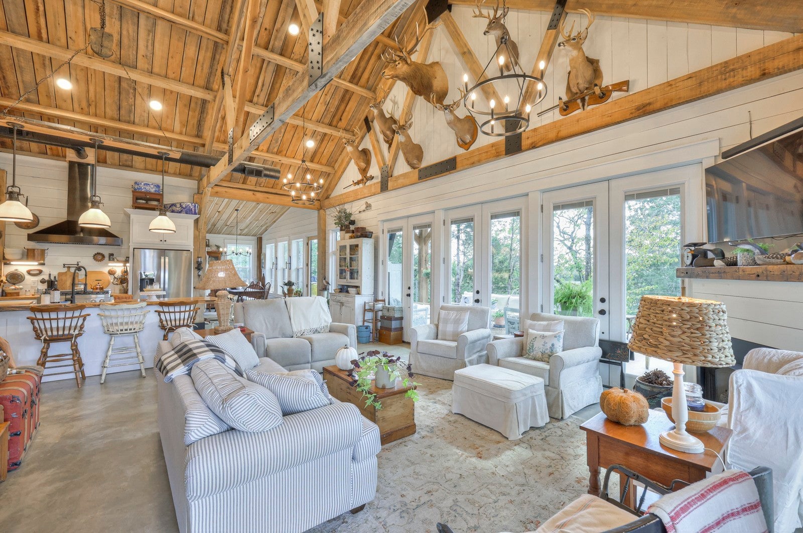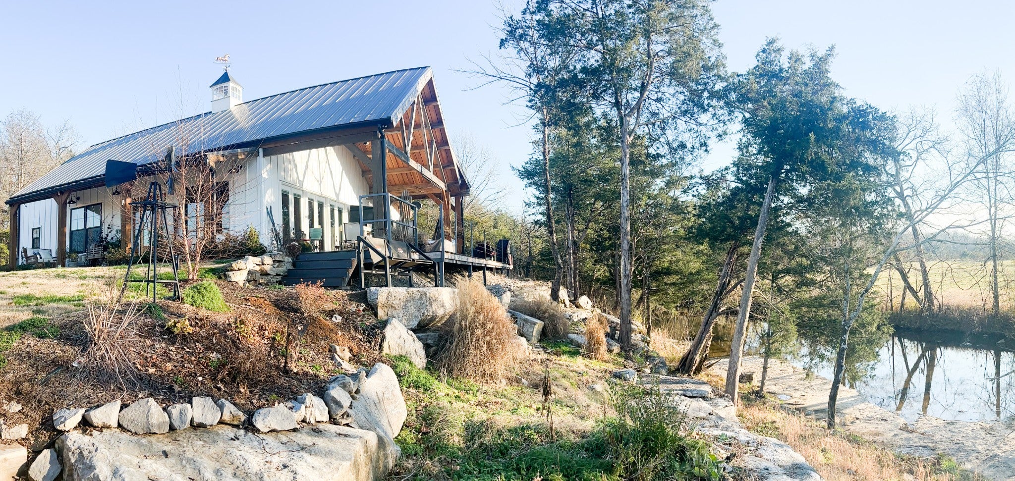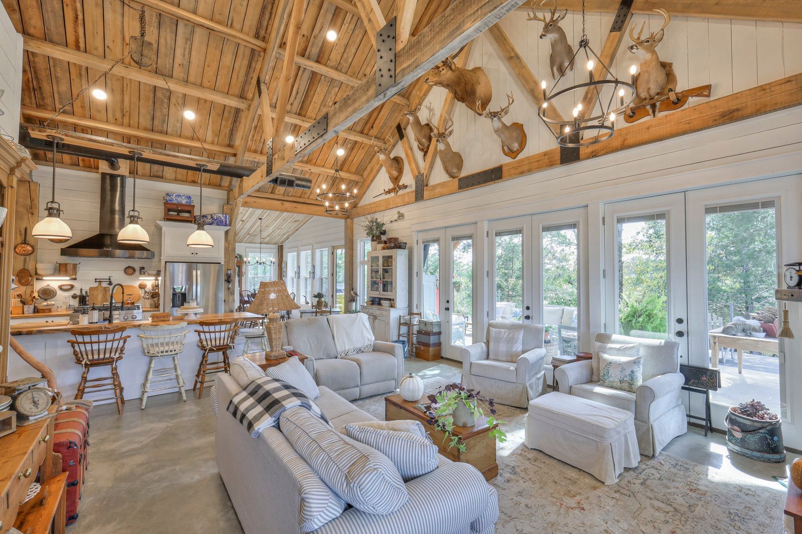 Dream Timber Frame Estate On 26 Acres with Amazing Creek Views! This designer timber frame estate blends privacy and rustic elegance with modern comforts, boasting 26 creek-front acres with stunning Sugar Creek views, and just minutes from town. 'Inside, discover open concept living with 10 ft shiplap, exposed beams,multi-zone heated concrete floors, and a gas fireplace, flowing to huge, covered porches. The chef`s kitchen features Z-Line appliances, live-edge oak counter tops, custom cabinets and a butler`s pantry. A main-floor primary suite offers beautiful farms views, exposed beams, and walk-in shower, while upstairs, a loft bunk room provides cozy retreat and storage. A large first floor second bedroom suite doubles as a family room. The property is a dream with 5-bay 40x60 barn, a 34x14 shop/storage with A/C, greenhouse, RV hookups, a finished studio/office additional building sites and income potential. This home is fully spray foam insulated with multi systems for ultimate comfort and efficiency, standing seam metal roof, and beautiful wood doors This Tennessee gem is an entertainer`s paradise and a tranquil escape, all within 60 miles of Nashville!