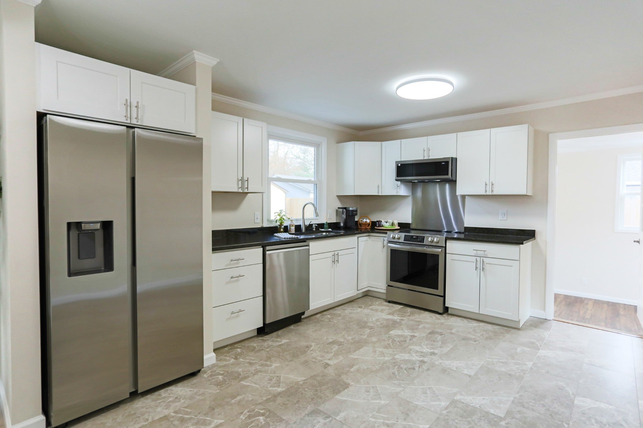 - Electric Range, Dishwasher, Disposal, Microwave, Refrigerator, Stainless Steel Appliance(s)