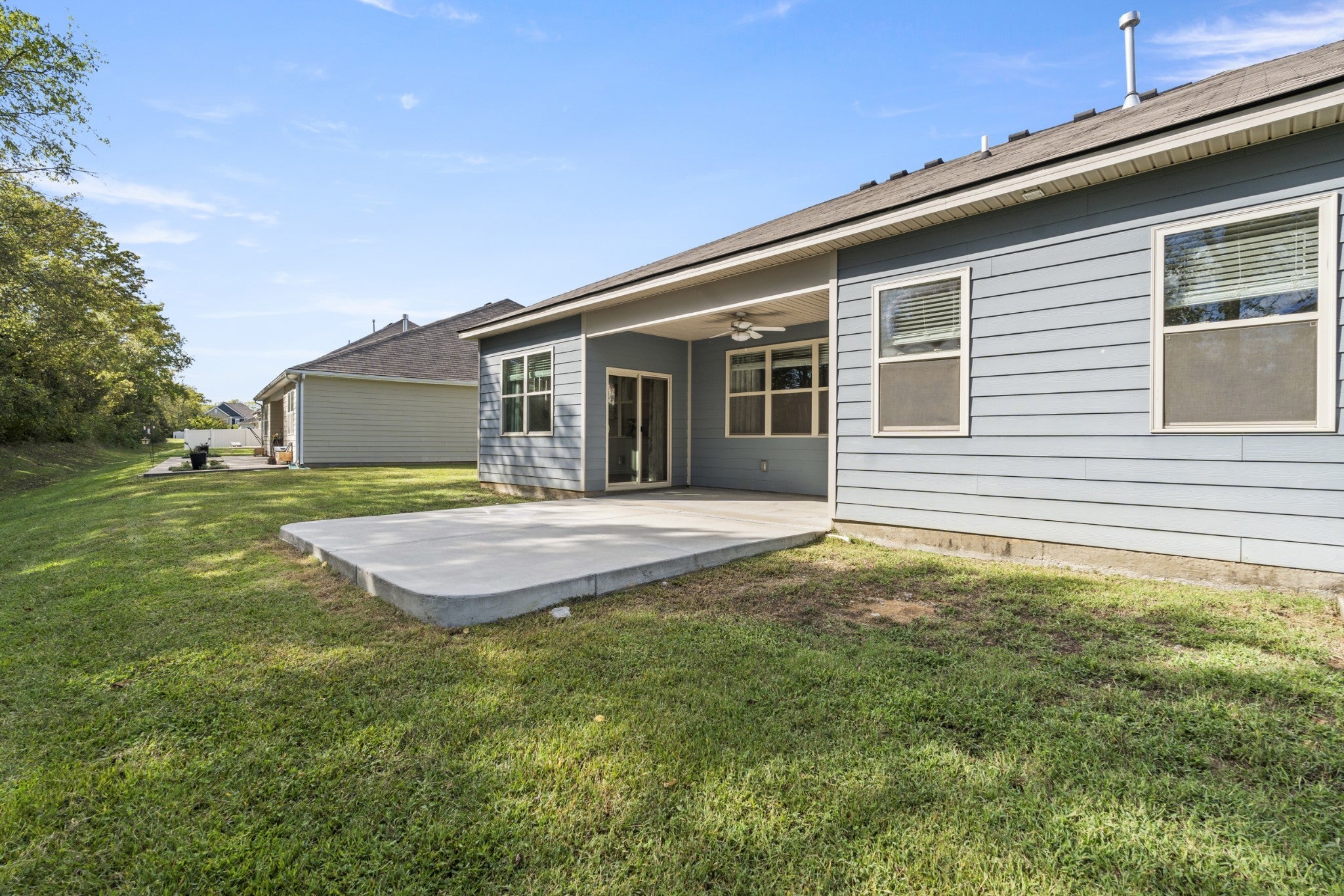 Come see this beautiful, rare opportunity of a single-level home in the Villages of Hunter's Point neighborhood. Nestled against the backdrop of trees, the back yard feels peaceful and private. Freshly painted and move in ready for the next owner. As you walk in through the entry, you enter into an open living room adjacent to the kitchen and dining space. The high ceilings make it feel even more open! With a large kitchen island, it is perfect for cooking and hosting. Walking outside, you are greeted with a newly extended covered patio and the peaceful back yard. The large primary suite has an ensuite bathroom with a walk in shower. Don't miss the two walk in closets! On the opposite side of the house, there are three spacious bedrooms and a bathroom. This home features plenty of storage space between all the closets and the two car garage. The sellers have improved the property by adding a new water softener and extending the back and front patio. They have loved this home and are so sad to leave! This home comes with transferable home warranty coverage until October 2028! The community has a beautiful resort style pool, picnic area, playground, and sidewalks! A short 5 minute drive to Lebanon's adorable downtown square with restaurants and shopping!