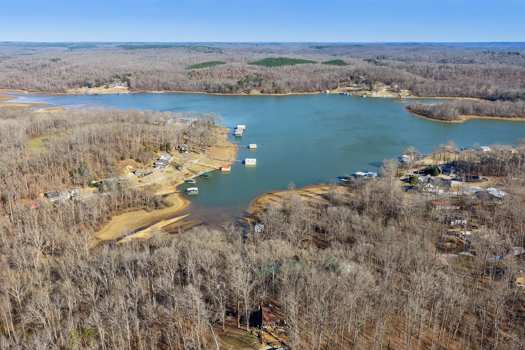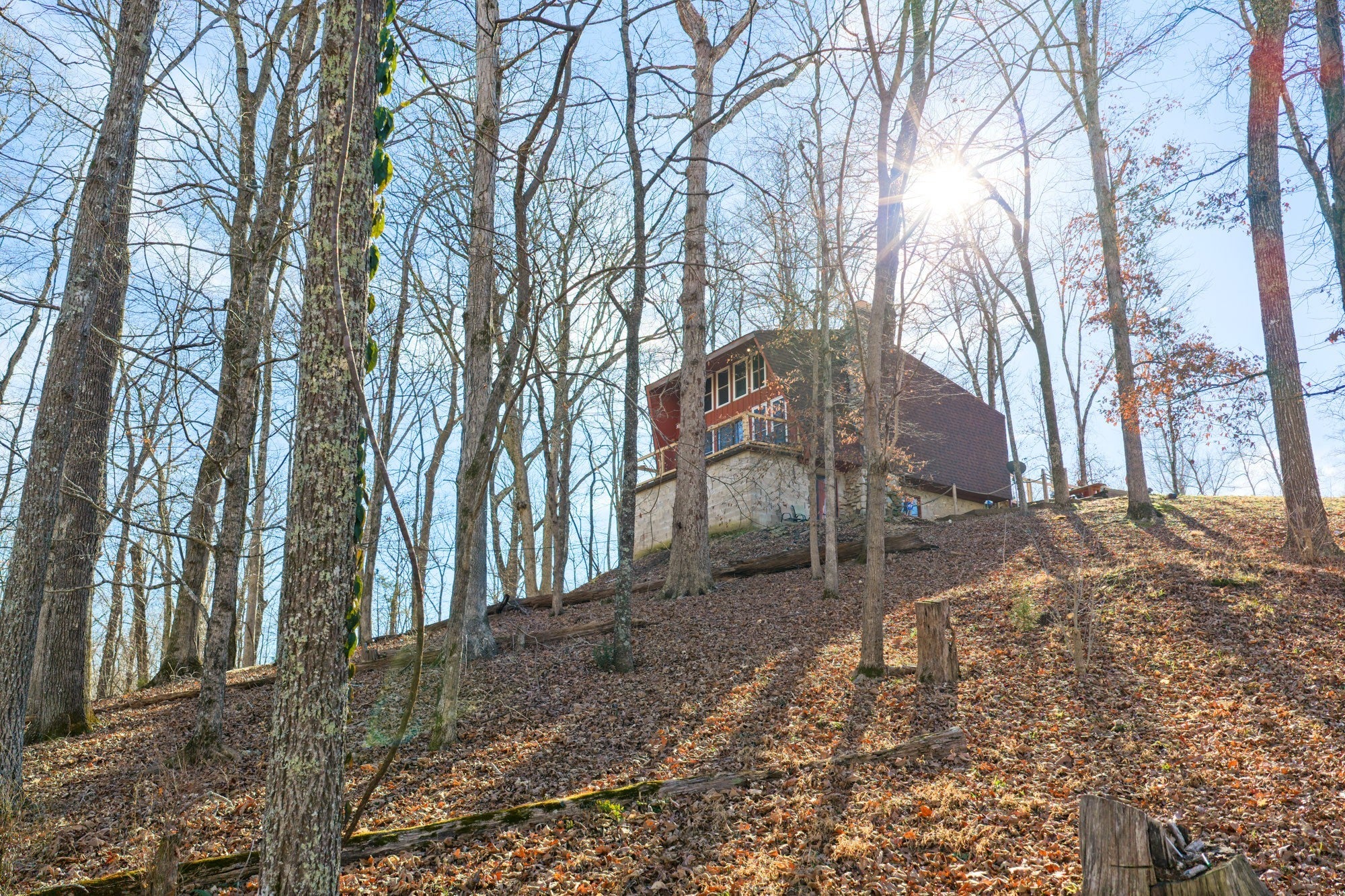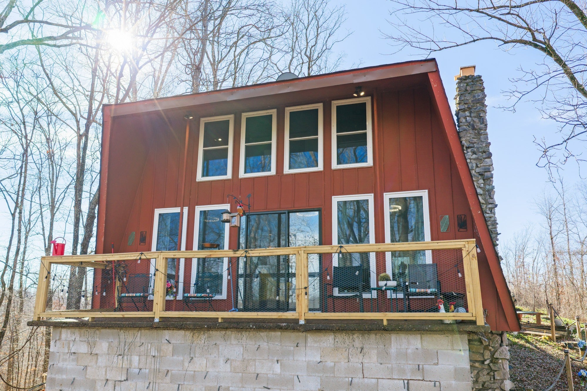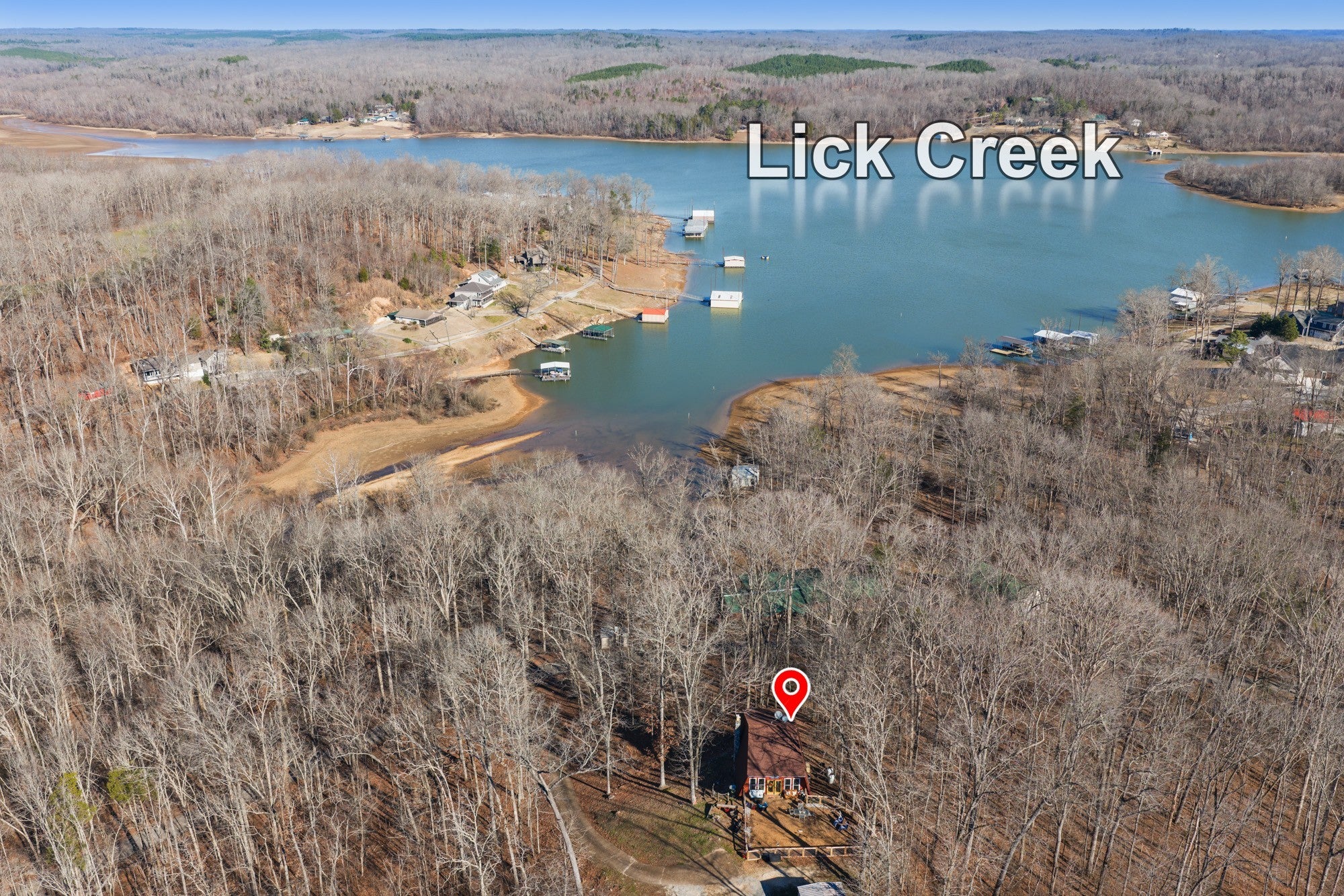 Come see this incredibly unique modified "A frame" home with a stunning view of the Tennessee River (Lick Creek). Enjoy relaxing lake views from large picture windows on both the main and second story levels. Lake front homes in this subdivision go for over a million dollars. There is a great fenced area for pets right off the main level. Two stone fireplaces. There are three bedrooms on the second level with the basement currently being used as a 4th bedroom which also has an ensuite. Sit on the balcony to sip coffee and watch the sunrise and enjoy the fire pit for cooler nights. This 3bd/3ba home is perfect as your forever home or an excellent second home with tons of rental potential as an Air B&B. Come enjoy the peace and quiet of lake living on a wooded lot that's easy to maintain. Public boat ramp at Brodies Landing is 1/2 mile away. Items of note for this stunning home: -New quarts countertops -All new windows -New flooring -New dishwasher and stove -New paint -New yard fencing -New deck on the front of the home ****** Motivated Seller*****