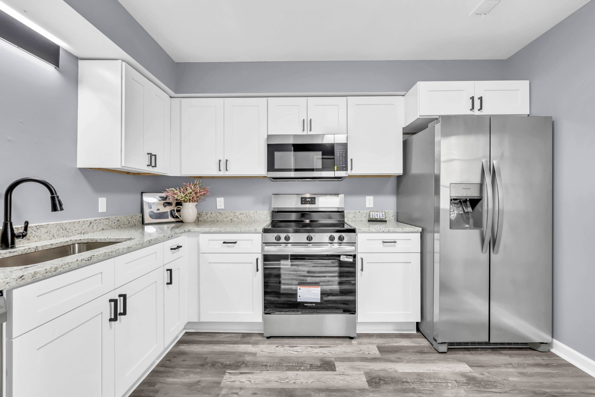 - Electric Range, Dishwasher, Ice Maker, Microwave, Refrigerator, Stainless Steel Appliance(s)