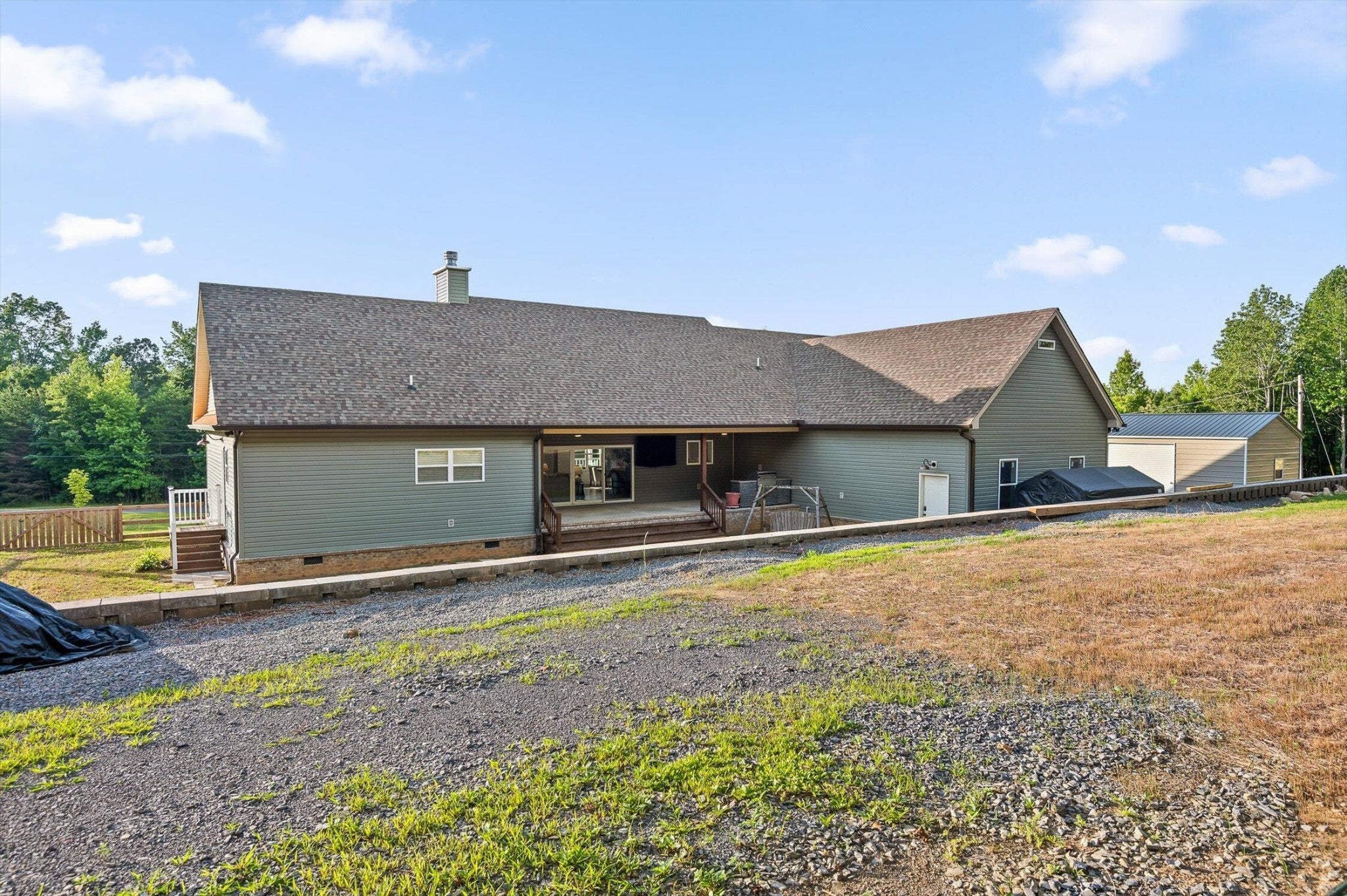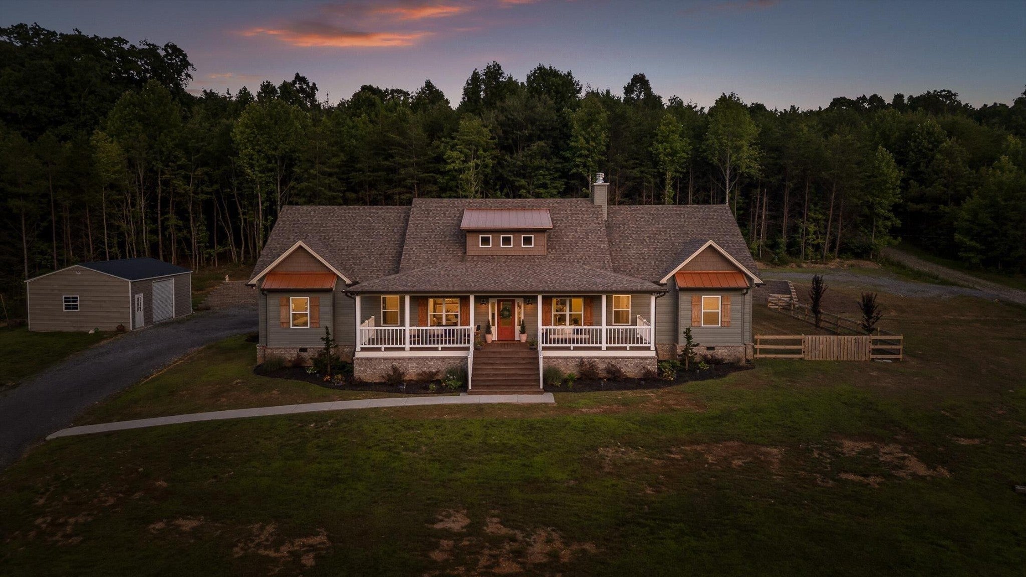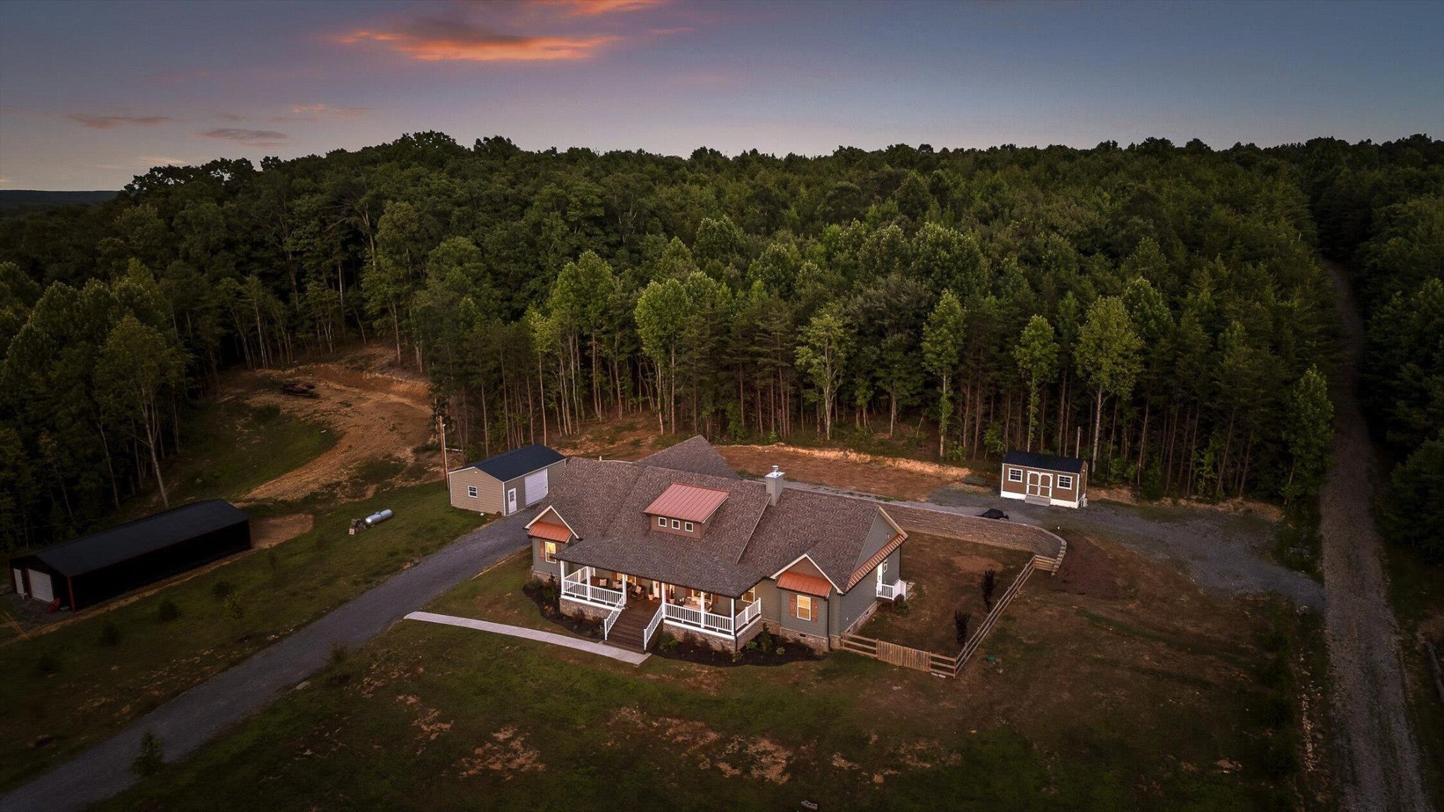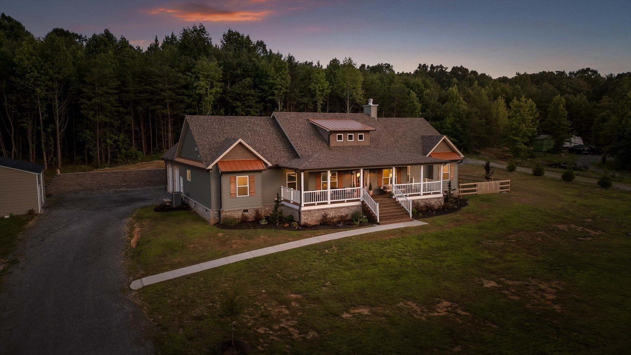 Privately positioned on just under four gently rolling, usable acres, this thoughtfully built custom home offers space, flexibility, and true freedom from HOA restrictions. The setting feels removed yet remains convenient to both Dunlap and Chattanooga, striking a rare balance between breathing room and accessibility. Nearly 3,000 square feet are arranged primarily on the main level, creating a layout well suited for both everyday living and long-term plans. Designed with intention, the split-bedroom floor plan allows privacy across multiple wings of the home. Two full primary suites sit on opposite sides, each featuring gas fireplaces, walk-in closets, and well-appointed ensuite baths with zero-curb tile showers for comfort and accessibility. A third main-level bedroom is located near a full hall bath, along with a separate half bath for guests. Upstairs, a private fourth bedroom with its own ensuite bath offers ideal separation for visitors, a home office, or live-in support without disrupting the main living areas. The heart of the home features vaulted ceilings, abundant natural light, and an open-concept living space anchored by a well-designed kitchen with farmhouse sink, gas range with pot filler, custom vent hood, and a large island with seating. The kitchen flows seamlessly into the dining and living areas, framed by expansive windows overlooking the backyard. Just outside, a covered patio with gas grill line extends the living space and was intentionally planned with future courtyard or pool potential. Outdoors, approximately two acres are cleared and usable, complemented by additional wooded acreage for privacy. The wraparound front porch creates a welcoming approach, while the encapsulated crawl space adds peace of mind. An oversized two-car garage supports daily needs, and a 550+ sq ft metal outbuilding with roll-up and man door access provides excellent space for hobbies, equipment, or workshop use.