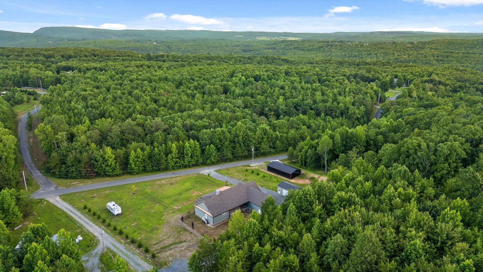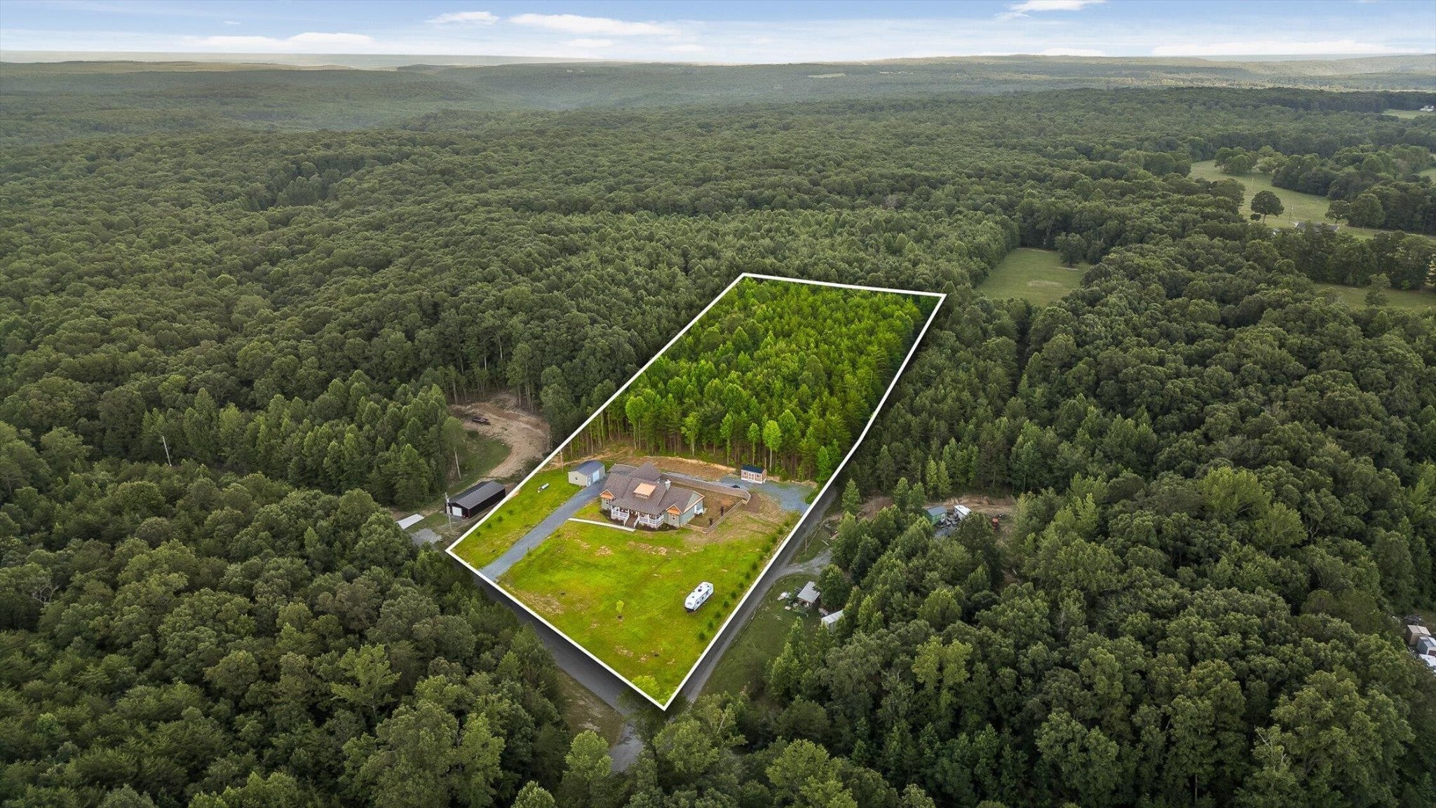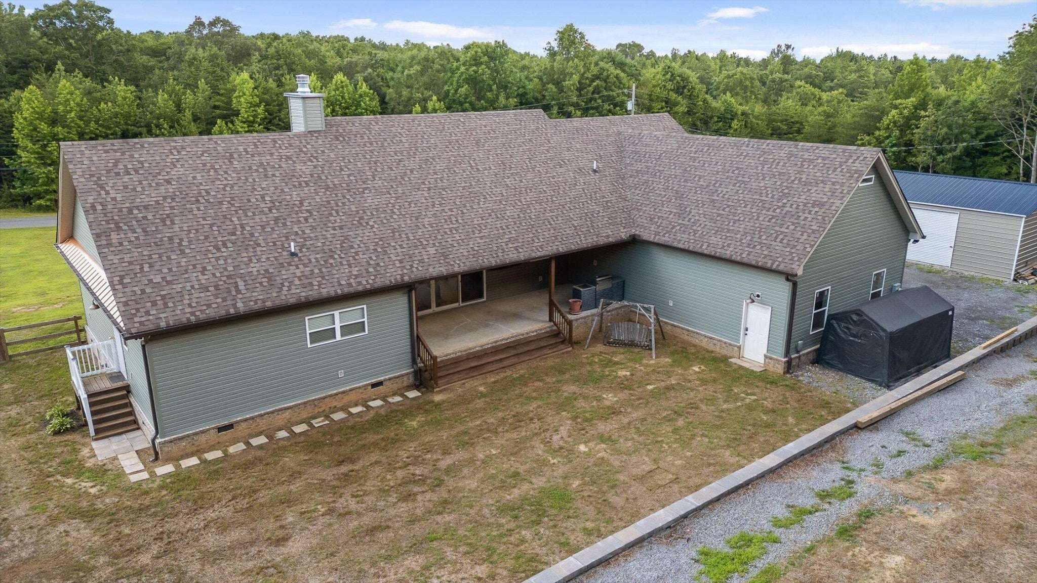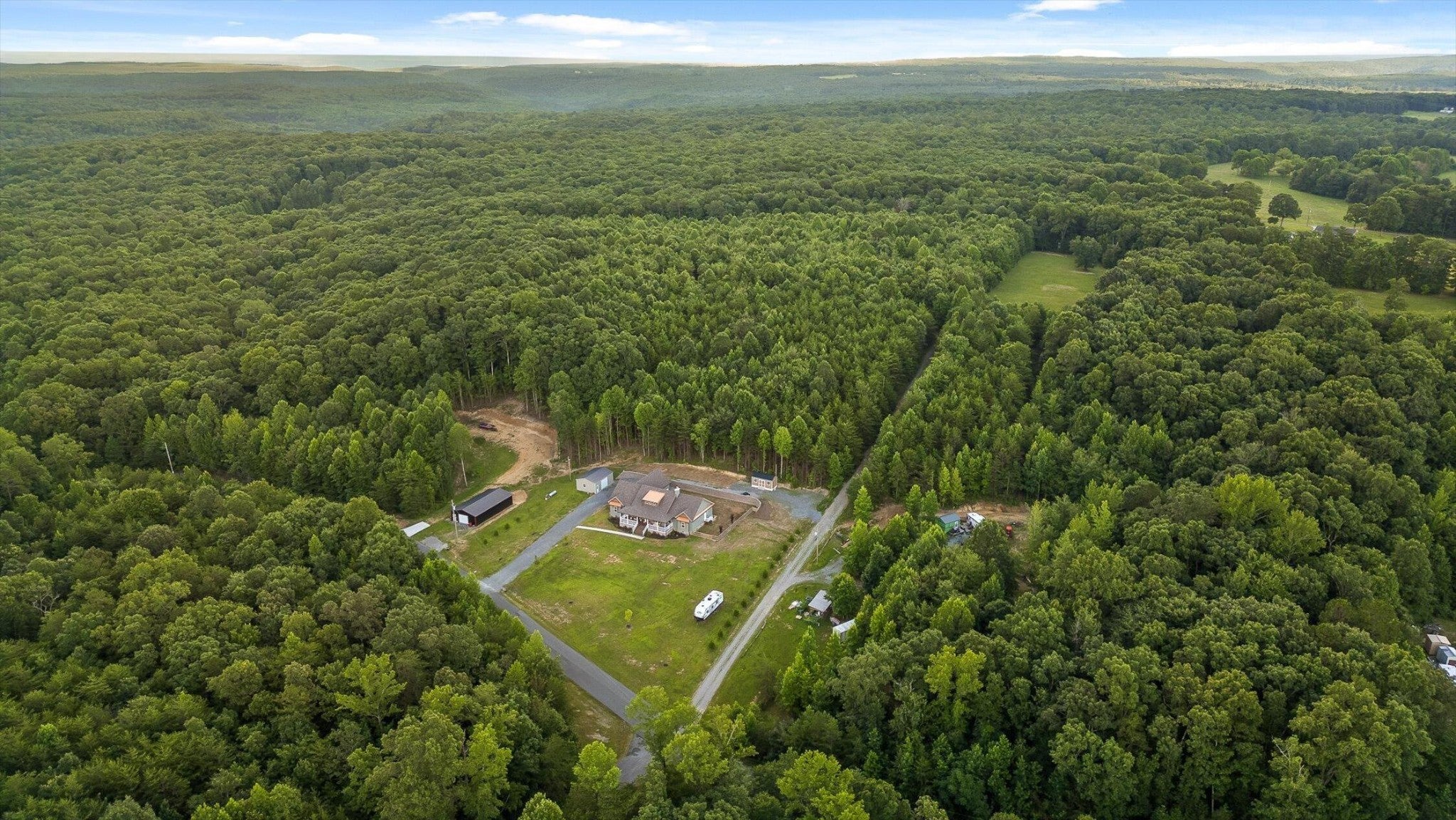 Privately positioned on just under four gently rolling, usable acres, this thoughtfully built custom home offers space, flexibility, and true freedom from HOA restrictions. The setting feels removed yet remains convenient to both Dunlap and Chattanooga, striking a rare balance between breathing room and accessibility. Nearly 3,000 square feet are arranged primarily on the main level, creating a layout well suited for both everyday living and long-term plans. Designed with intention, the split-bedroom floor plan allows privacy across multiple wings of the home. Two full primary suites sit on opposite sides, each featuring gas fireplaces, walk-in closets, and well-appointed ensuite baths with zero-curb tile showers for comfort and accessibility. A third main-level bedroom is located near a full hall bath, along with a separate half bath for guests. Upstairs, a private fourth bedroom with its own ensuite bath offers ideal separation for visitors, a home office, or live-in support without disrupting the main living areas. The heart of the home features vaulted ceilings, abundant natural light, and an open-concept living space anchored by a well-designed kitchen with farmhouse sink, gas range with pot filler, custom vent hood, and a large island with seating. The kitchen flows seamlessly into the dining and living areas, framed by expansive windows overlooking the backyard. Just outside, a covered patio with gas grill line extends the living space and was intentionally planned with future courtyard or pool potential. Outdoors, approximately two acres are cleared and usable, complemented by additional wooded acreage for privacy. The wraparound front porch creates a welcoming approach, while the encapsulated crawl space adds peace of mind. An oversized two-car garage supports daily needs, and a 550+ sq ft metal outbuilding with roll-up and man door access provides excellent space for hobbies, equipment, or workshop use.