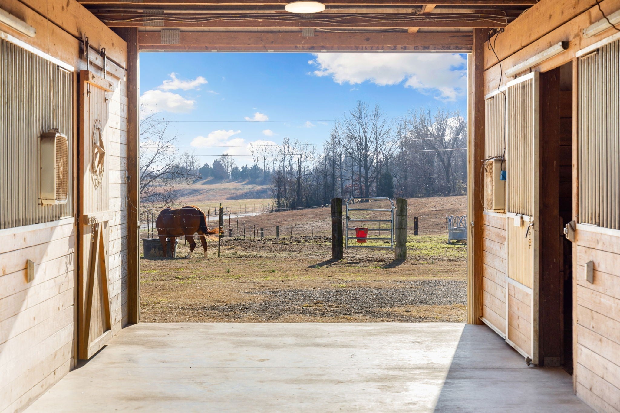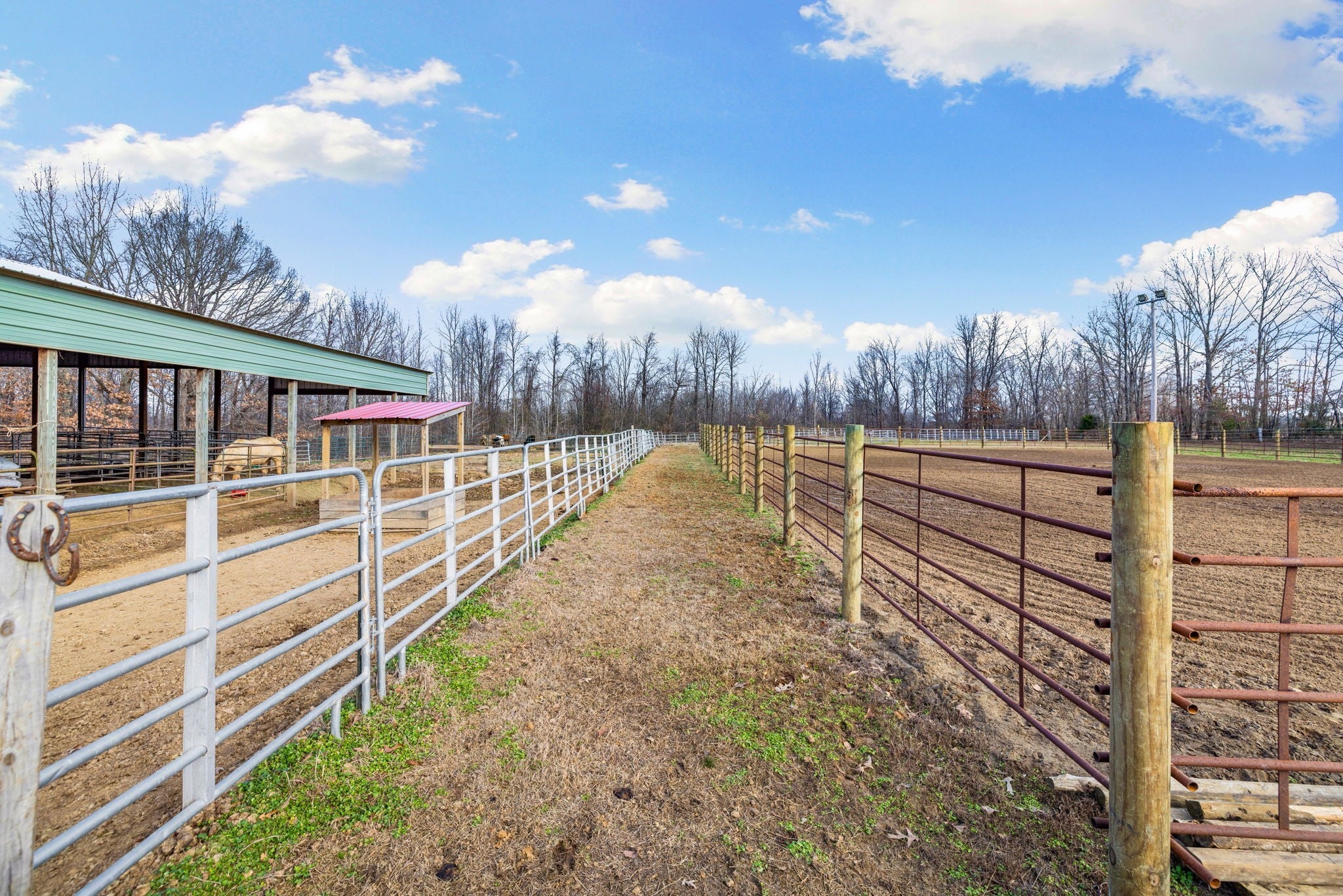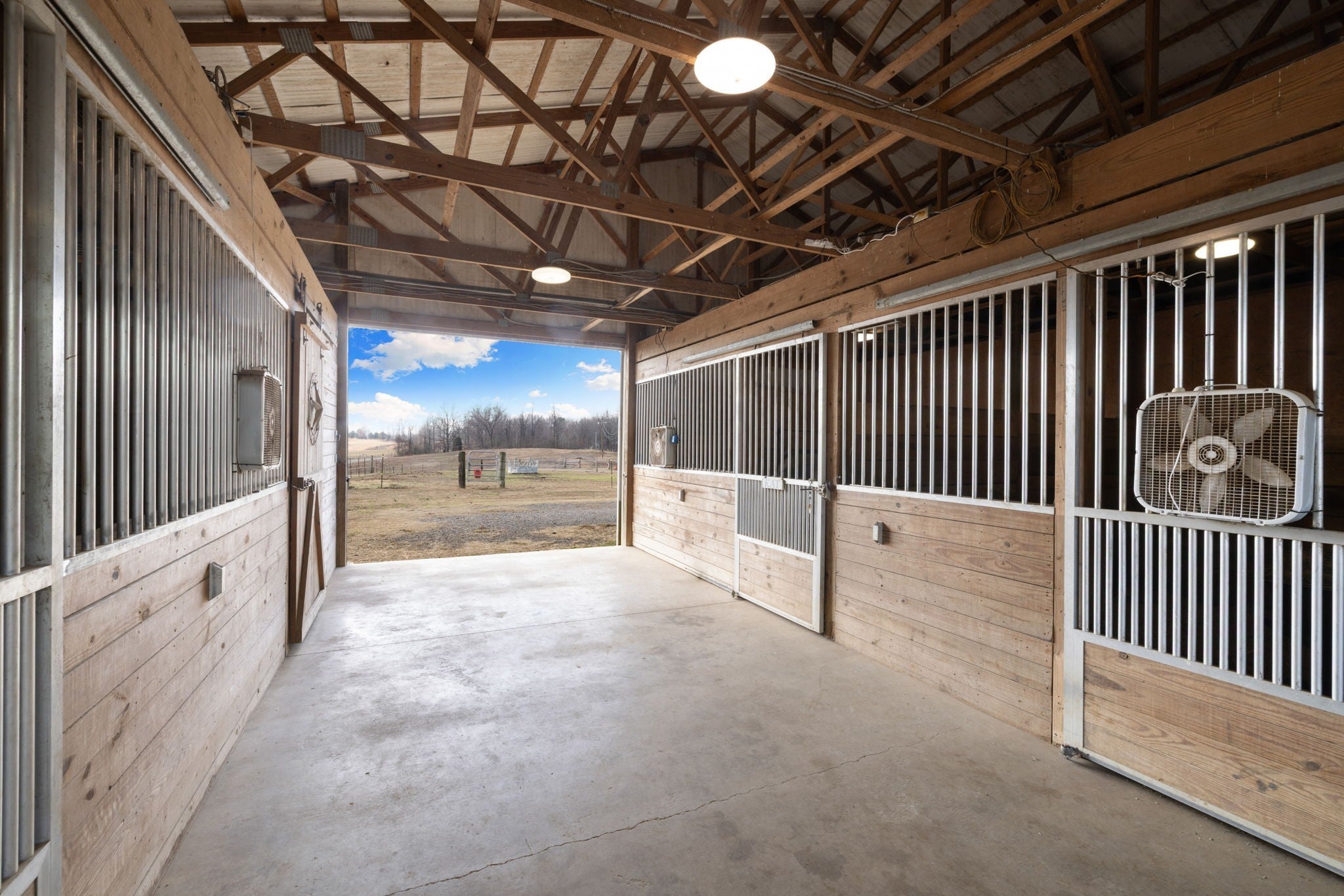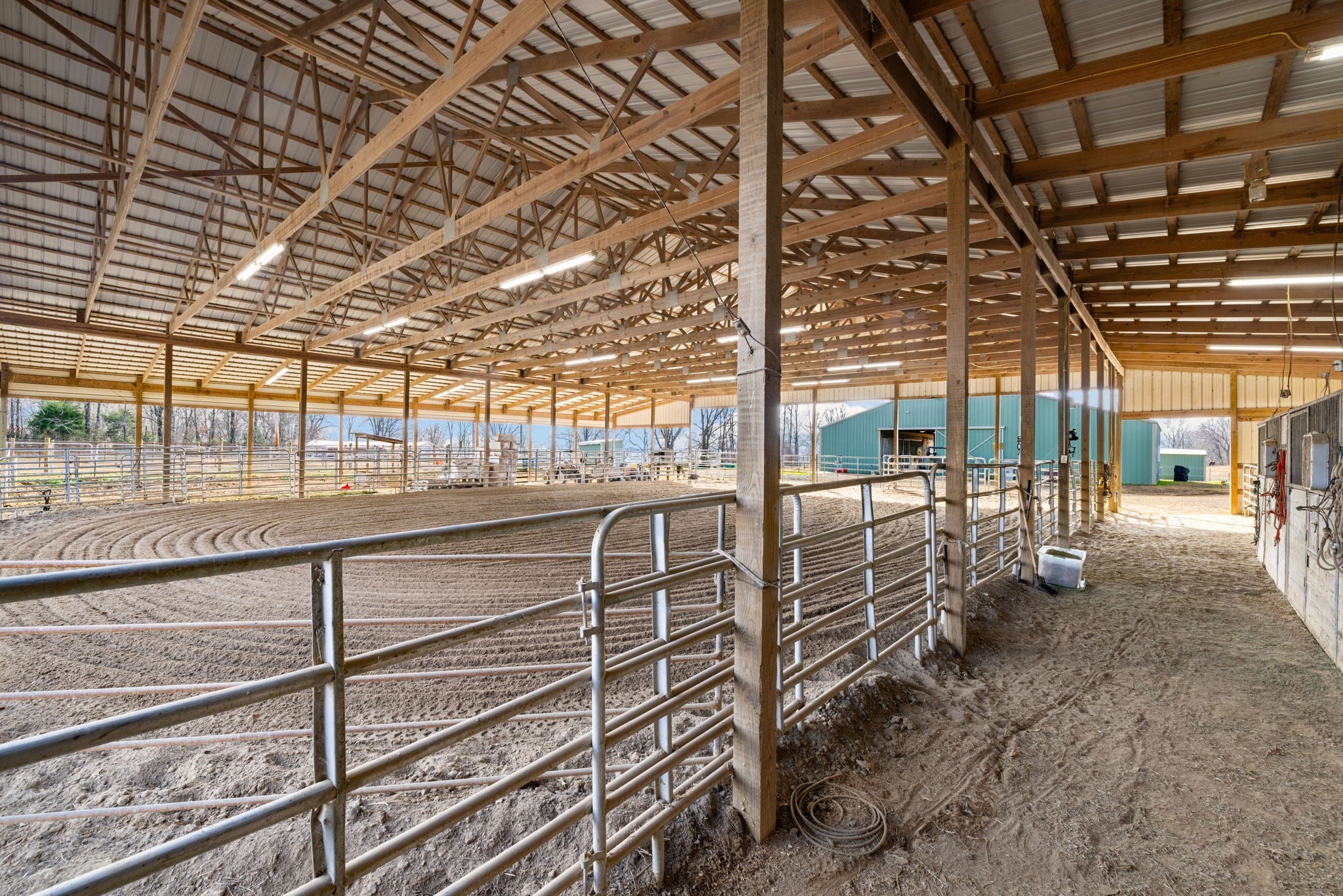 Turnkey 46-acre horse farm offering a complete, well-designed training facility. Improvements include a 60x80 covered arena with lights, sand footing, and two 20-ft side sheds, plus a separate outdoor arena. Eight total stalls—4 located off the covered arena and 4 inside the main barn, including three oversized 14x14 stalls ideal for foaling or studs and one 8x10 stall. Custom Armour Horse Stalls fronts with automatic watering system utilizing PEX piping, along with a dedicated feed room and tack room. Additional features include a six-horse walker, 30x50 hay barn, six run-in sheds, and frost-free hydrants to each pasture. Multiple fenced pastures provide excellent turnout. Attached to the barn is a comfortable barndominium with 1 bedroom, 1.5 baths, full kitchen, and laundry. New water well system installed in 2024. Ample room for future stall expansion within the covered arena, plus a separate potential building site already equipped with septic, water, and electric. Gated entrance. Move-in ready and built for year-round equestrian use.
