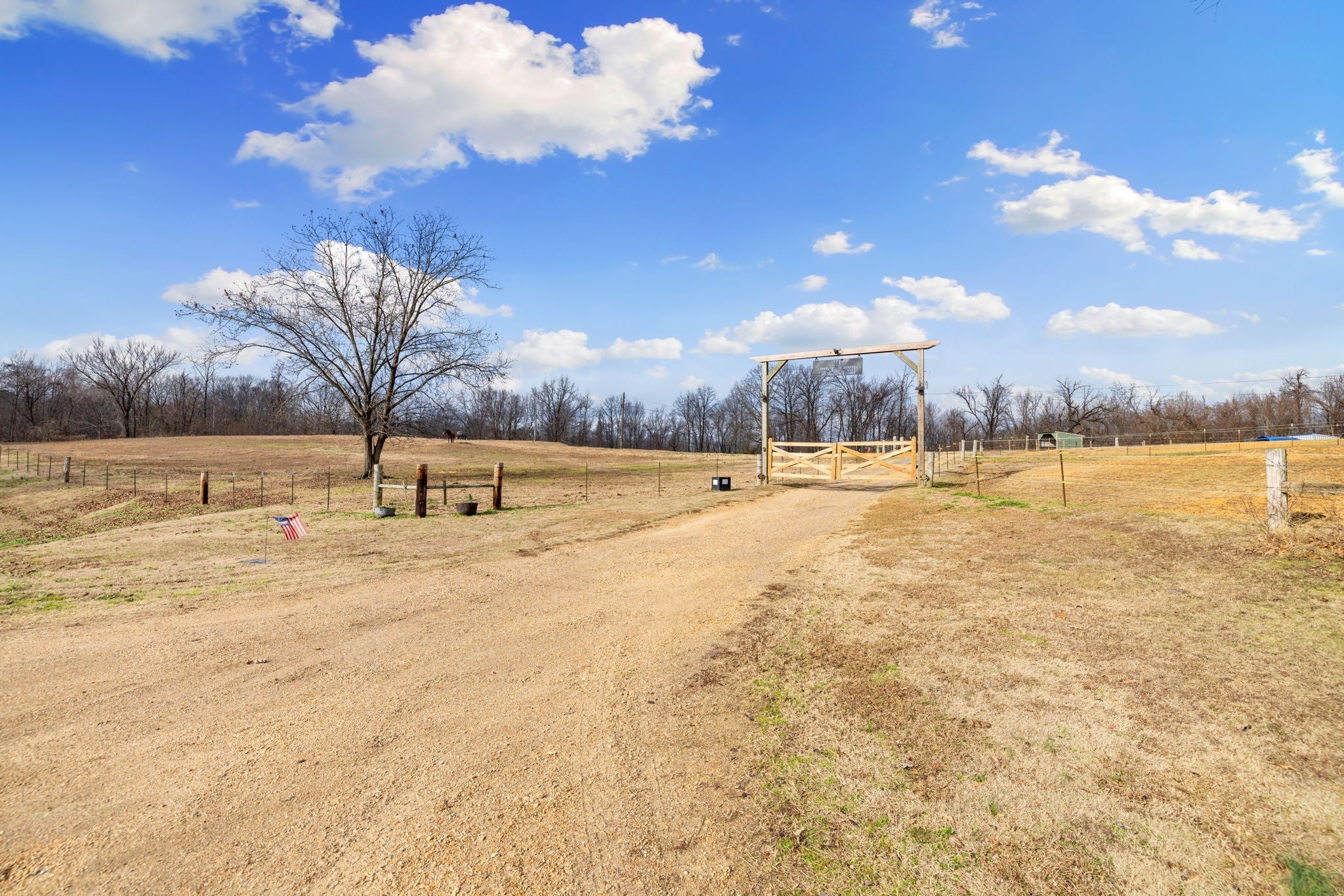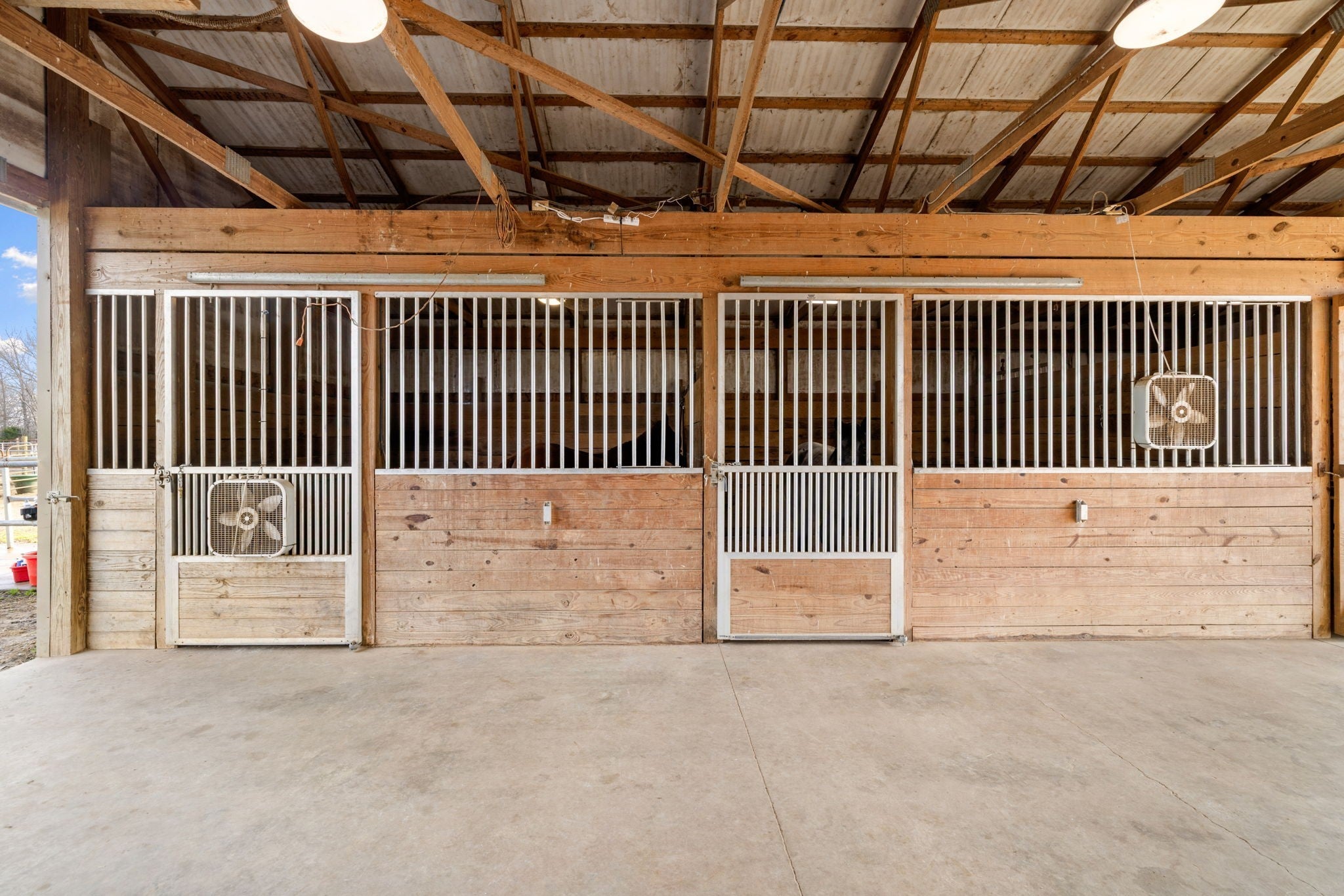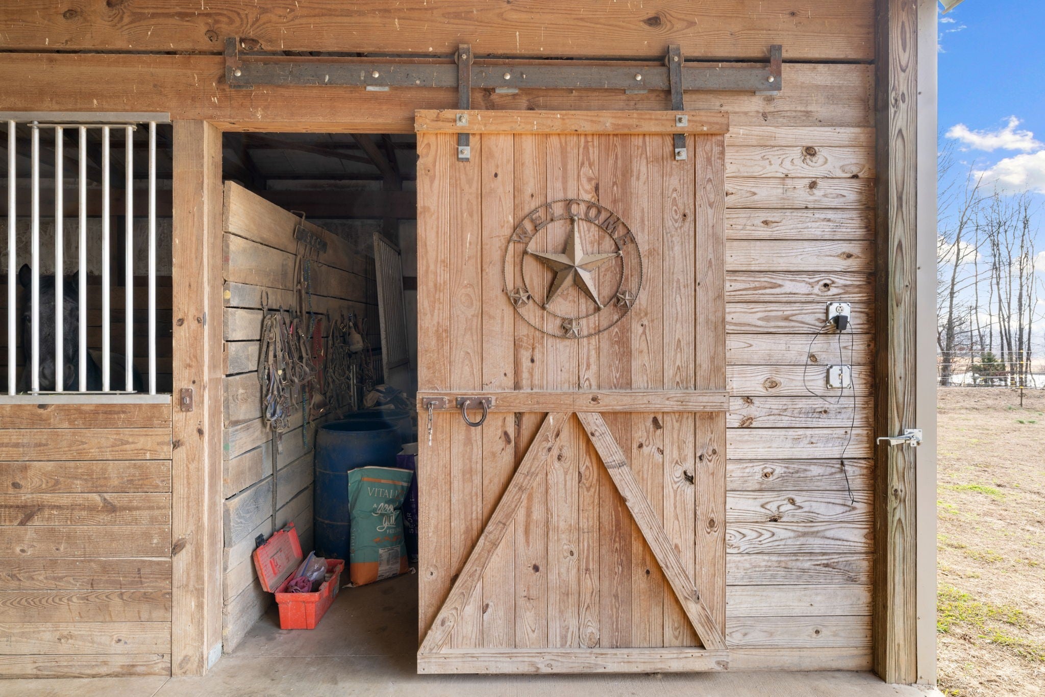 Turnkey 46-acre horse farm offering a complete, well-designed training facility. Improvements include a 60x80 covered arena with lights, sand footing, and two 20-ft side sheds, plus a separate outdoor arena. Eight total stalls—4 located off the covered arena and 4 inside the main barn, including three oversized 14x14 stalls ideal for foaling or studs and one 8x10 stall. Custom Armour Horse Stalls fronts with automatic watering system utilizing PEX piping, along with a dedicated feed room and tack room. Additional features include a six-horse walker, 30x50 hay barn, six run-in sheds, and frost-free hydrants to each pasture. Multiple fenced pastures provide excellent turnout. Attached to the barn is a comfortable barndominium with 1 bedroom, 1.5 baths, full kitchen, and laundry. New water well system installed in 2024. Ample room for future stall expansion within the covered arena, plus a separate potential building site already equipped with septic, water, and electric. Gated entrance. Move-in ready and built for year-round equestrian use.