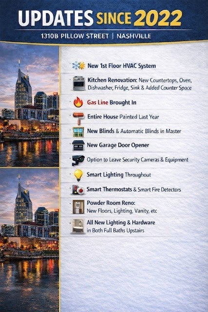 Your opportunity to own in one of Nashville's most vibrant and walkable neighborhoods! This beautifully updated 3-bedroom home in Wedgewood Houston puts you steps from local restaurants, coffee shops, and the energy of one of Music City's hottest communities. Enjoy the perfect blend of urban convenience and modern luxury living. Extensive updates since 2022 include: new 1st floor HVAC system, completely renovated kitchen with new countertops, oven, dishwasher, fridge, sink and added counter space, gas line brought in, entire house painted, new blinds with automatic blinds in master, new garage door opener, smart lighting throughout, The powder room received a full renovation with new floors, lighting, and vanity, while both full baths upstairs feature all new lighting and hardware. Optional to leave security cameras and equipment. The open floor plan showcases a gourmet kitchen with stainless appliances and granite countertops. Relax in the fenced backyard and deck. This is modern Nashville living at its finest - walkability meets luxury in Wedgewood Houston!