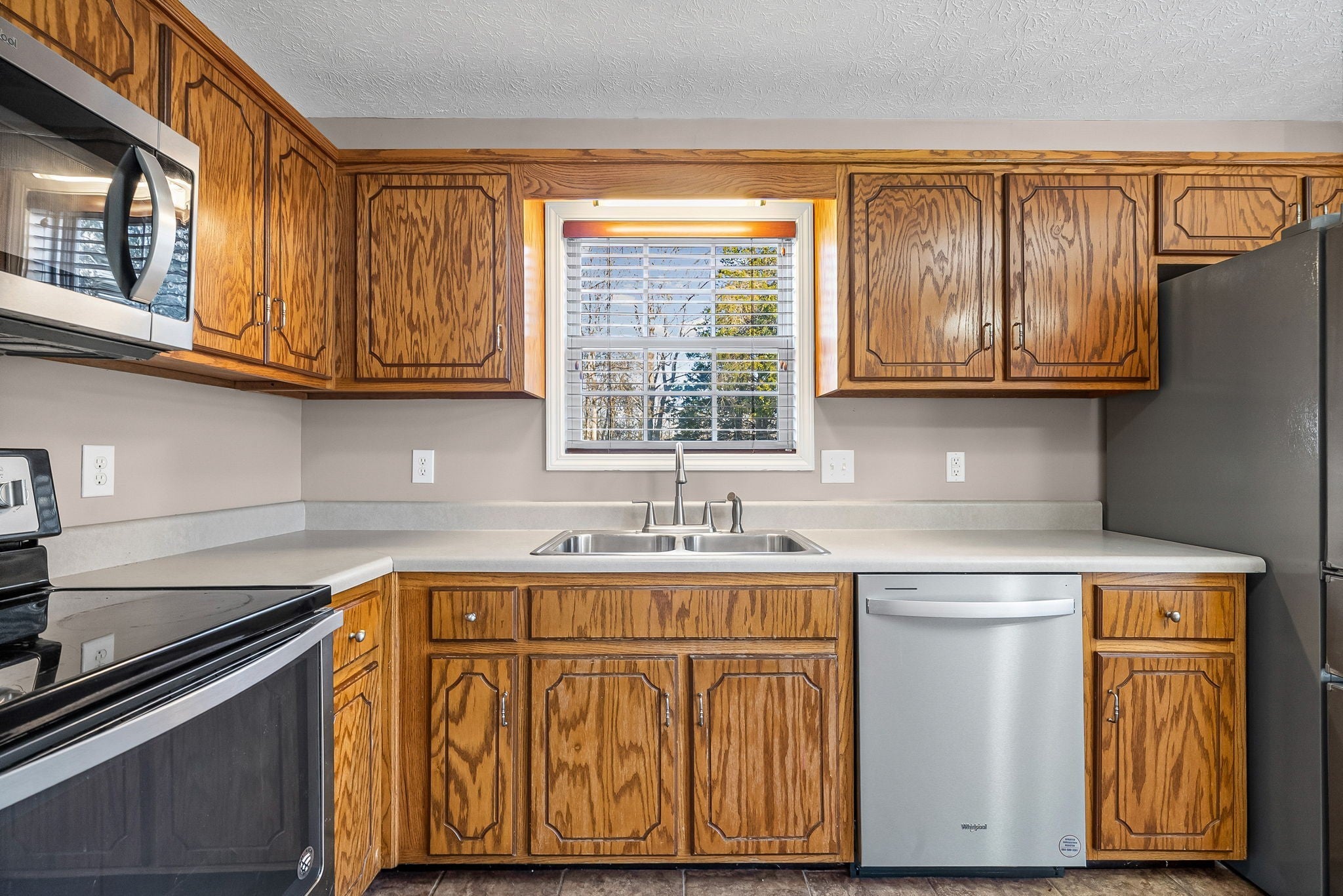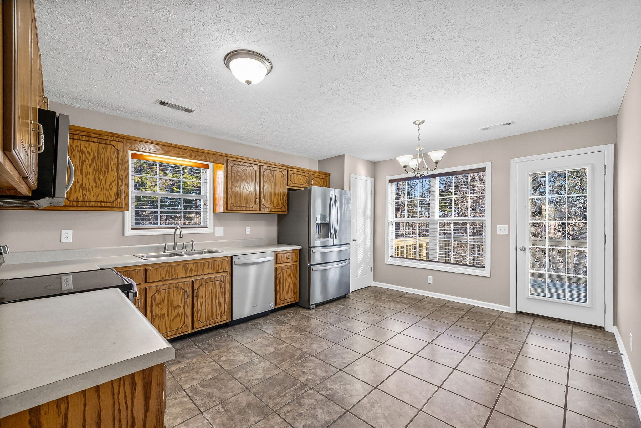 - Oven, Dishwasher, Microwave, Refrigerator, Stainless Steel Appliance(s)