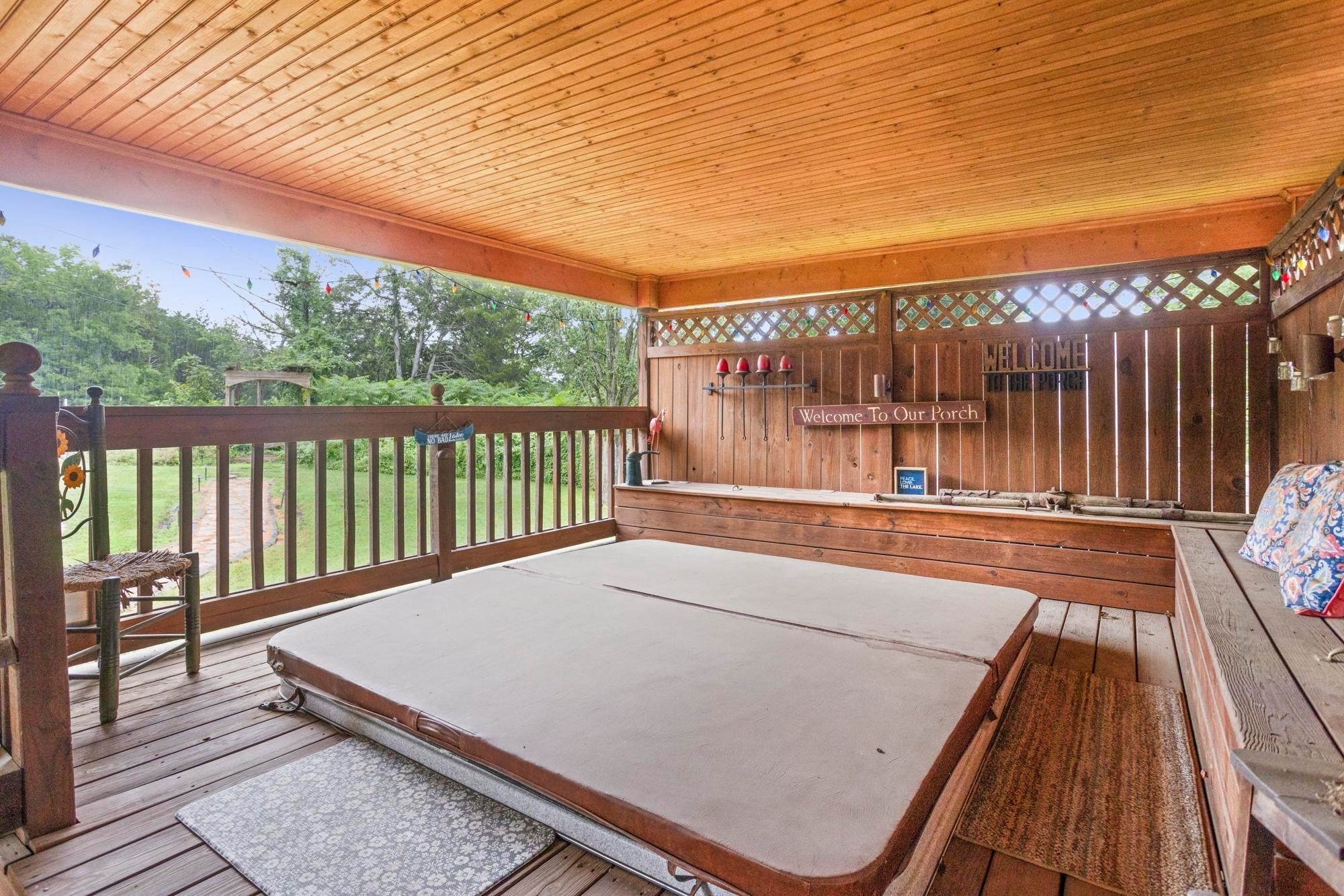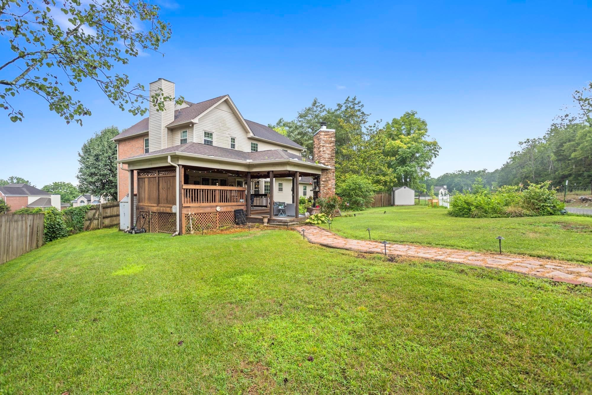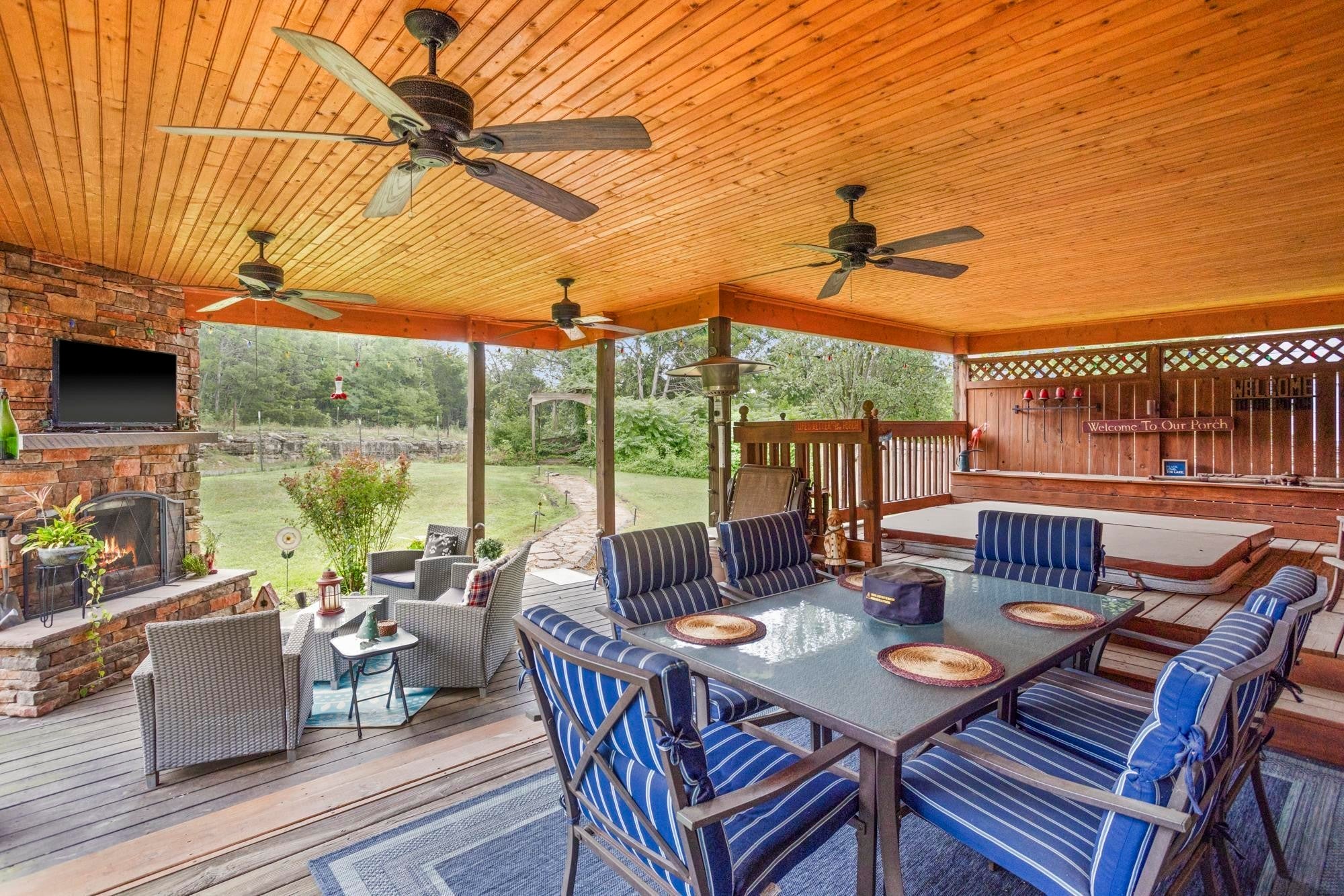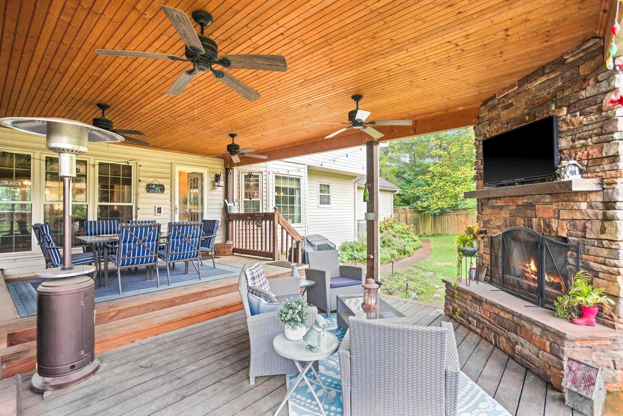 Private retreat located on a quiet cul-de-sac with an expansive covered deck featuring a stone fireplace, hot tub, and complete privacy. Interior highlights include a kitchen with granite countertops and stainless steel appliances, an oversized family room, and a spacious primary suite with walk-in closet, soaking tub, and heated tile floors. Oversized attached garage with additional storage plus two backyard sheds.