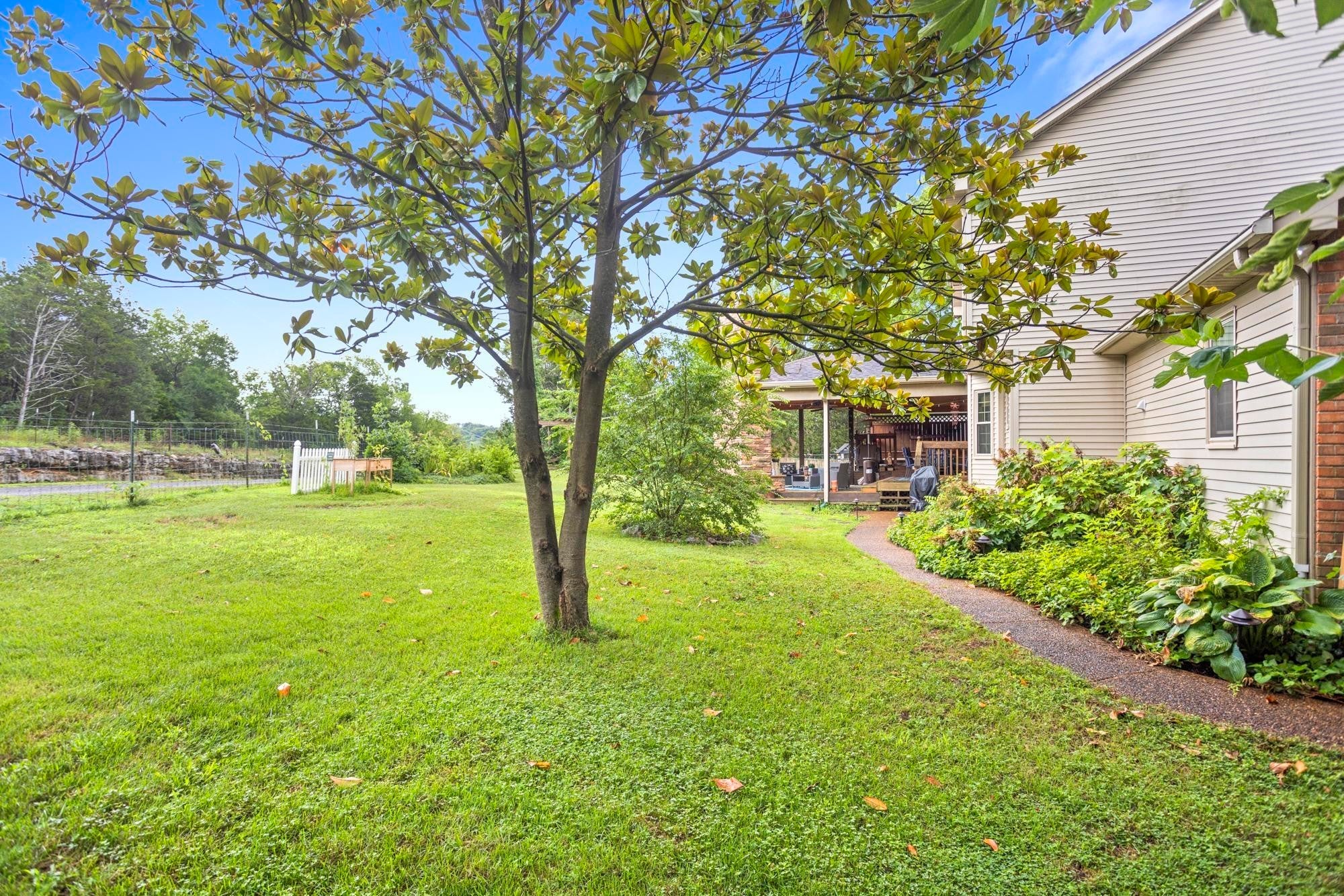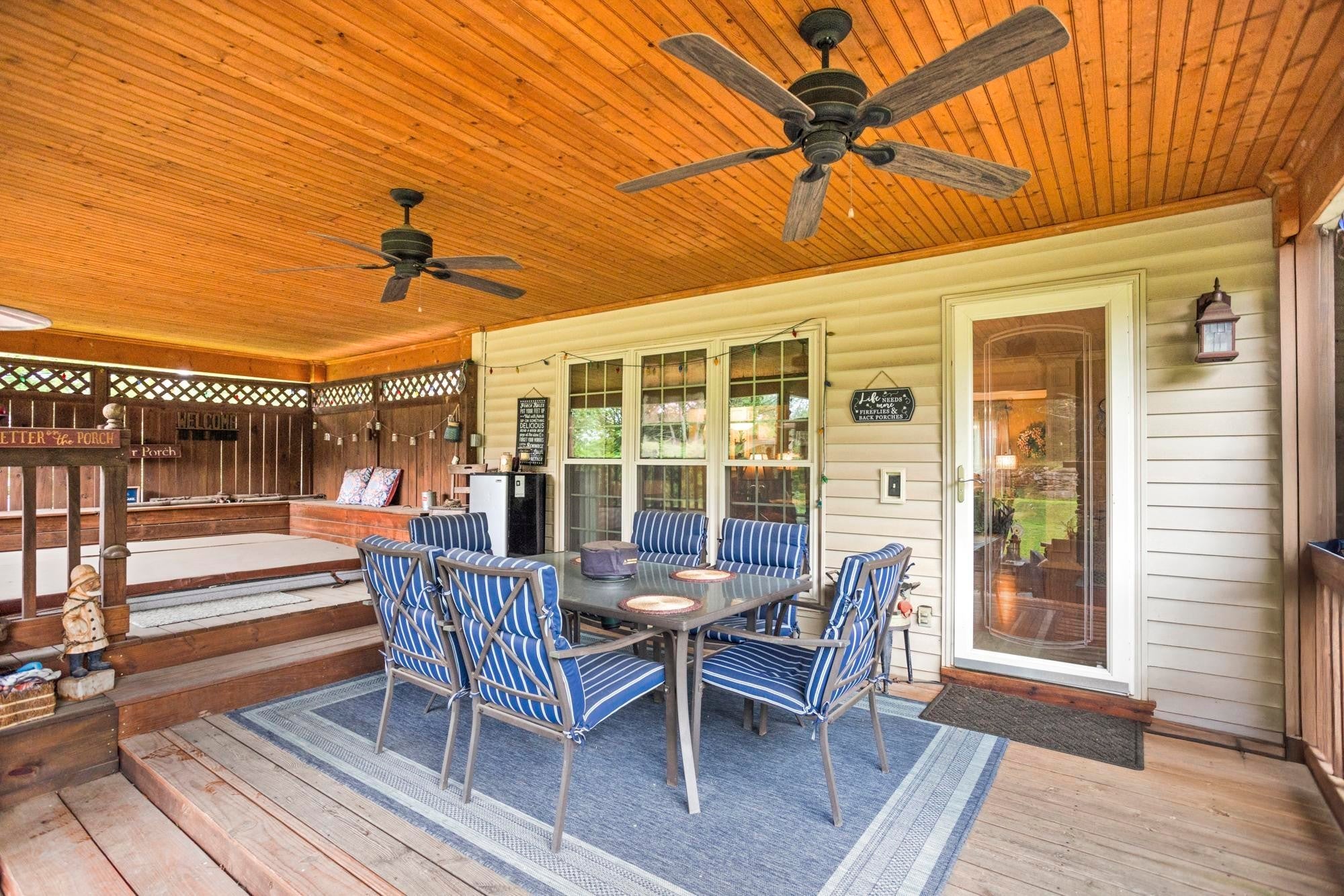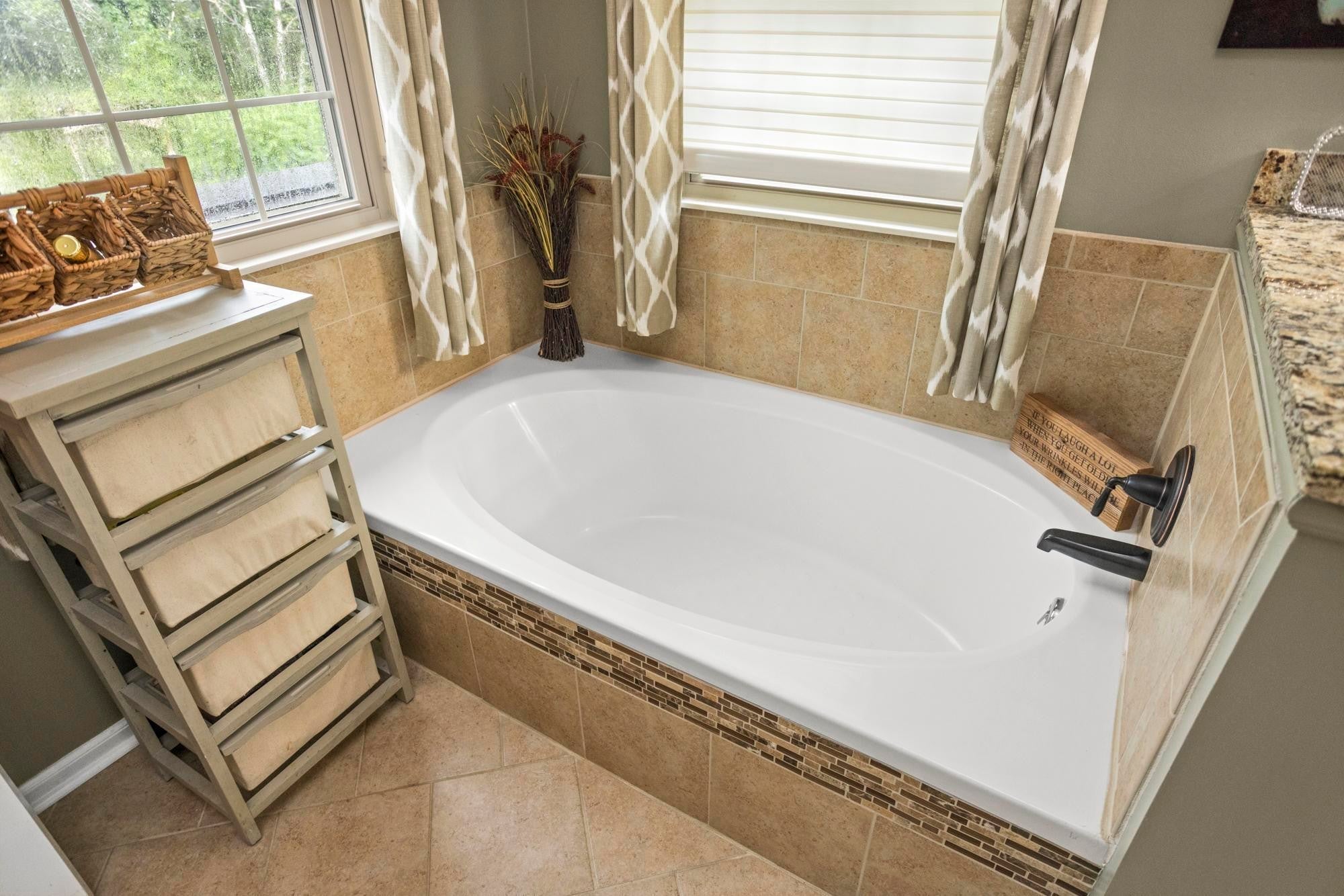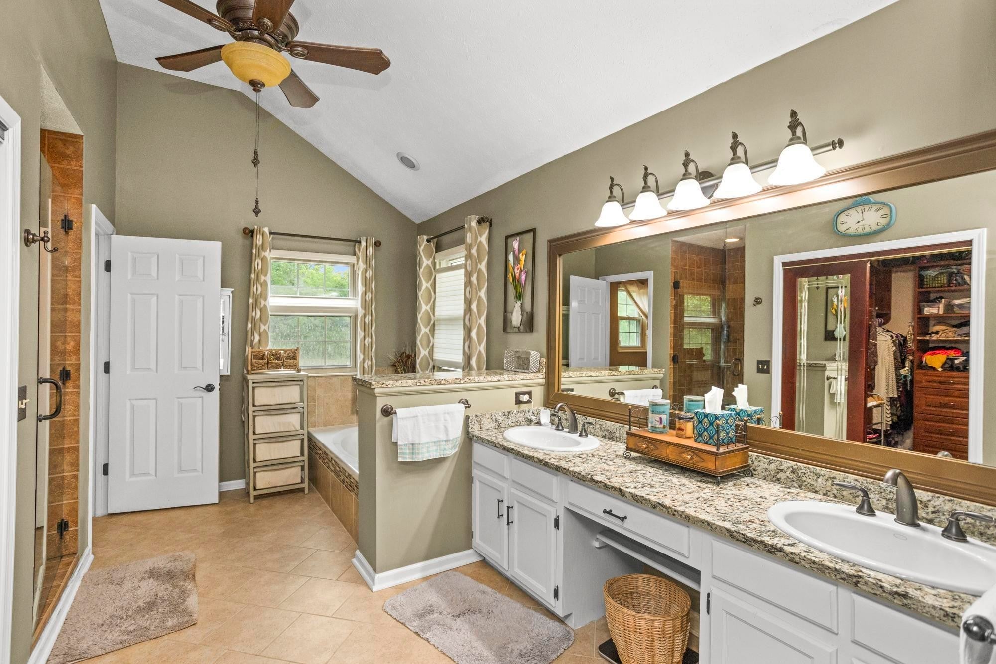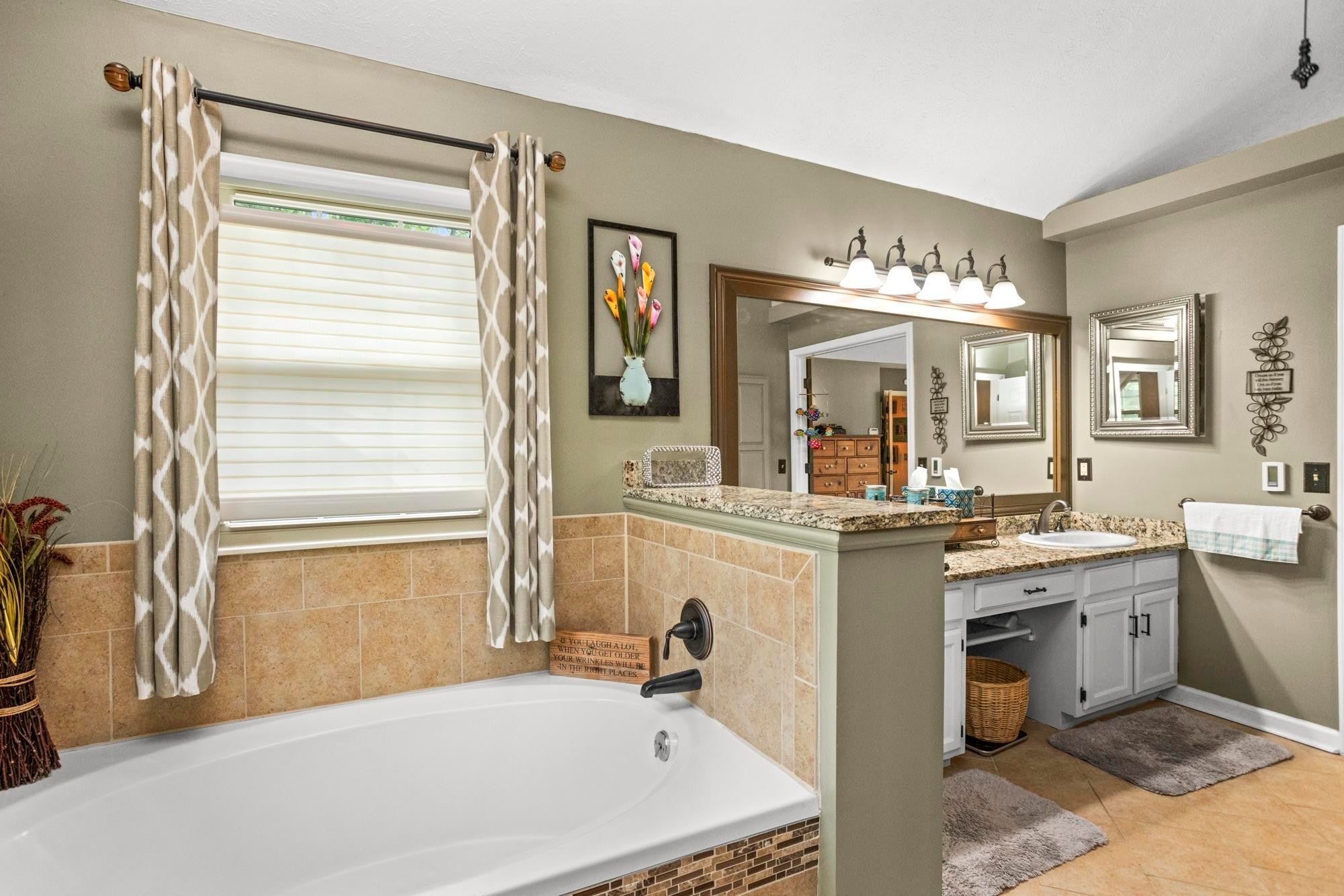 Private retreat located on a quiet cul-de-sac with an expansive covered deck featuring a stone fireplace, hot tub, and complete privacy. Interior highlights include a kitchen with granite countertops and stainless steel appliances, an oversized family room, and a spacious primary suite with walk-in closet, soaking tub, and heated tile floors. Oversized attached garage with additional storage plus two backyard sheds.